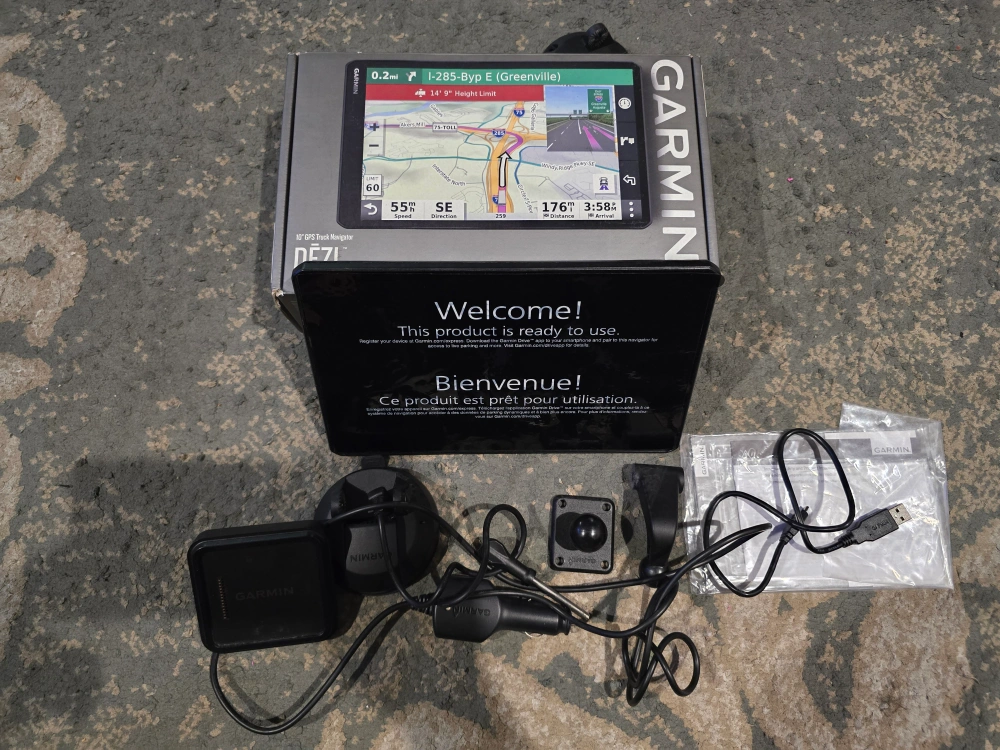 Selling a Garmin dezl OTR1000 GPS truck navigator in like-new condition! It comes with the box and all original components and accessories. This navigator is designed specifically for truckers, offering features like customized routing based on truck size and weight, and alerts for bridge heights and weight limits. A great device for any professional driver! Features: 10" Touchscreen Display: Bright, high-resolution screen with portrait and landscape view options. Custom Truck Routing: Route options tailored to the size and weight of your truck (not available in all areas). Load-to-Dock Guidance: Industry-leading guidance showing potential loading zones as you approach your destination. Road Warnings: Alerts for bridge heights, weight limits, sharp curves, steep grades, and more to help navigate safely. Truck & Trailer Services Directory: Filter truck stops by brand or amenities along your route. Mounting Options: Includes powered magnetic mount with heavy-duty suction cup, screw-down mount, and 1” ball adapter with AMPS plate. Voice Assistant Integration: Talk to the dēzl navigator while keeping hands on the wheel for safer driving. Works with Garmin eLog: Supports subscription-free Hours of Service recording with no smartphone or tablet needed. Popular Truck Routes: See and use routes that other truckers rely on for greater situational awareness. Bluetooth & USB Connectivity: Easily connect to other devices and accessories. Durable Design: Built to withstand harsh driving conditions. Product Description: The Garmin dēzl OTR1000 is the ultimate truck GPS navigator for drivers looking for a clear, easy-to-use device on the road. With a massive 10-inch touchscreen, it provides an easy view of routes and critical data, available in both landscape and portrait orientations. The device offers custom truck routing, designed to fit the size and weight of your rig (note: this service is not available in all areas). Stay safe with road warnings that inform you of bridge heights, sharp curves, steep grades, and more. Additionally, load-to-dock guidance helps you find potential loading zones as you approach your destination. This device also includes a Truck & Trailer Services directory, helping you filter truck stops by brand and amenities like showers and fuel. The voice assistant lets you control the navigator without taking your hands off the wheel, ensuring a safer driving experience. For increased flexibility, the dēzl OTR1000 comes with several mounting options, including a powered magnetic mount, screw-down mount, and 1-inch ball adapter compatible with RAM systems. With Bluetooth and USB connectivity, you can easily pair the device with accessories like the Garmin eLog system (sold separately) for Hours of Service recording. Whether you're navigating new areas or following popular truck routes, the Garmin dēzl OTR1000 is the ideal solution to help you reach your destination safely and efficiently.