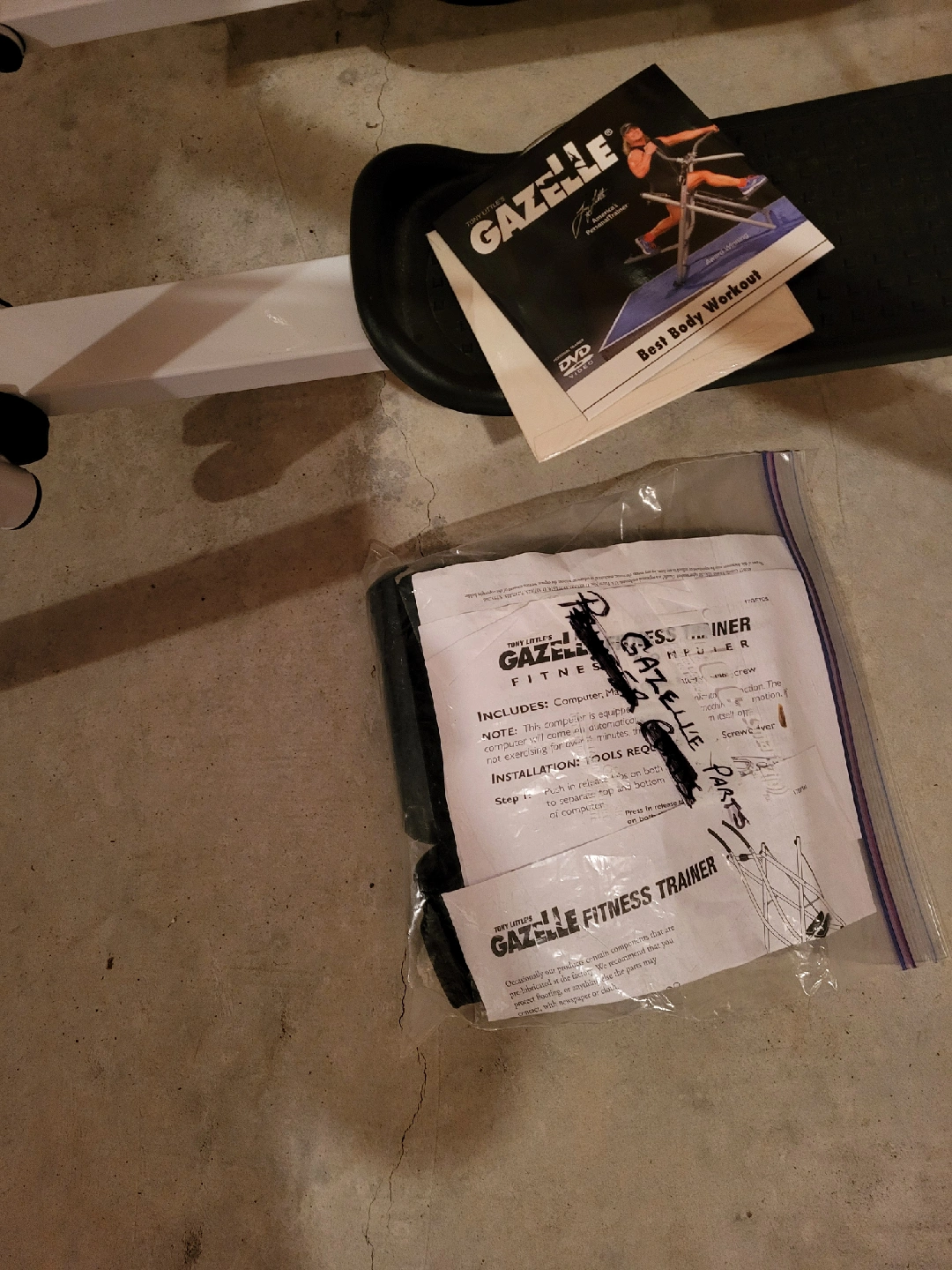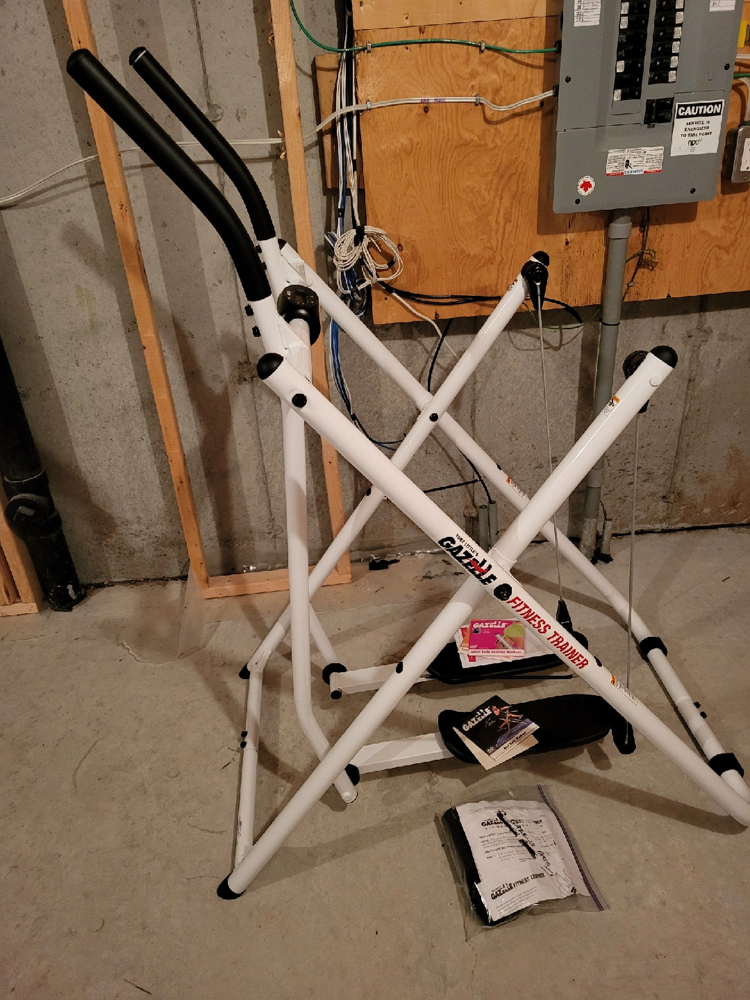 Gazelle fitness trainer is up for grabs! Includes instruction manuel, tracking meter and DVDs. Can be folded down for easy storage under your bed, etc. Get yourself back into shape while having fun on the Gazelle. Great when weather not suitable for outdoor walking, etc.