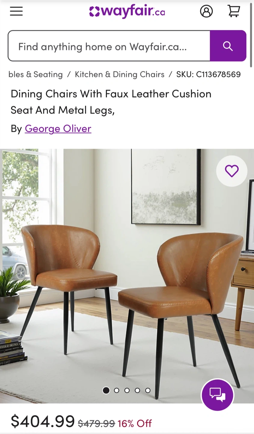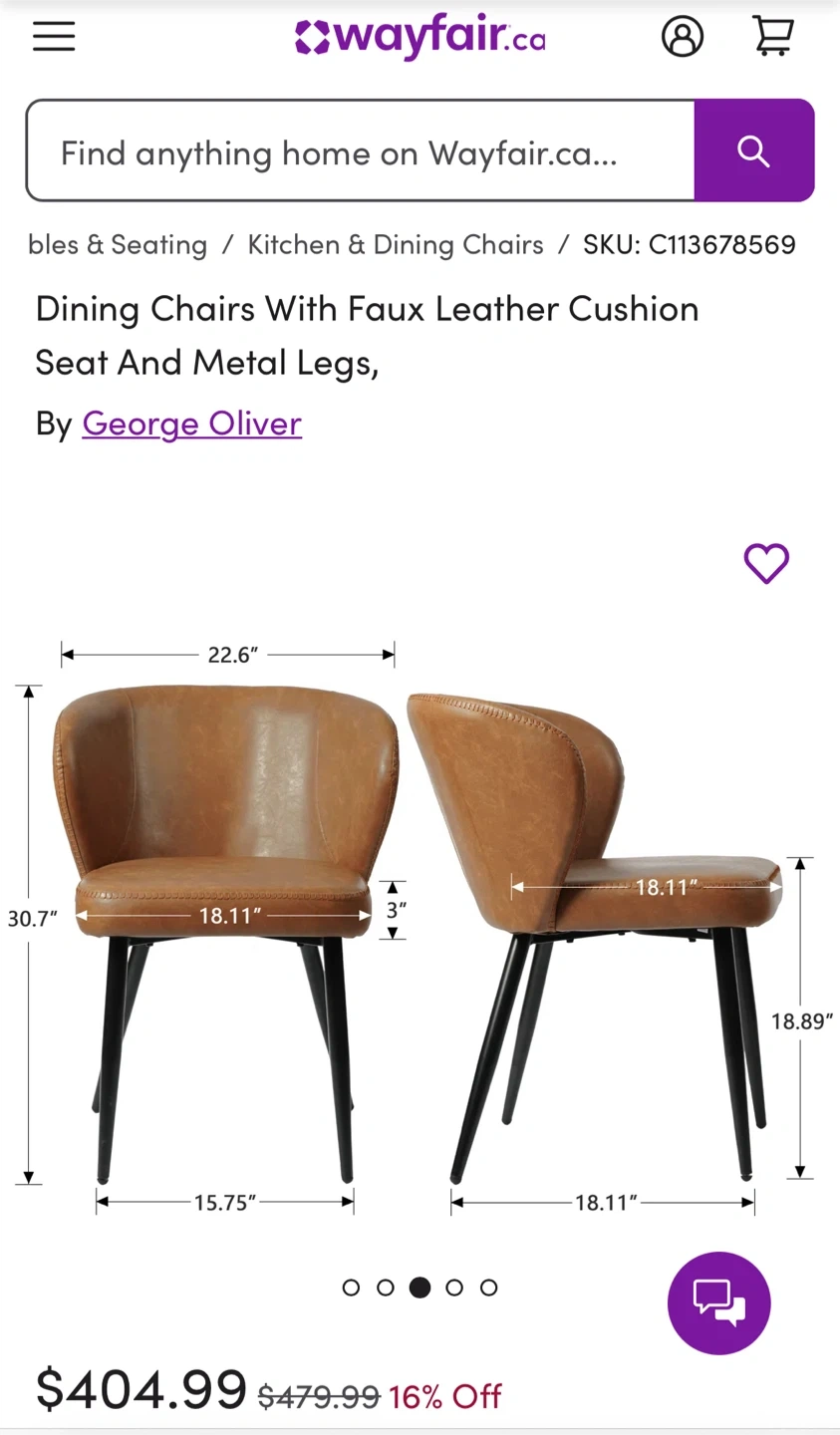 Selling a set of George Oliver dining chairs with faux leather cushions and metal legs. They're in great shape and would look fantastic in any kitchen or dining area! Originally bought for $404.99