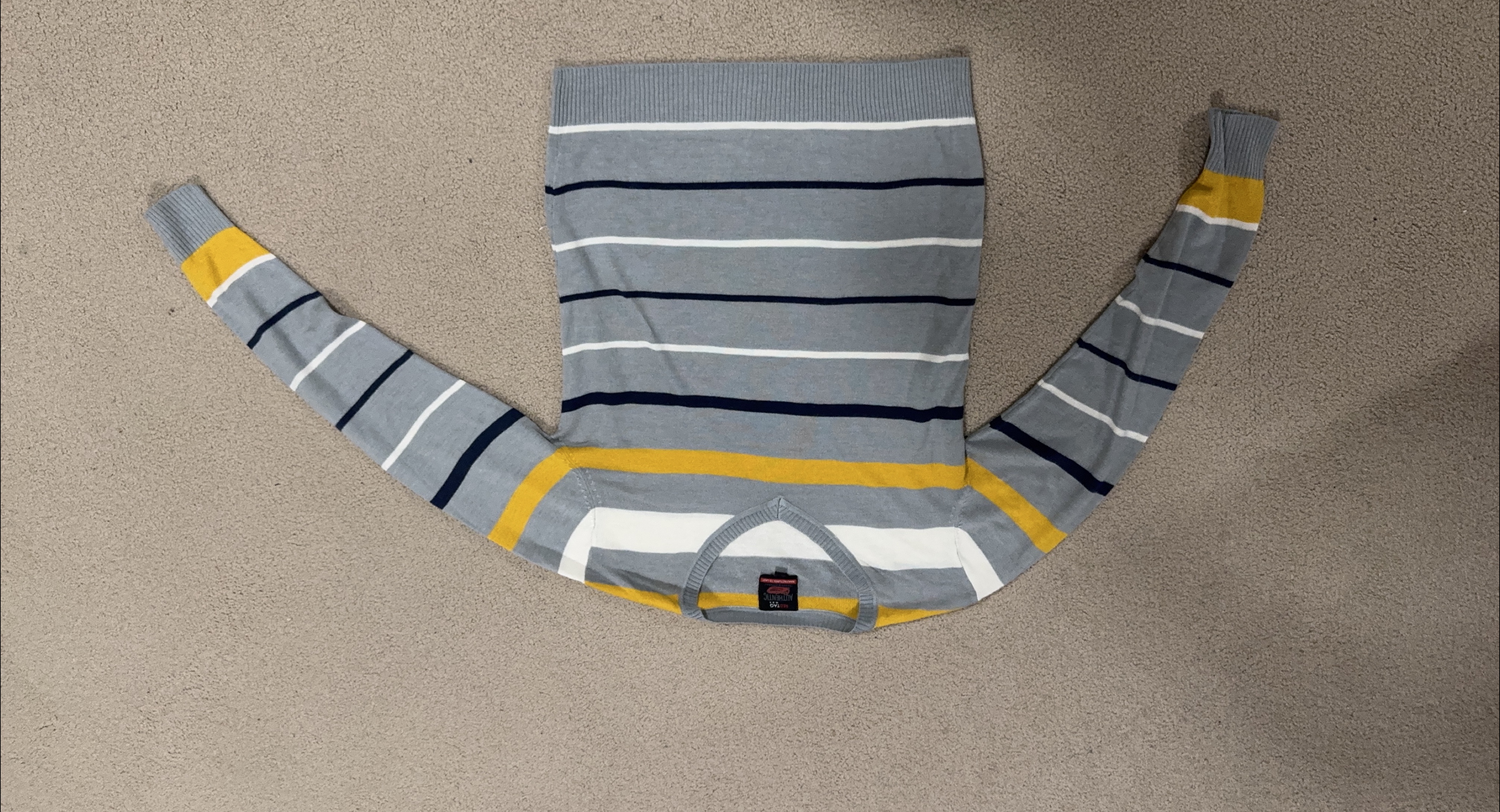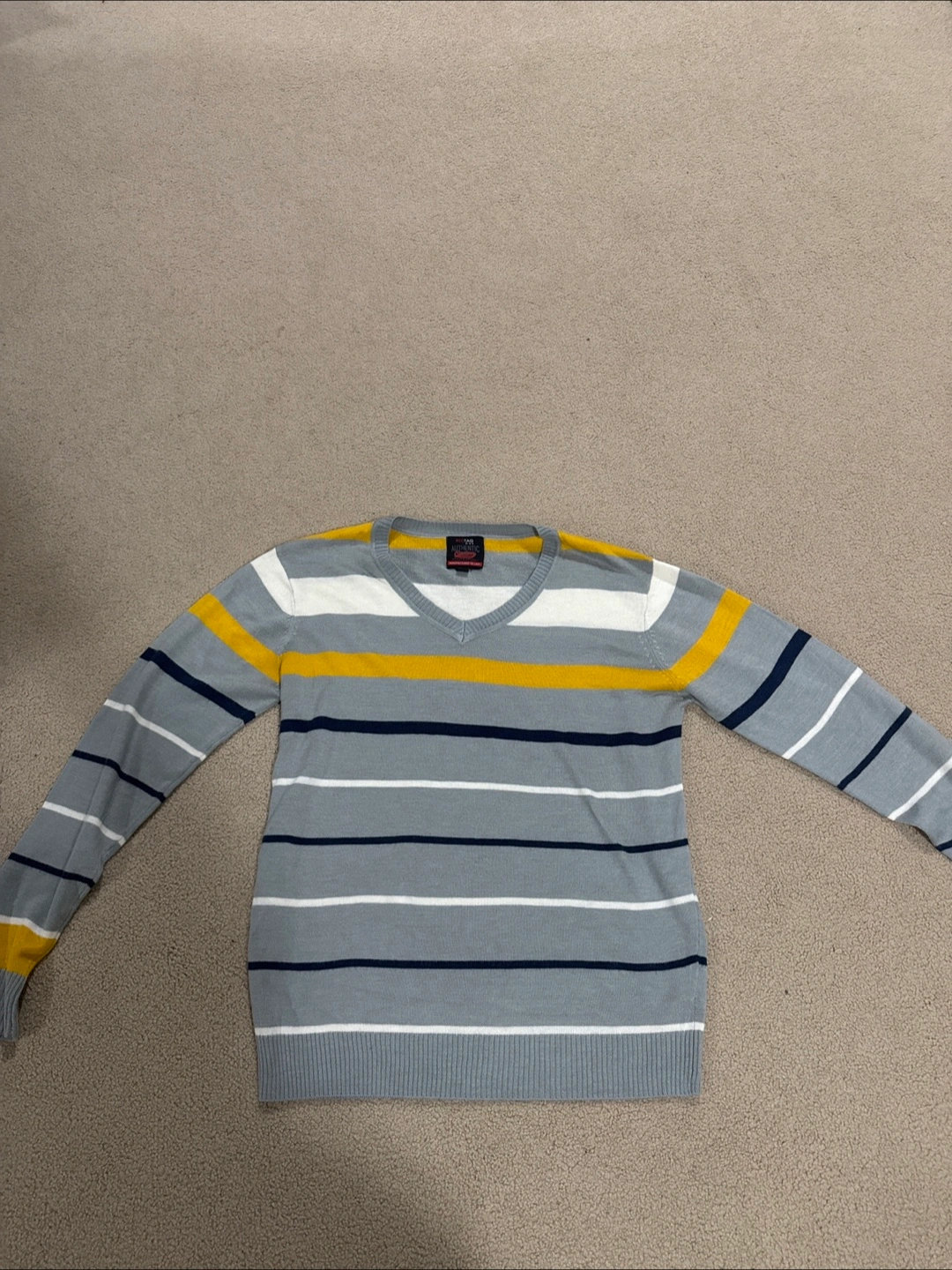 Here's a George striped V-neck sweater, perfect for adding a bit of style to your wardrobe! It's a size medium and features a mix of grey, white, navy, and yellow stripes. Great for layering or wearing on its own