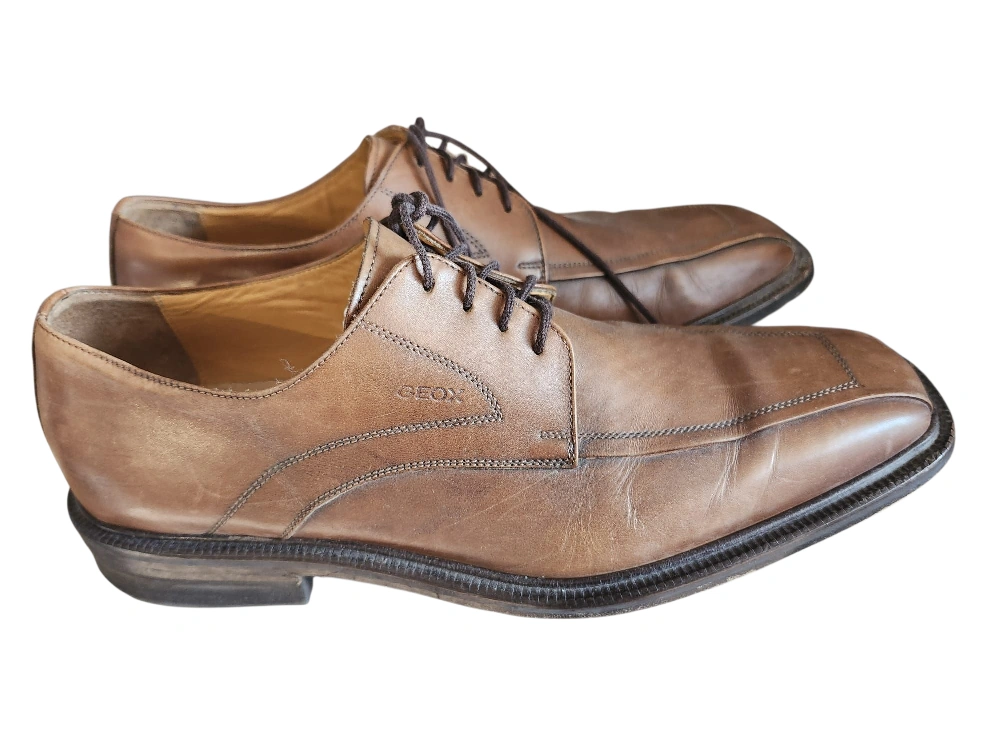 Selling a pair of Geox brown leather dress shoes. They show some signs of wear, but are still in good condition. Perfect for a business casual look!