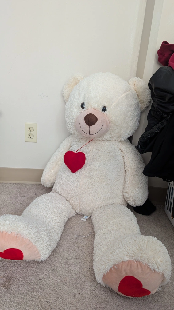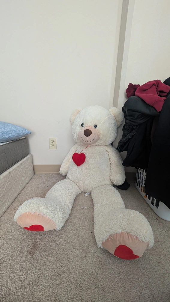 Selling a large, cuddly teddy bear! It's in great condition and ready for a new home. Perfect for kids or anyone who loves a big, soft friend