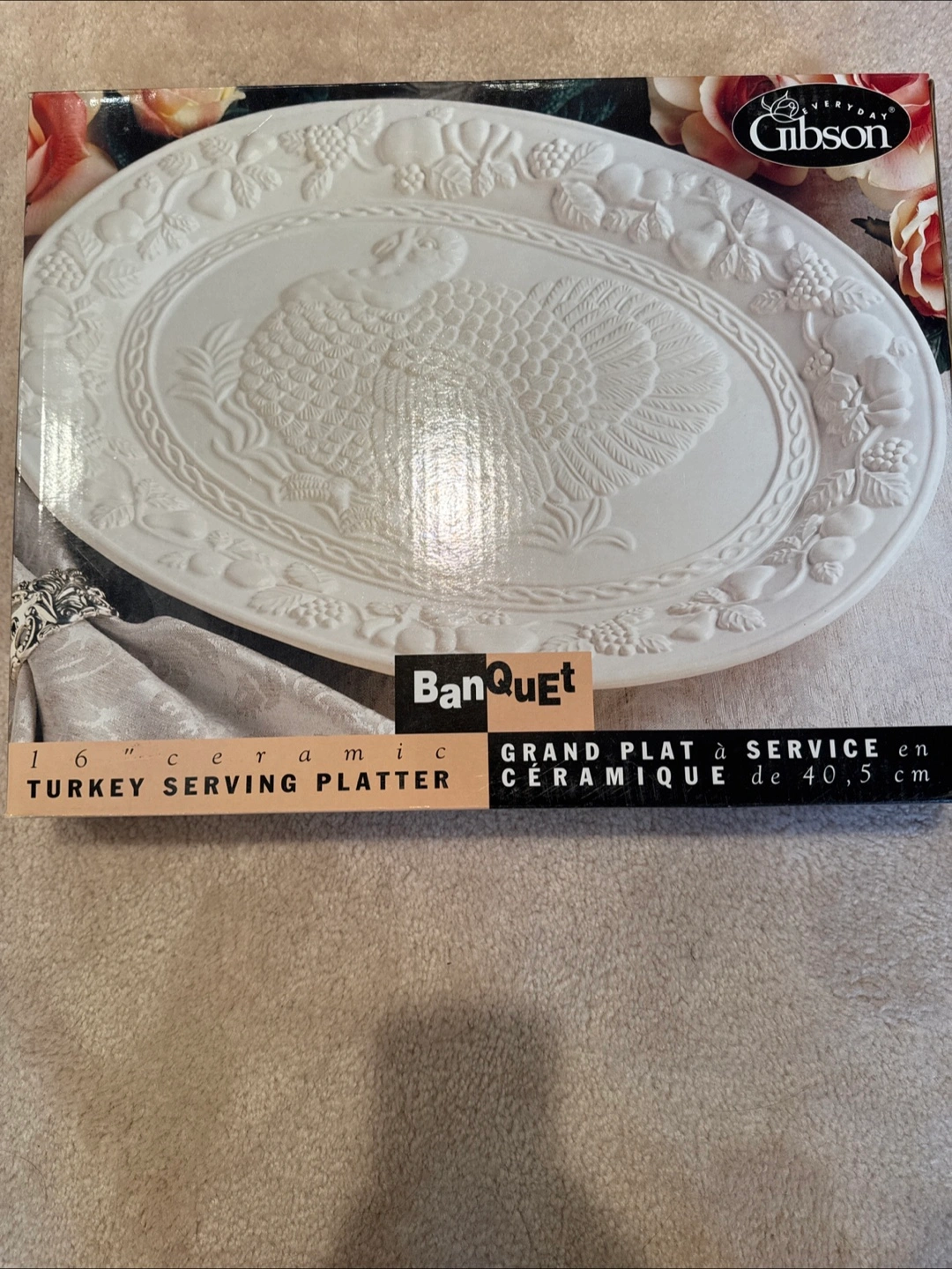 Selling a Gibson Everyday Banquet 16" ceramic turkey serving platter! It's brand new in the box and ready for your next holiday gathering. The platter features a beautiful embossed turkey design, perfect for serving up your favourite dishes