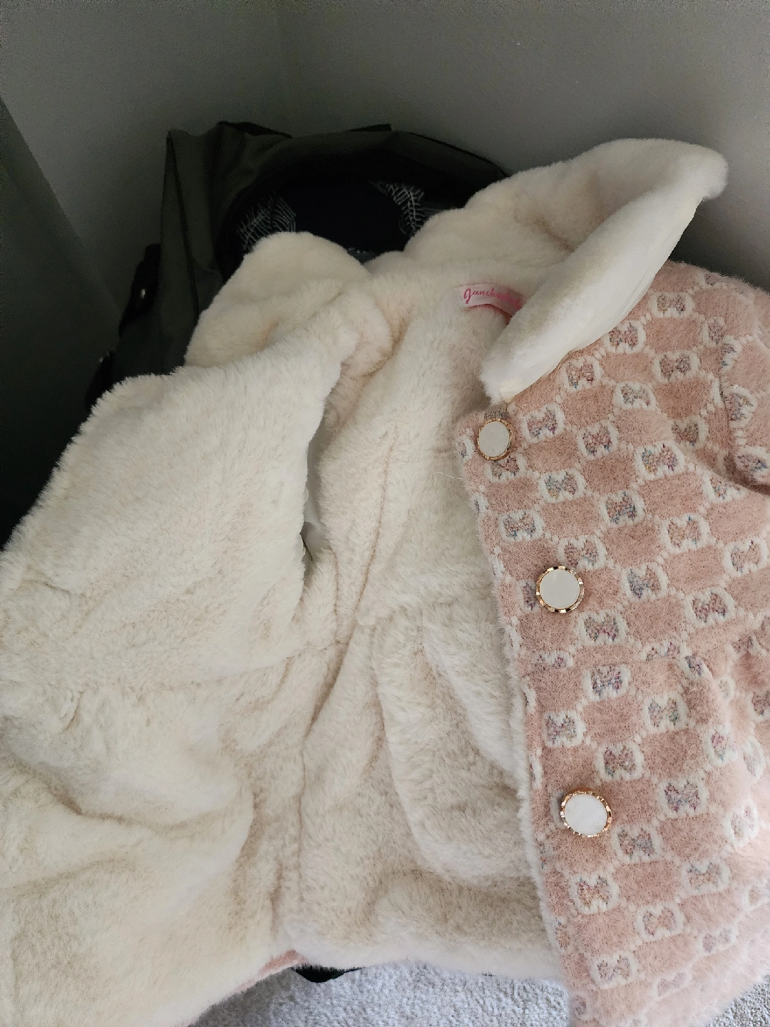 A cute winter coat with a pink patterned design and a soft, fluffy lining! It has a girly look with decorative buttons. Perfect for keeping warm and stylish during the colder months. size 3
