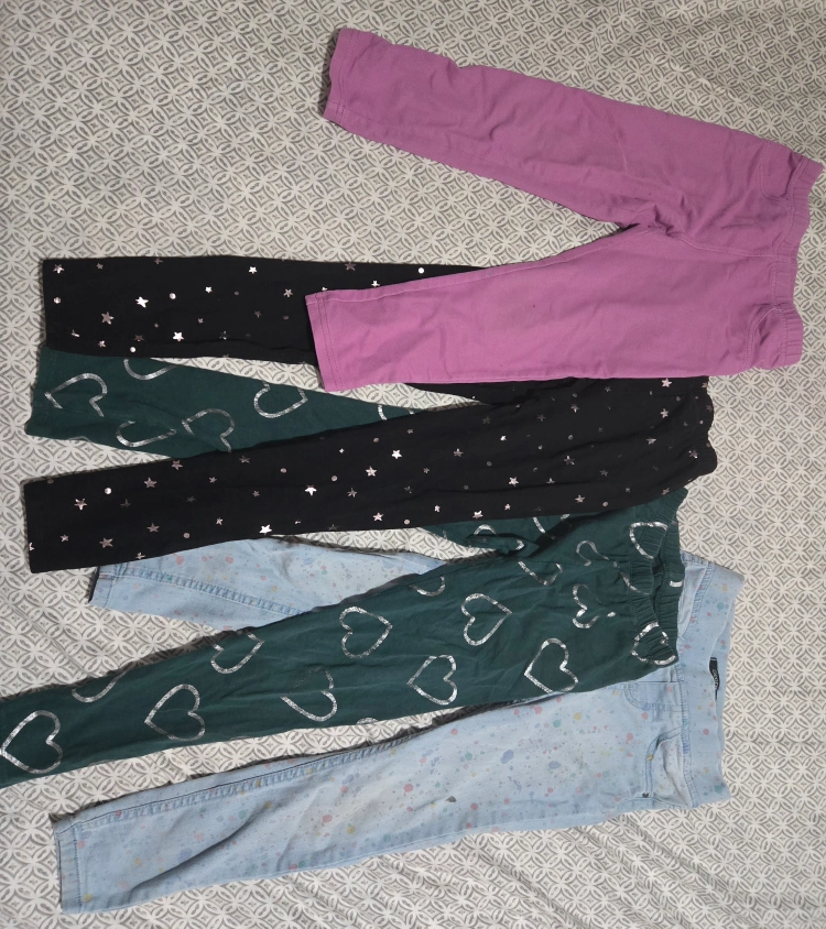 Selling a bundle of girls' leggings! There are four pairs in total, featuring various colours and patterns like stars and hearts. Perfect for everyday wear!