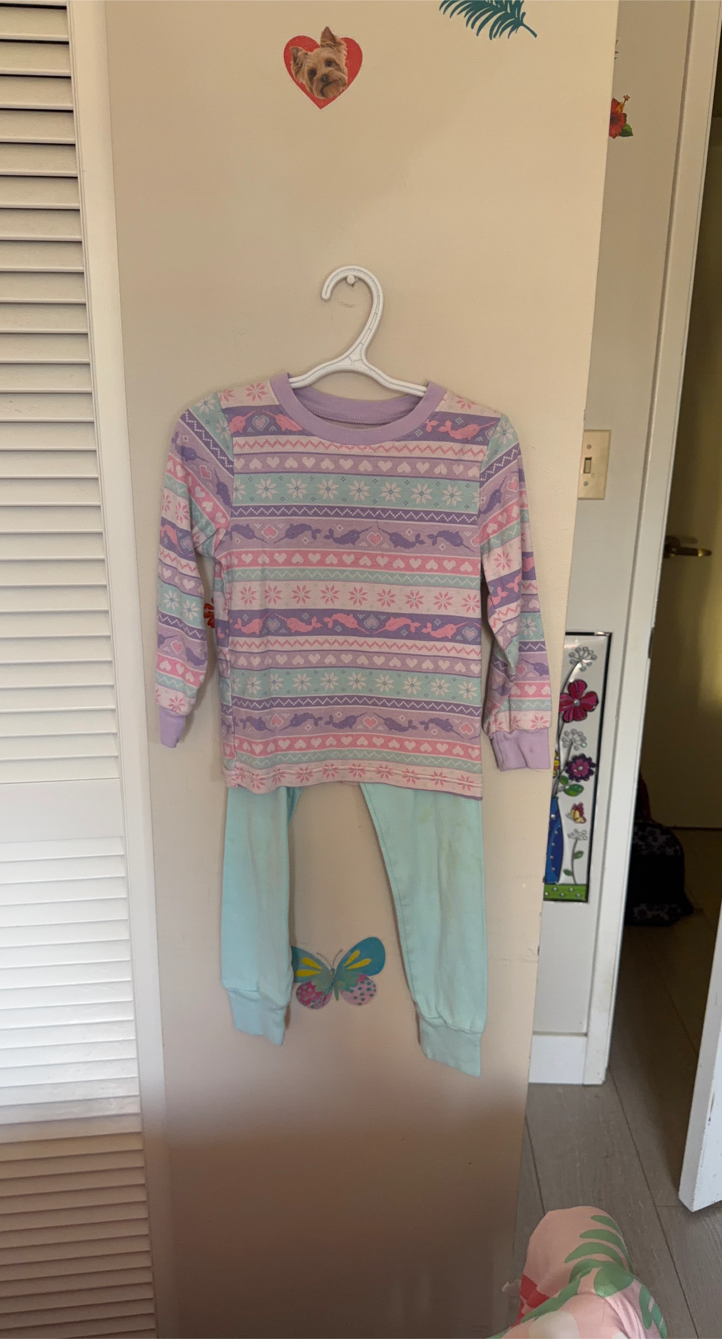 Cute girls' pajama set featuring a long-sleeved top and pants. The top has a fun pattern with whales, hearts, and snowflakes in pastel shades of purple, pink, and light blue. The pants are a solid light blue colour. Perfect for a cozy night's sleep!