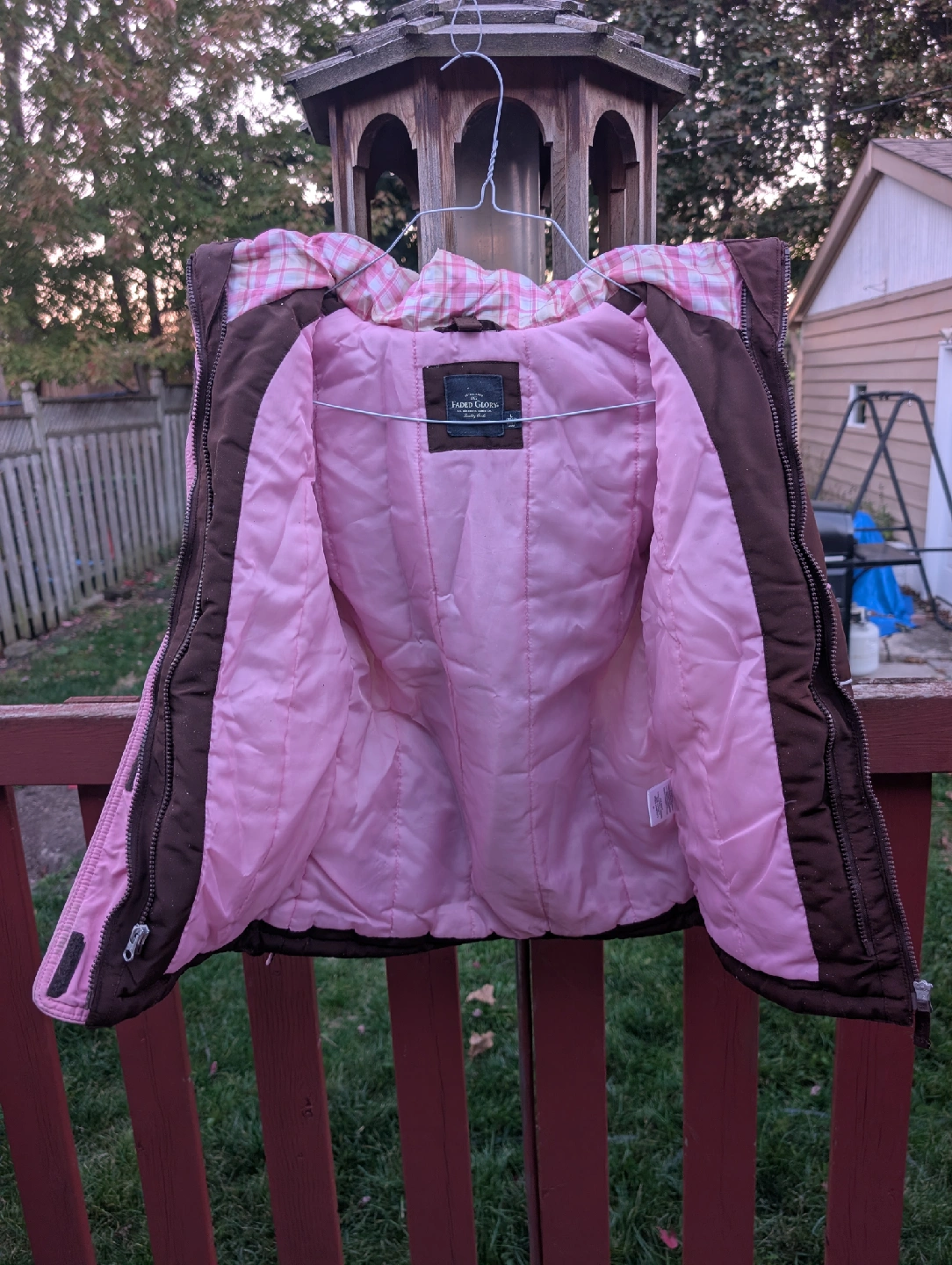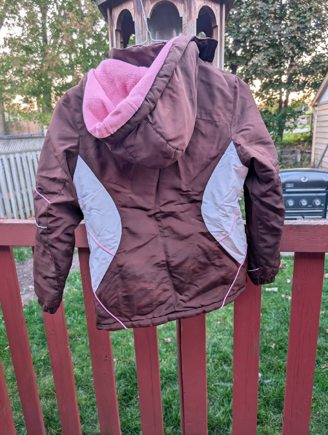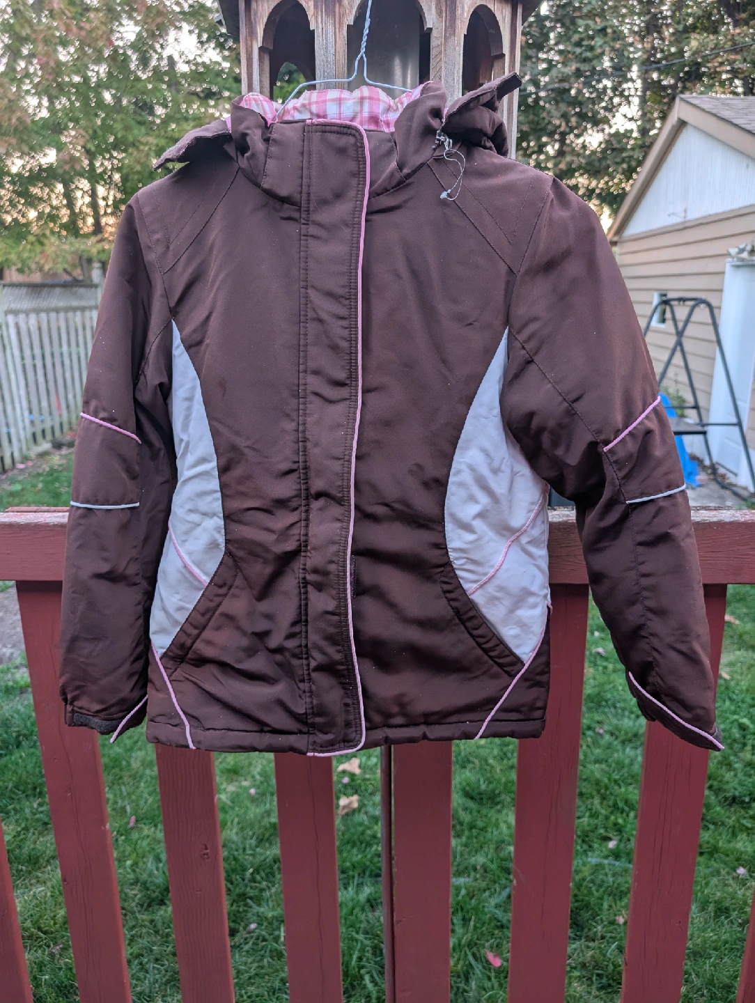 Girls size large (10-12) Faded Glory Brand winter jacket. Zipper and velcro closure, removable hood, 2 pockets on outside, fleece in inside hood, velcro adjustable cuffs with mitten holder loops inside.