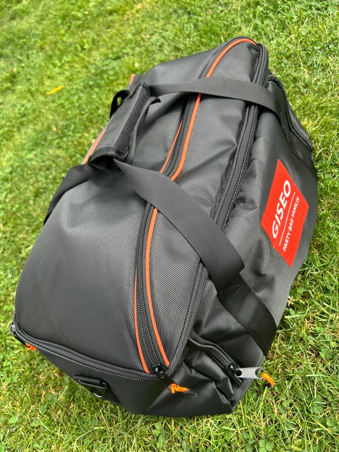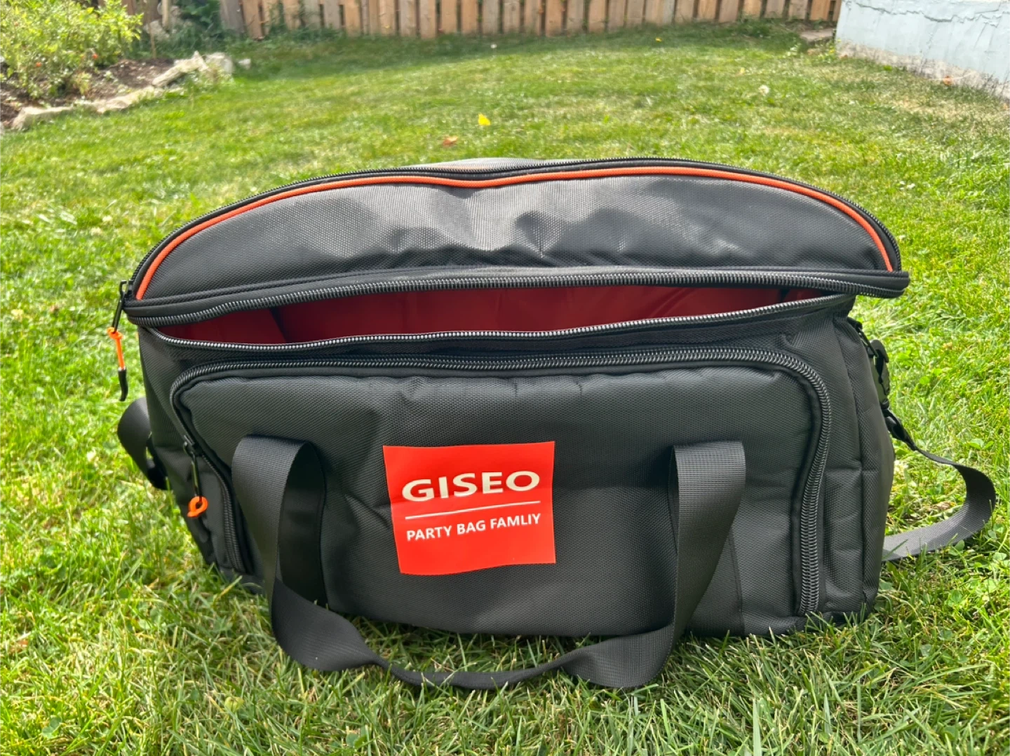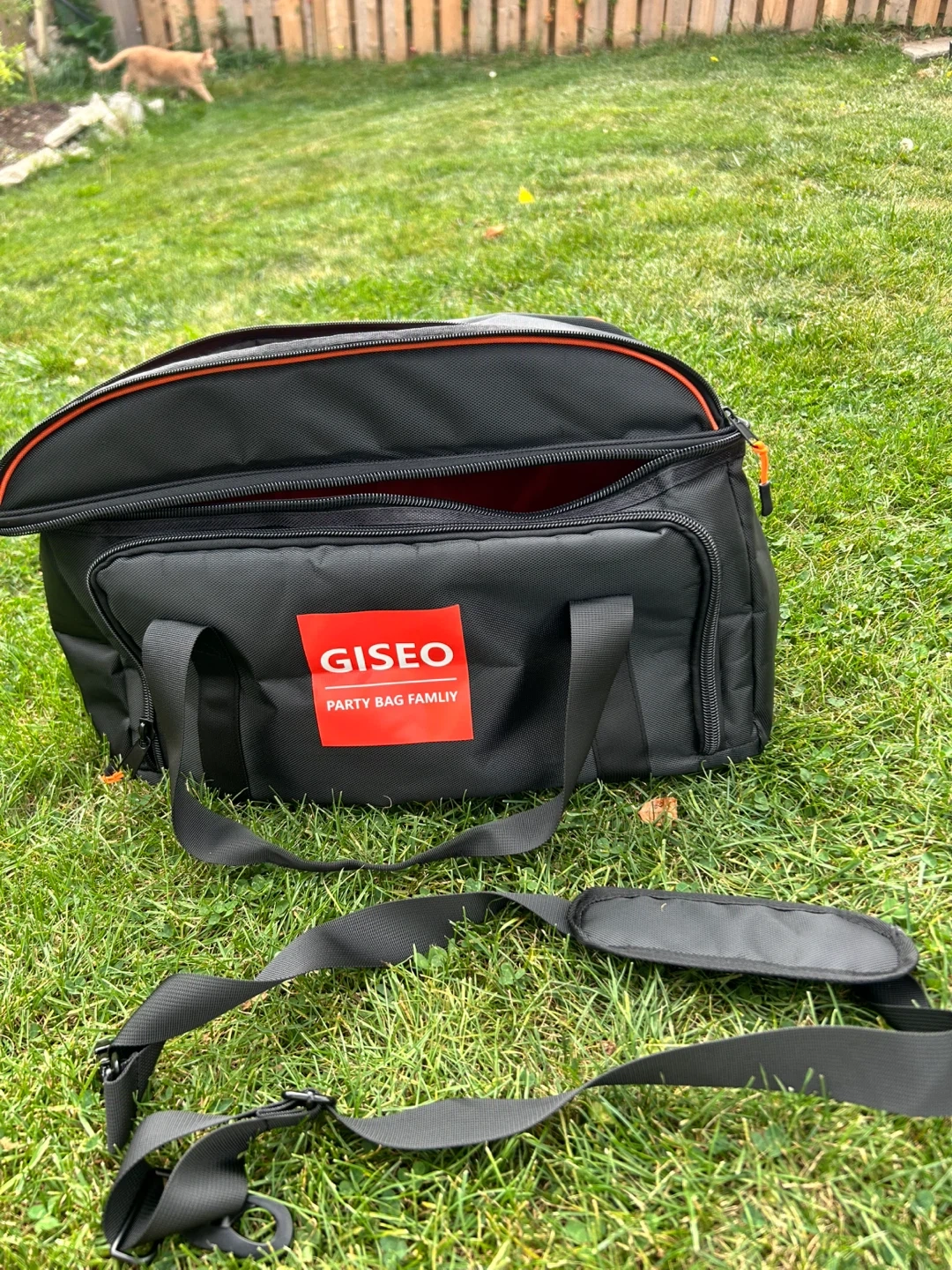 This is a GISEO Party Bag Famliy, perfect as a travel storage bag! It's in great condition and ready for your next adventure. The bag is black with orange accents and features a shoulder strap for easy carrying