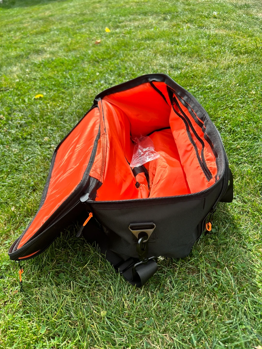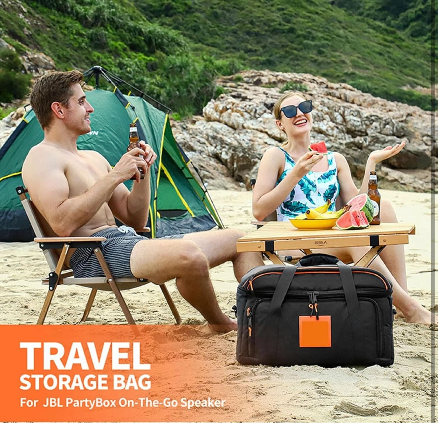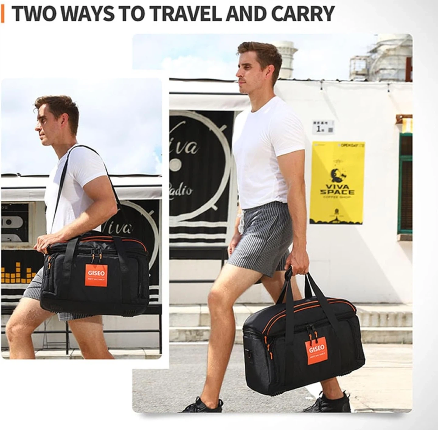 This is a GISEO Party Bag Famliy, perfect as a travel storage bag! It's in great condition and ready for your next adventure. The bag is black with orange accents and features a shoulder strap for easy carrying
