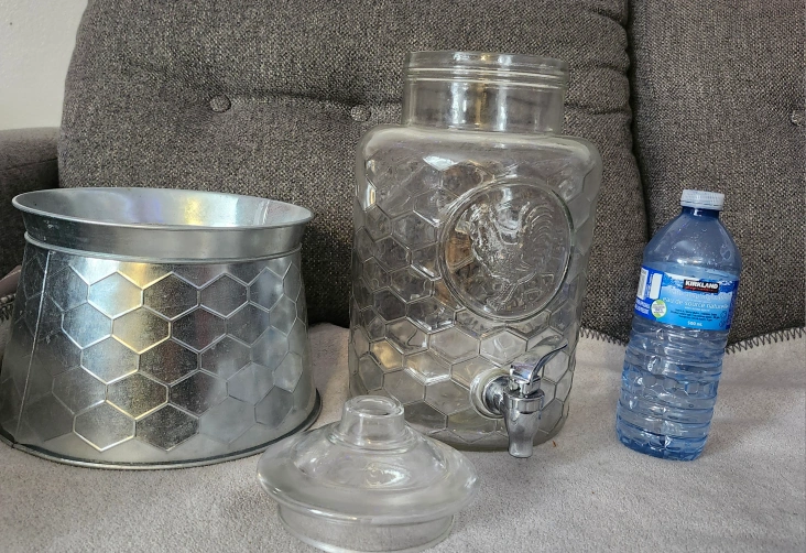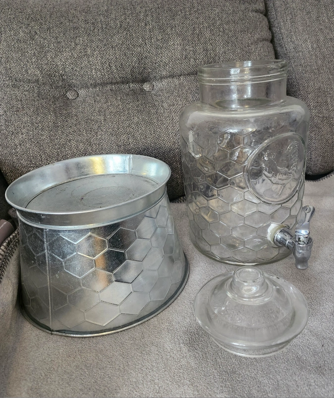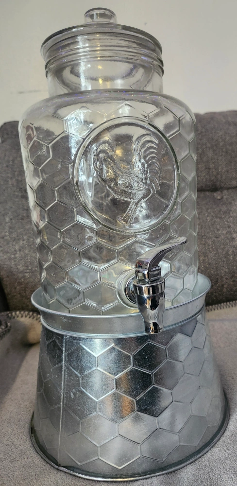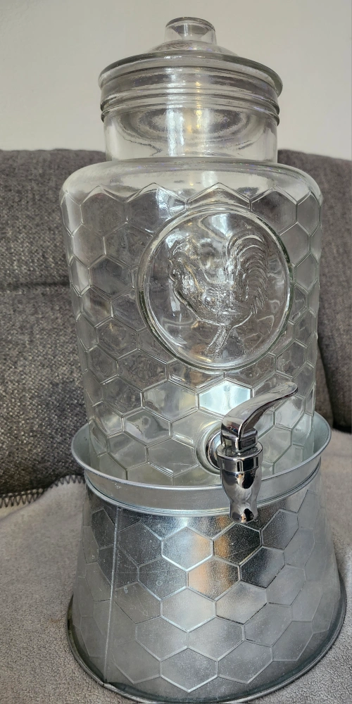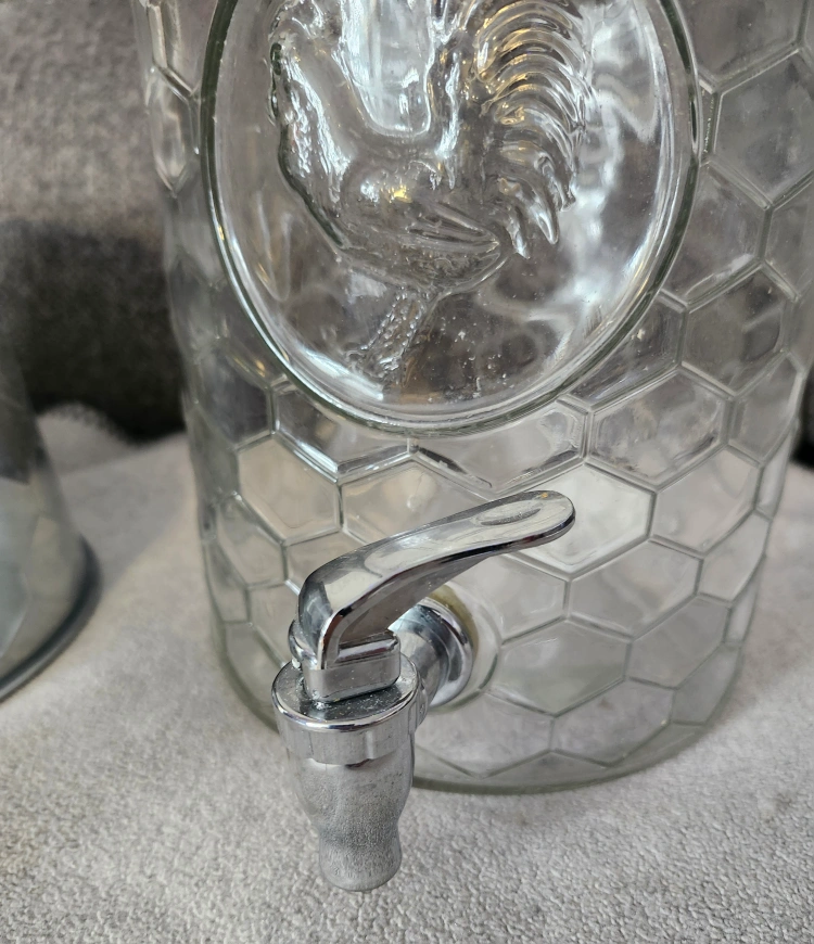 Large glass beverage dispenser. Features a rooster design and a metal stand. Includes a lid and a dispensing tap. Perfect for parties or everyday use.