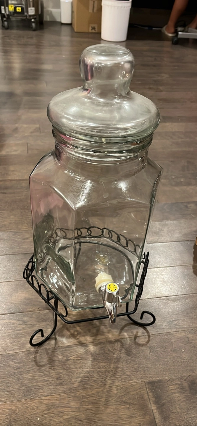 Selling a glass beverage dispenser with a black metal stand. It's perfect for parties or everyday use. The dispenser has a tap for easy serving.