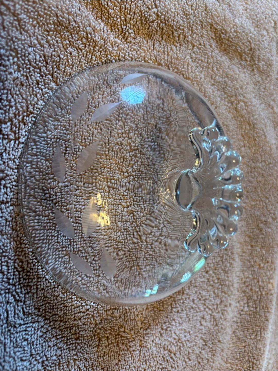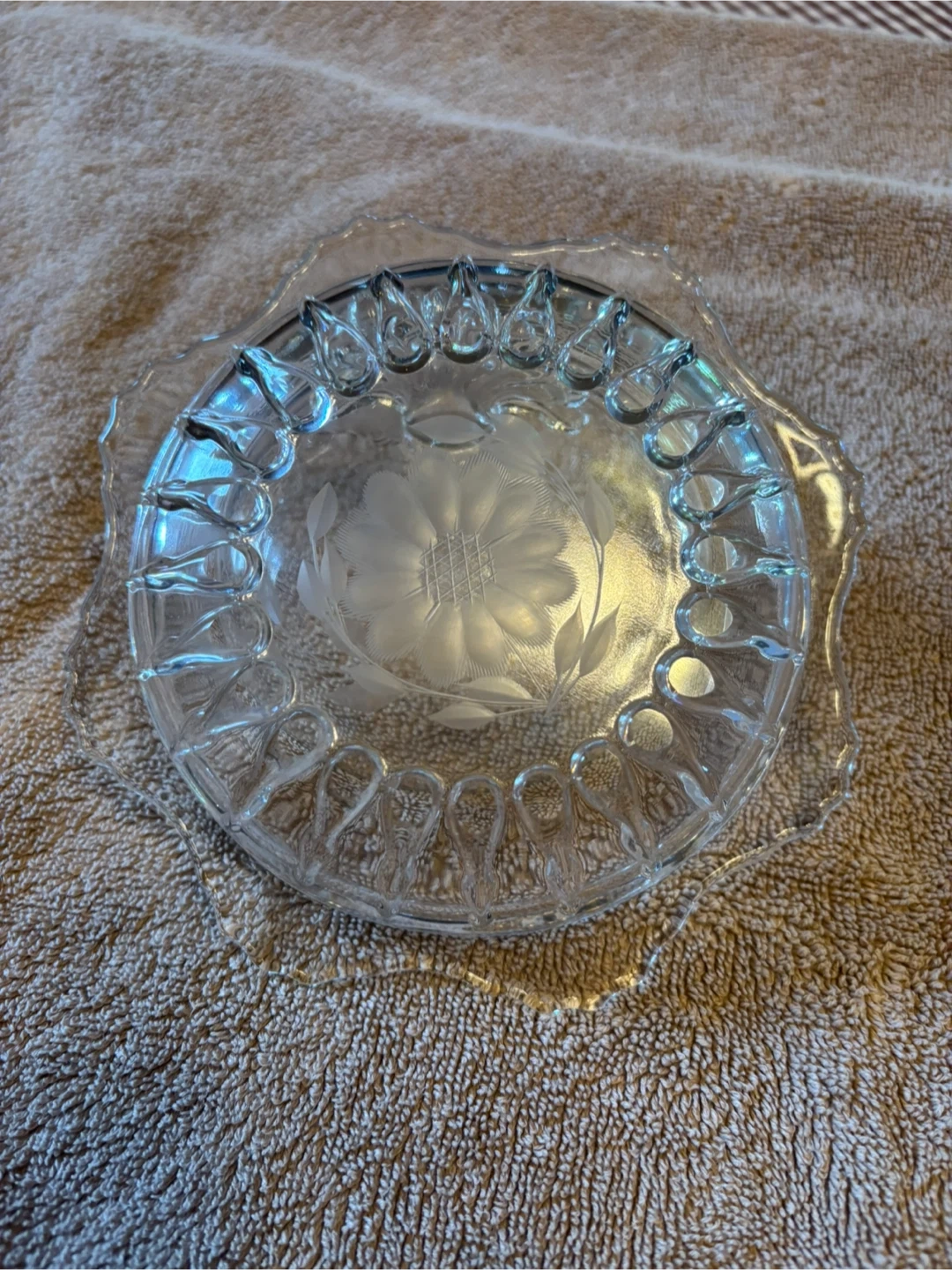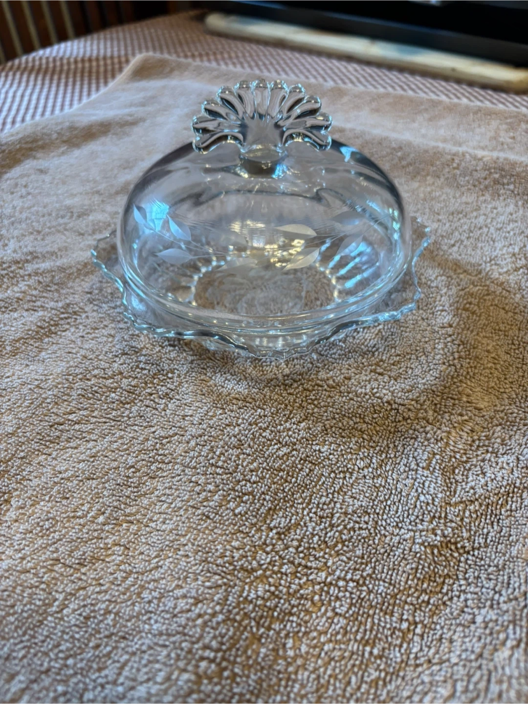 Selling a lovely glass butter dish with a matching lid! It has a pretty floral design etched into the glass. Perfect for keeping your butter fresh and adding a touch of elegance to your table