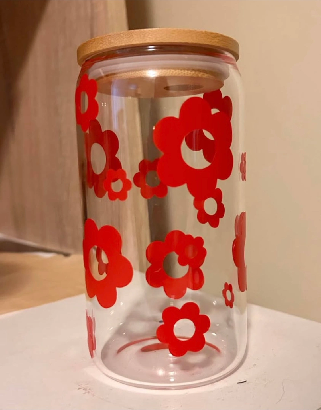 Here's a cute glass can featuring a red flower design! It has a bamboo lid, perfect for keeping your drinks fresh. Comes with glass straw. Hand wash only. Do not soak.