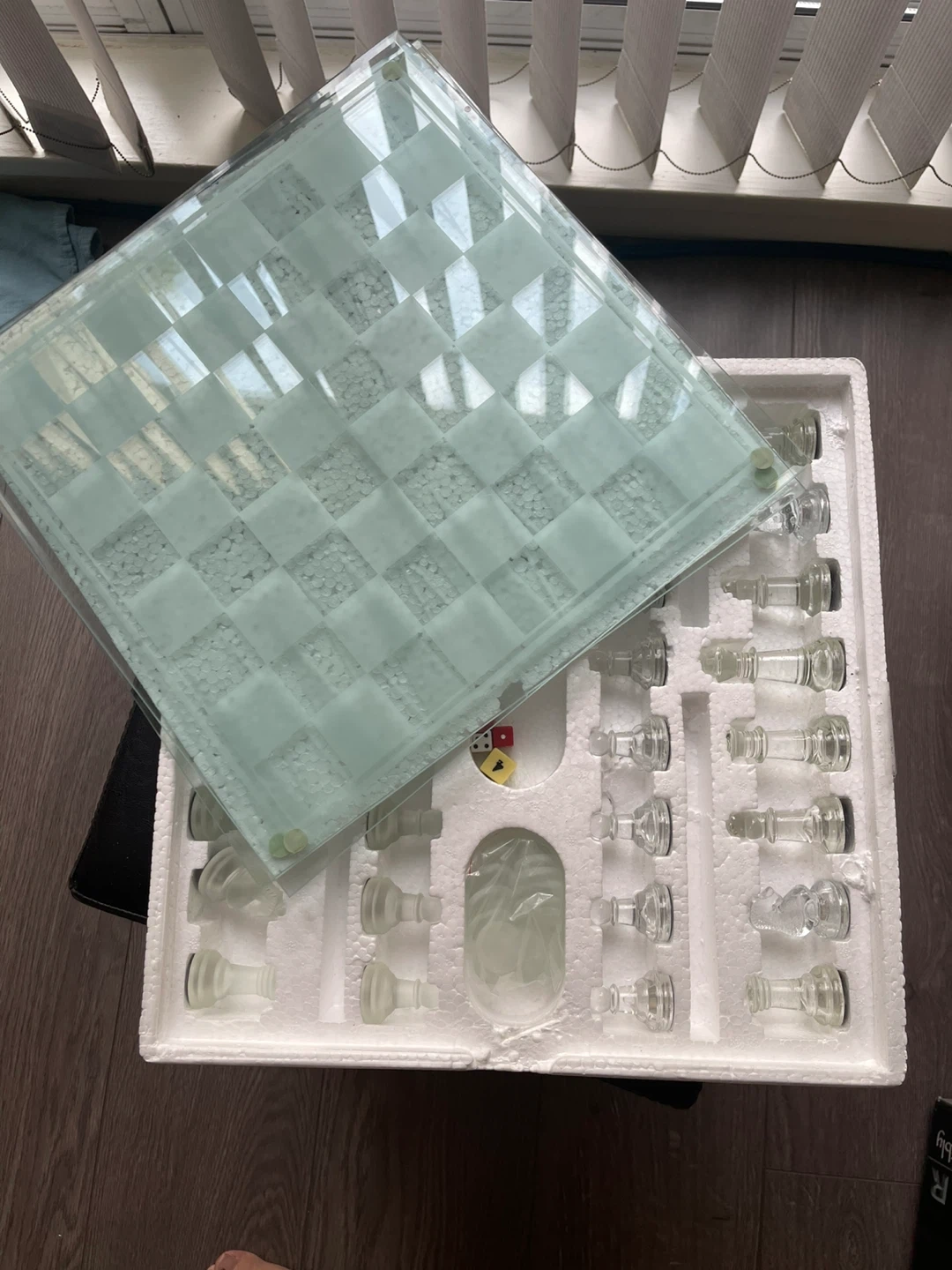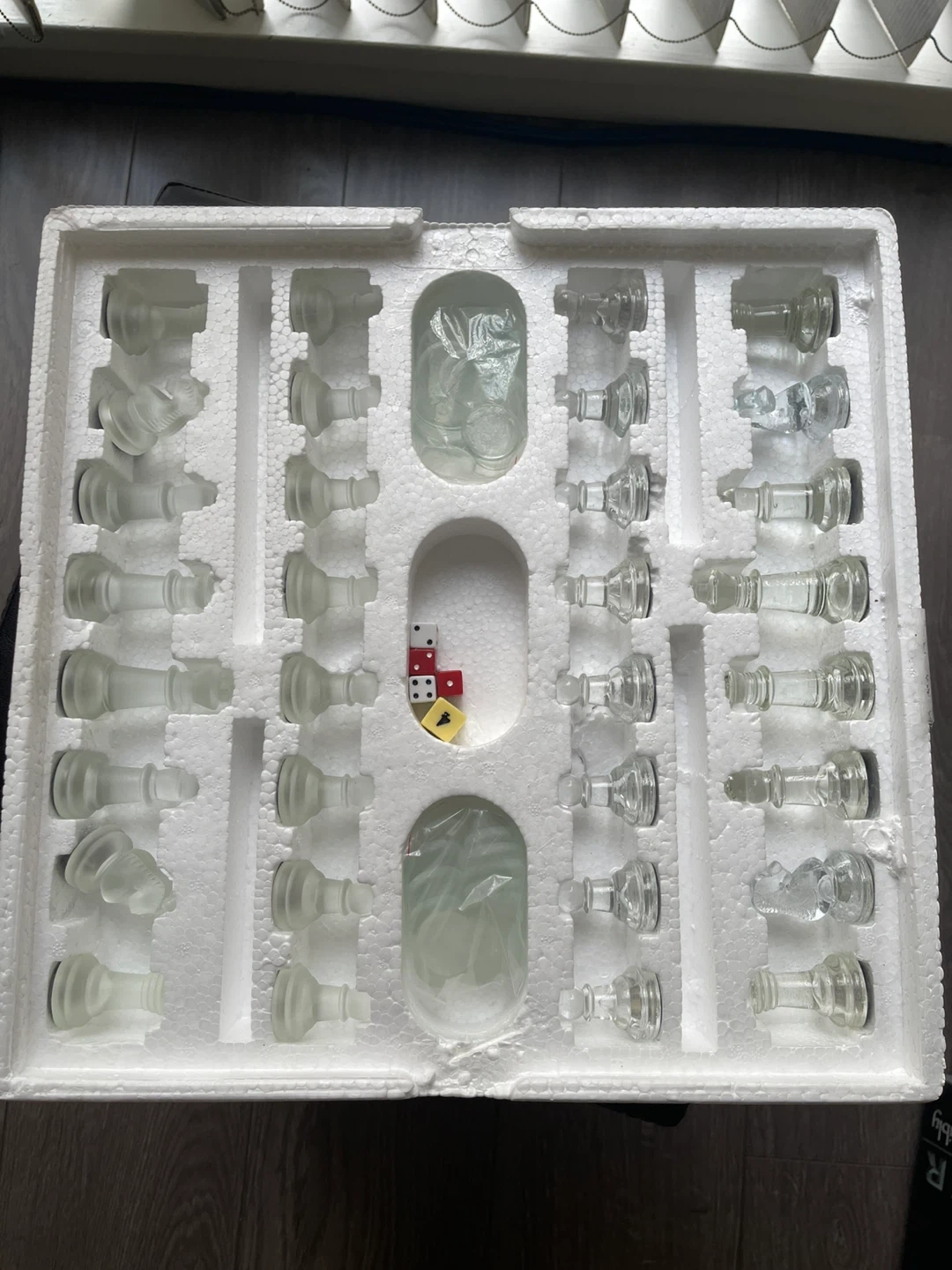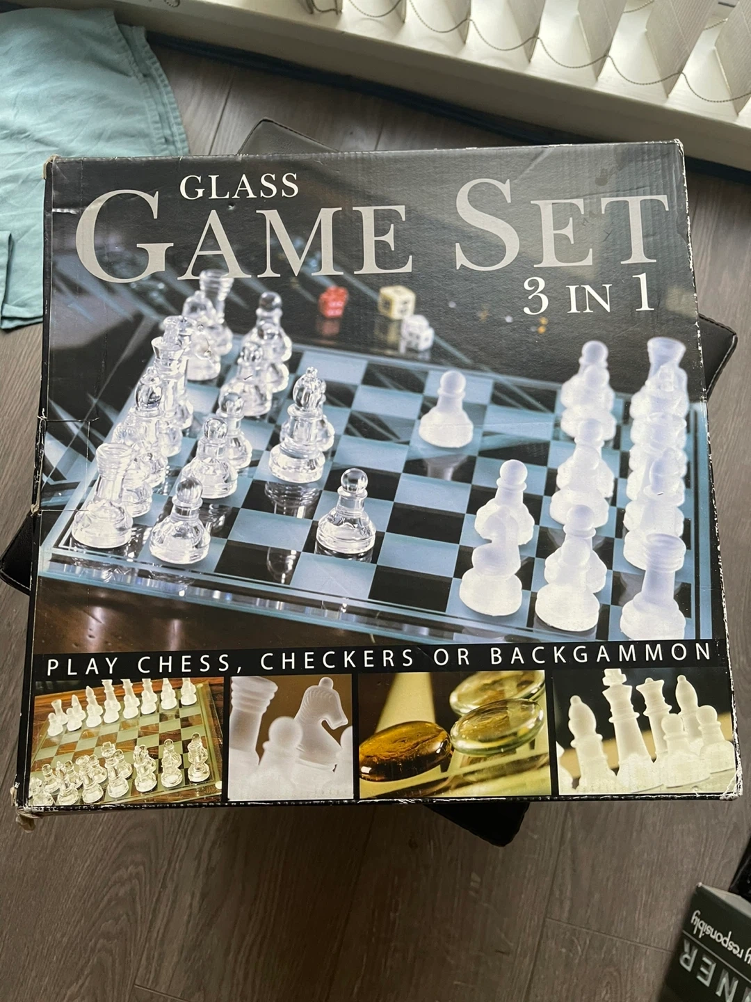 Selling a glass game set that includes chess, checkers, and backgammon! The set is complete with all the pieces and the board, and even includes dice. It comes in its original box, making it easy to store and transport