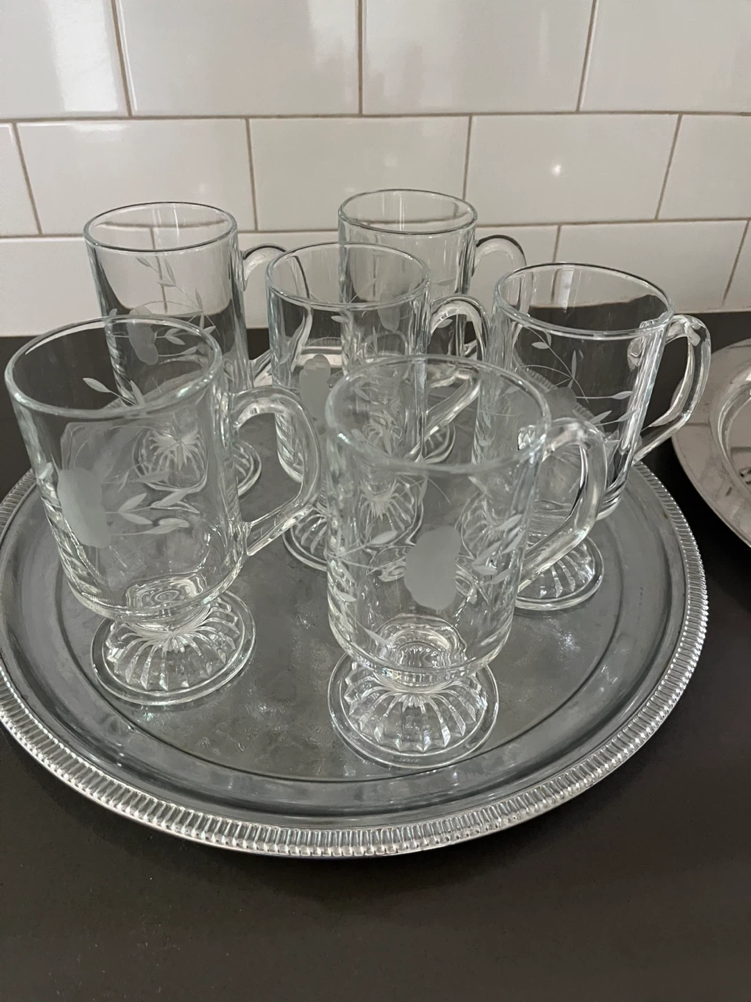 Selling a set of 6 clear glass mugs, 5 Plastic wine glasses with 2 silver trays. They're in great condition and ready to find a new home! Price is for all.