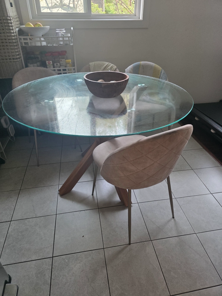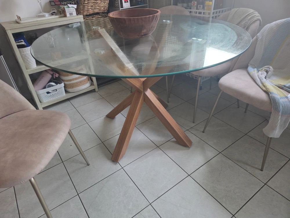 Selling a round glass dining table with a unique wooden base. It's in great condition and would be a lovely addition to any dining space. The table features a clear glass top and a stylish wooden cross-leg base. Perfect for a modern or minimalist aesthetic!