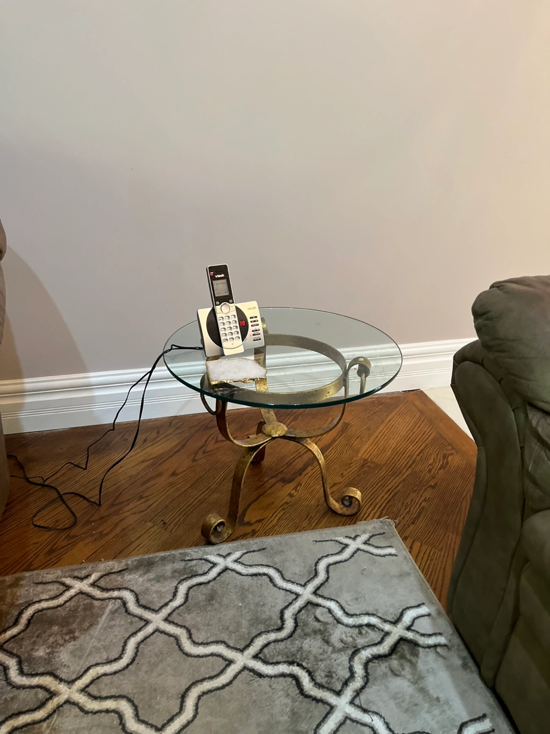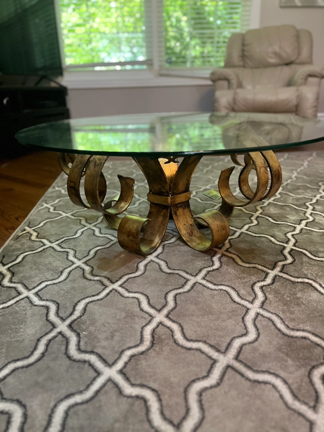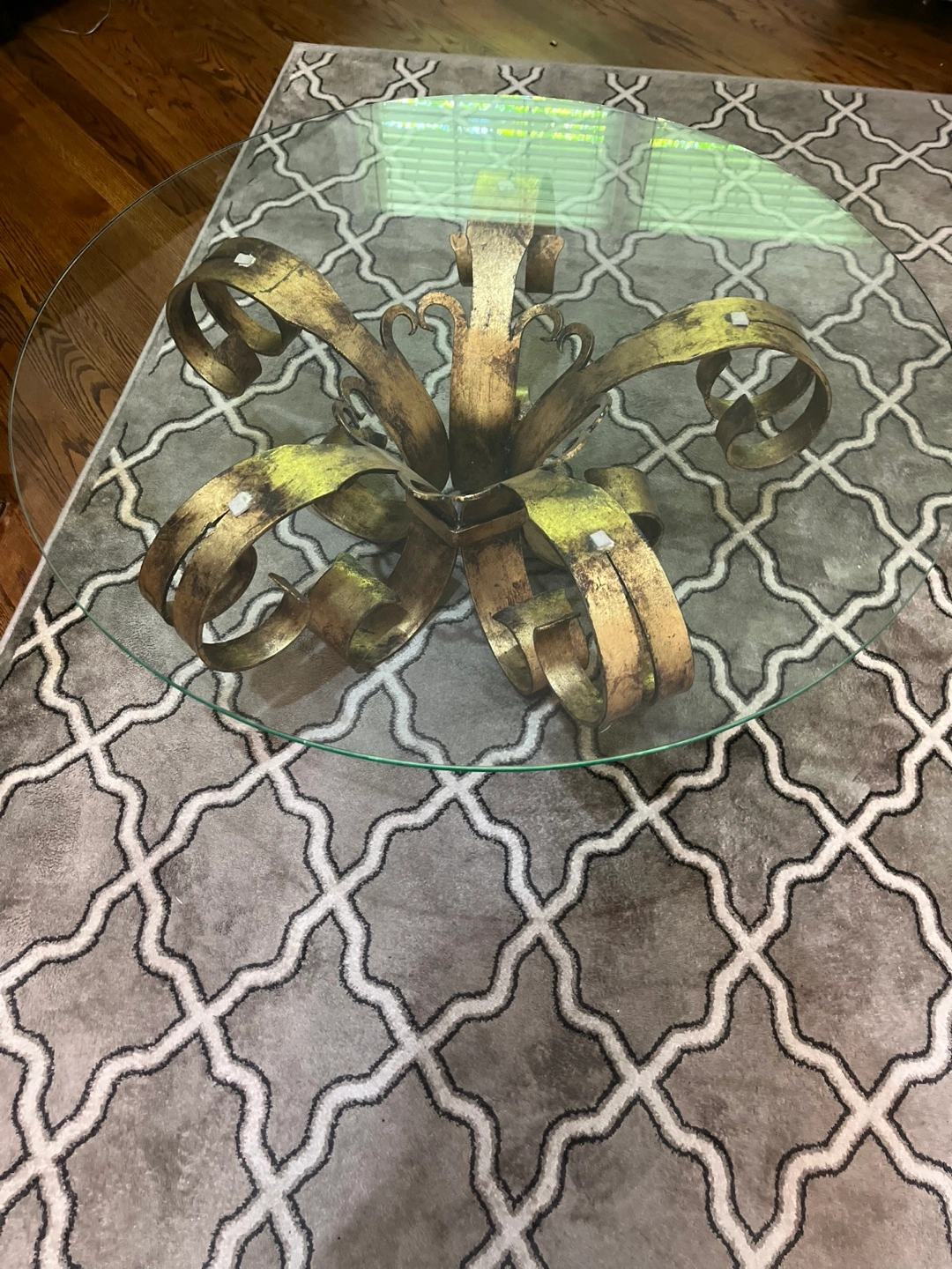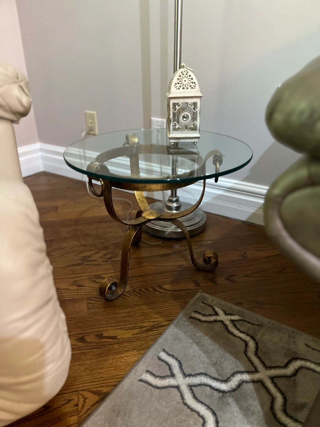 Selling a glass top accent table and side tables with a unique gold-toned metal base. It's in great shape and would be a lovely addition to any living room or bedroom