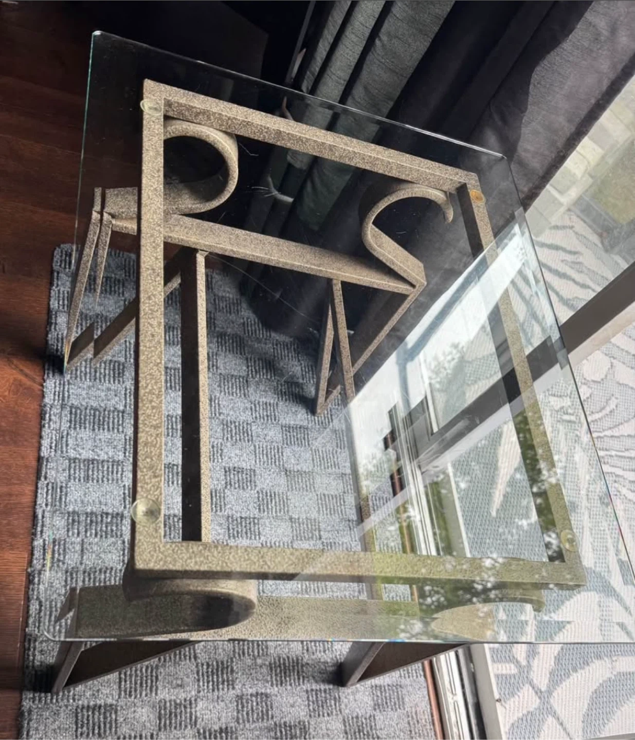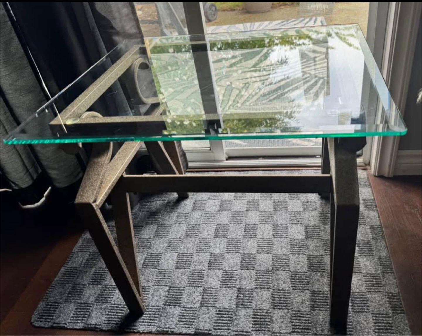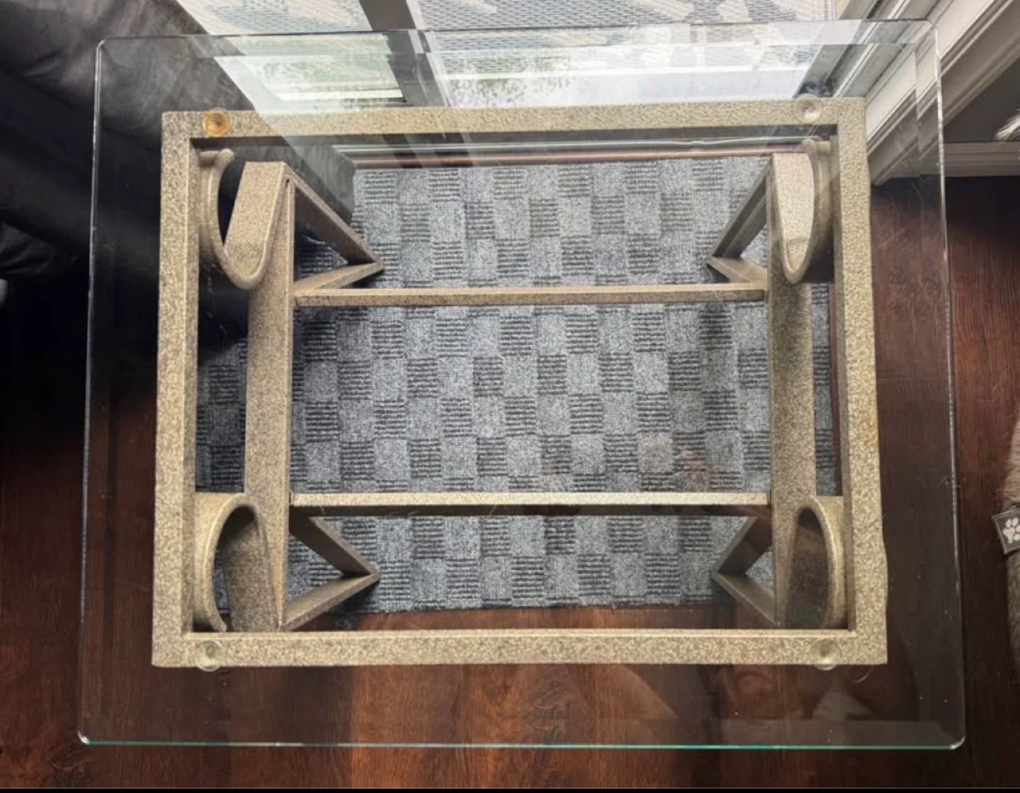Selling a coffee table with a glass top. It has a unique design with a sturdy metal frame. The table is in great condition and would be a stylish addition to any living room! It's perfect for placing your coffee, books, or decor.