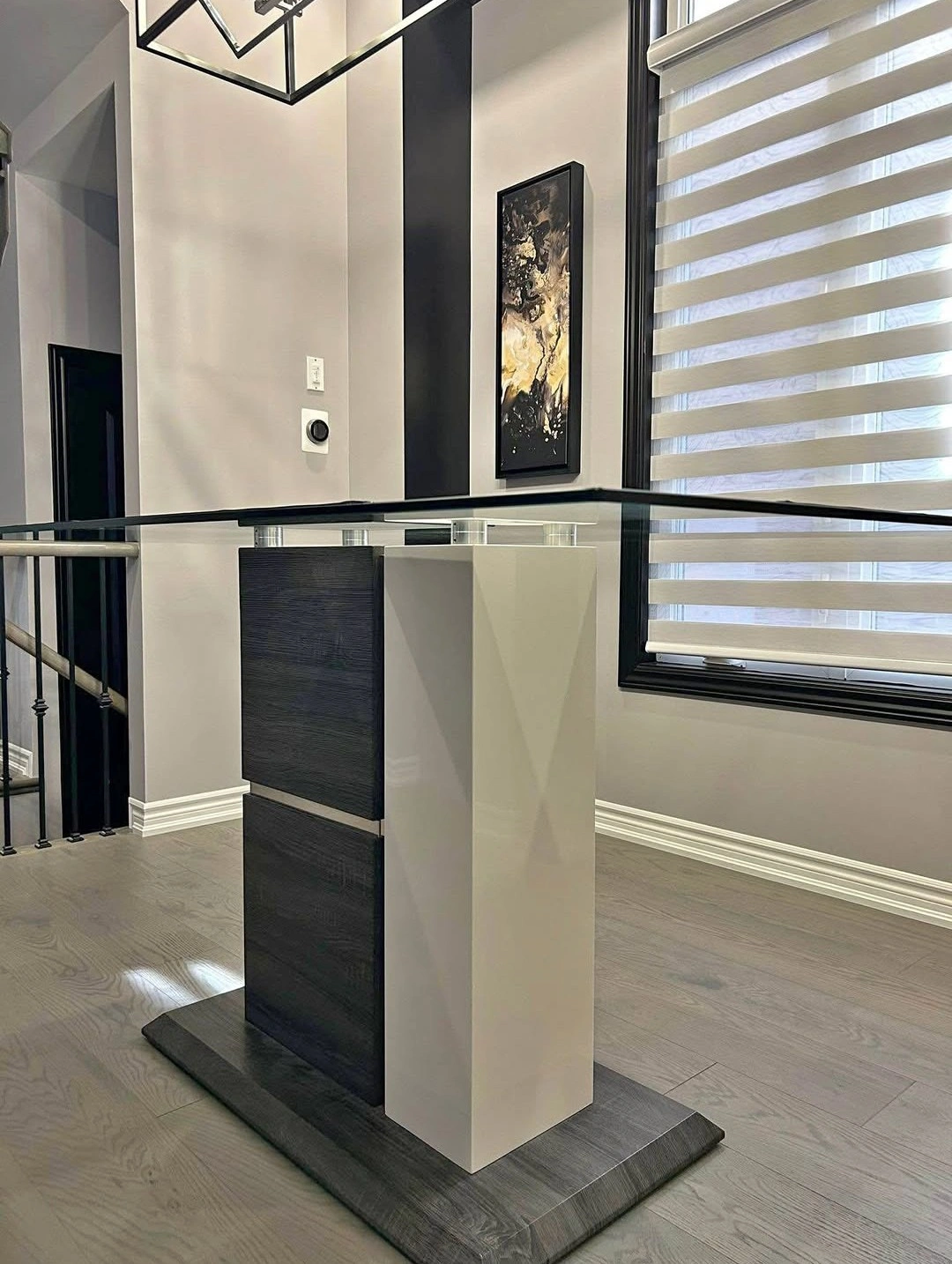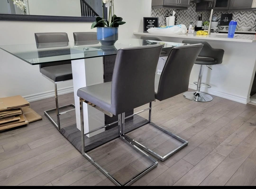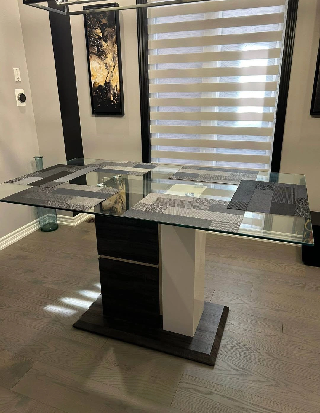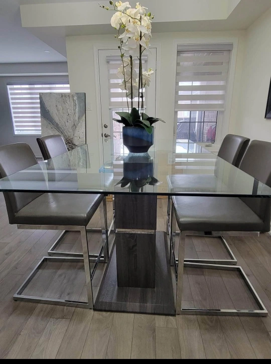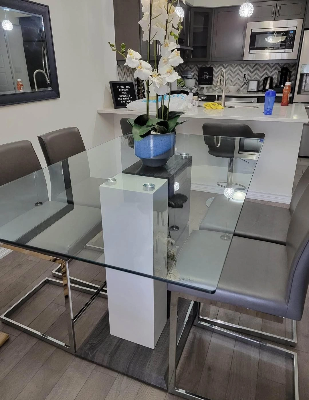 Selling a modern glass top dining table with ample seating for six in great condition. glass top can be detached from base for easy transport. dimensions: 64" L x 38" W x 36" H pick up only