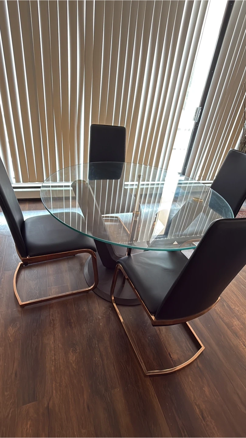 Selling a dining table with a glass top and four black chairs. The chairs have a modern design with rose gold frames. It's a stylish set that would look great in any dining room!