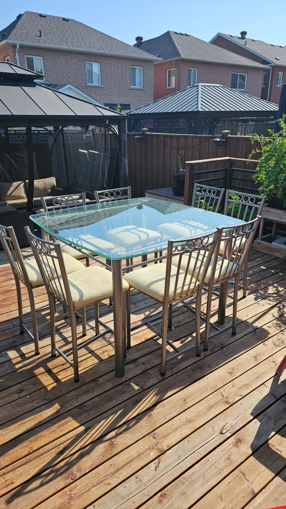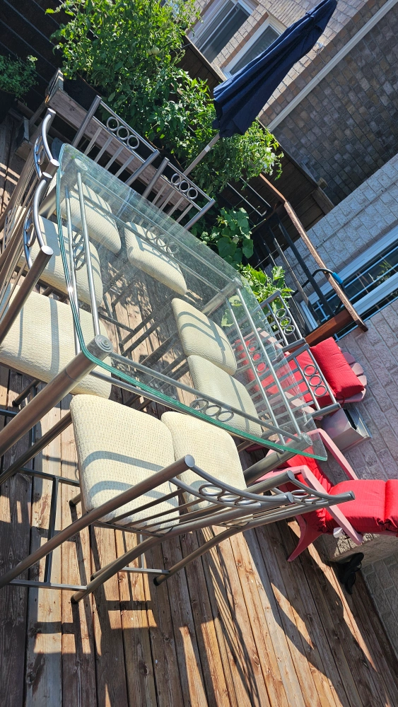 Selling a stylish glass top dining table with a sturdy metal frame, perfect for your patio or dining room. It comes with six matching chairs that have comfortable cushioned seats. This set is in good condition and ready to be enjoyed!