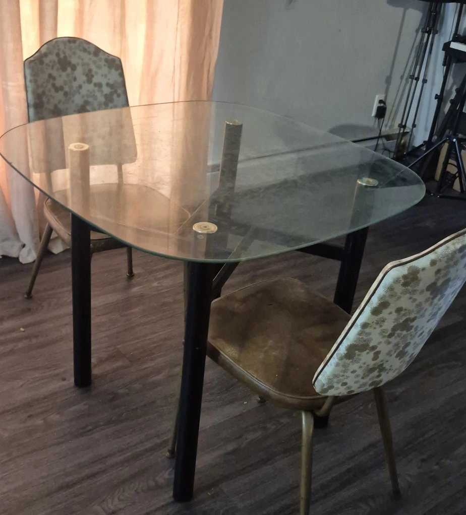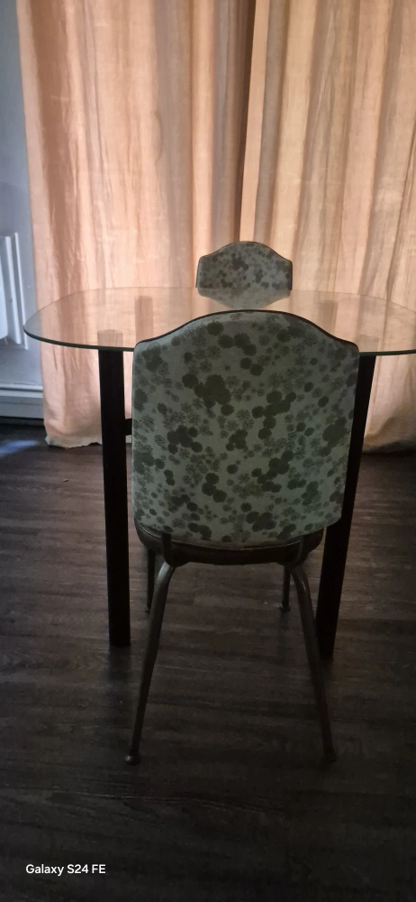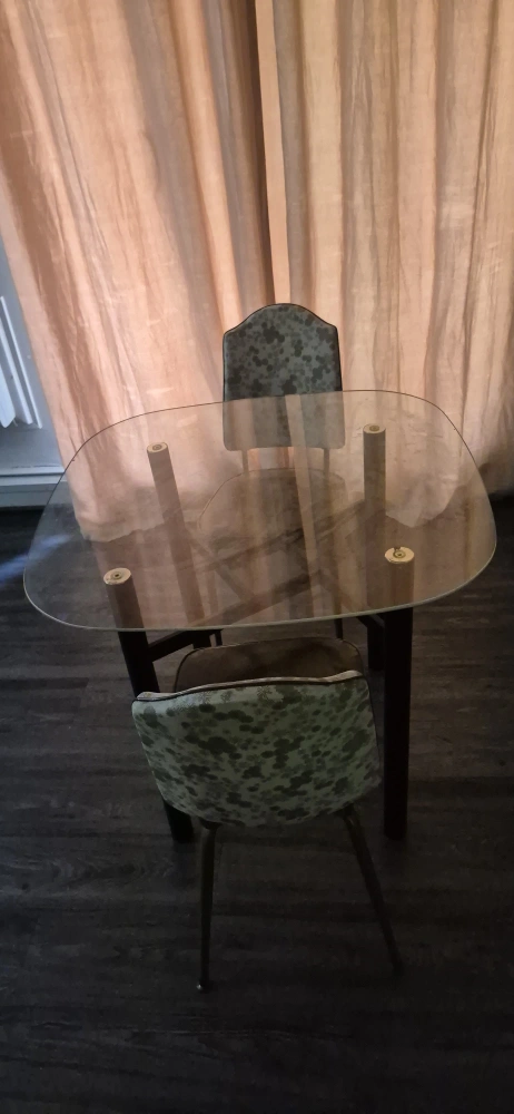 Selling a dining table with a glass top and two matching chairs. The chairs have a unique patterned fabric on the back and seat. The table has a simple, modern design that would fit well in a smaller dining area or kitchen