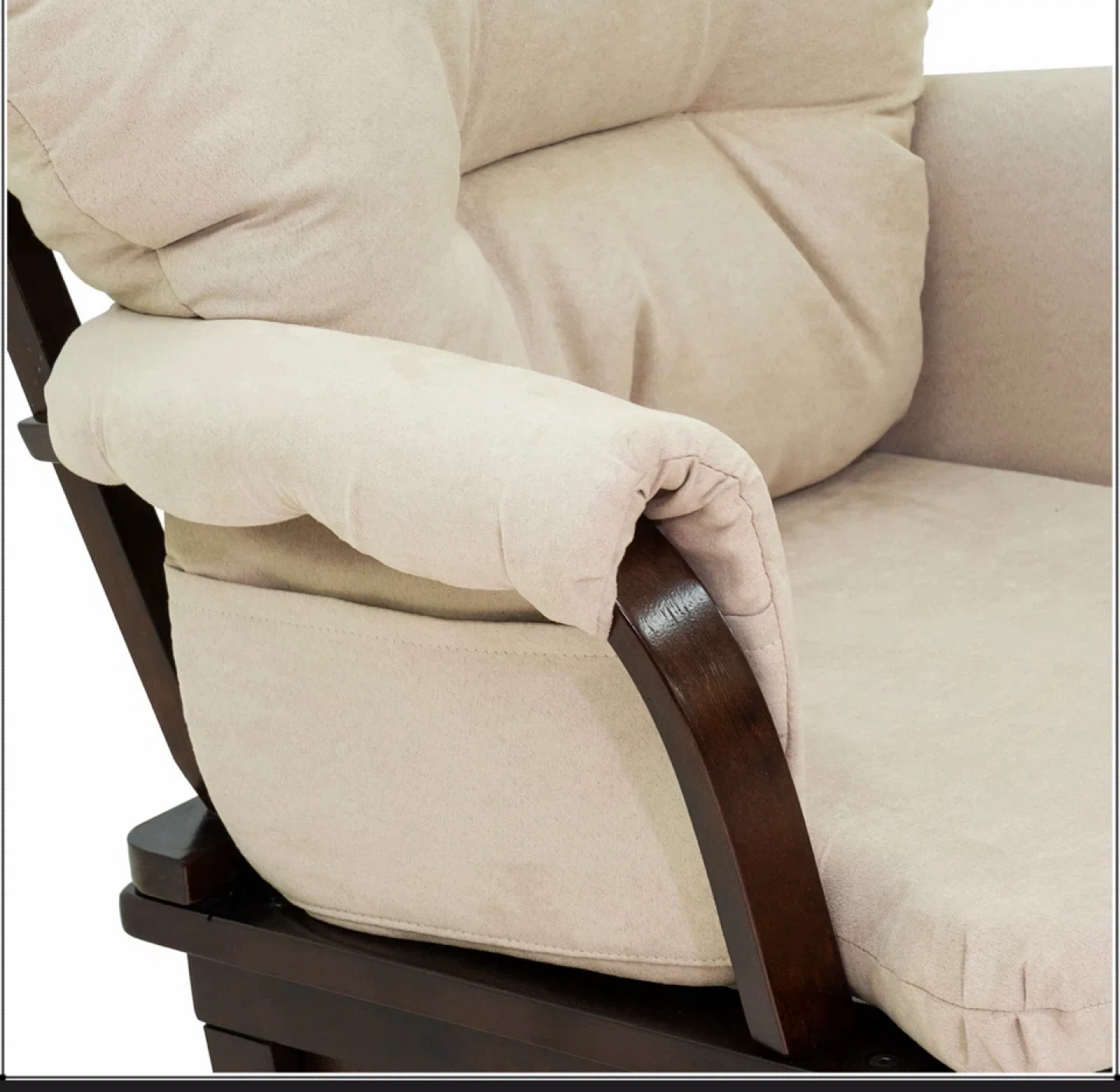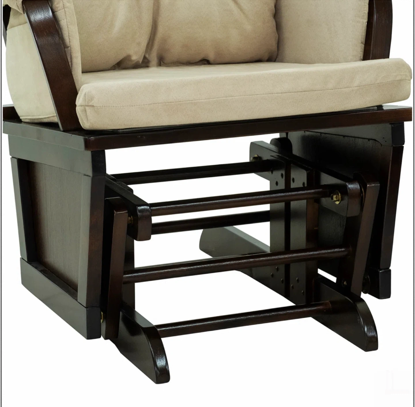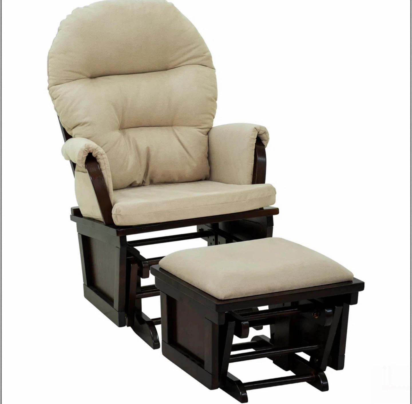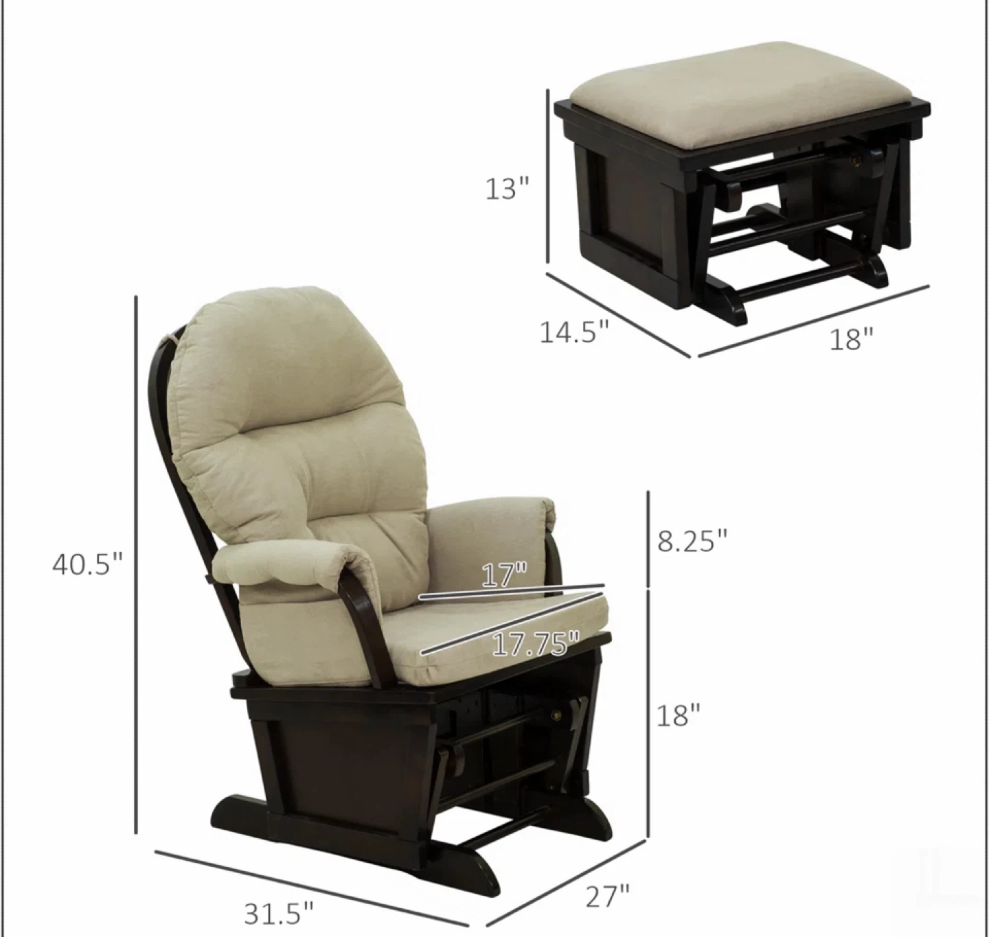 A comfy glider rocking chair with a matching ottoman. Perfect for relaxing! The chair measures approximately 40.5" in height, 31.5" in width, and 27" in depth. The ottoman is about 13" tall, 18" wide, and 14.5" deep. The cushions are a neutral beige colour.