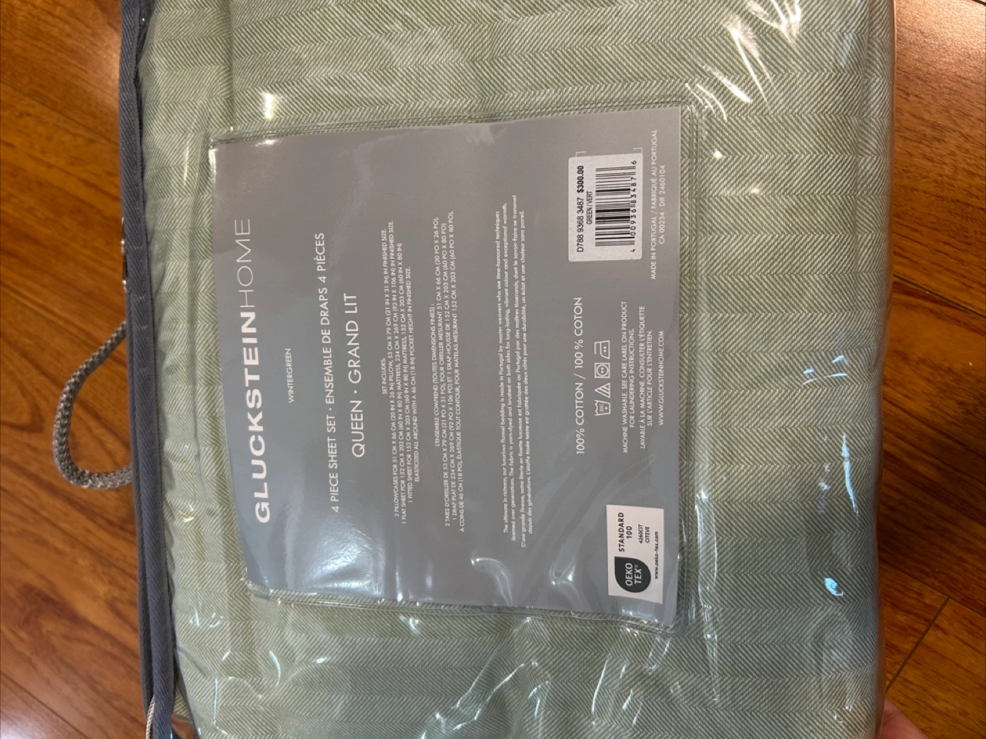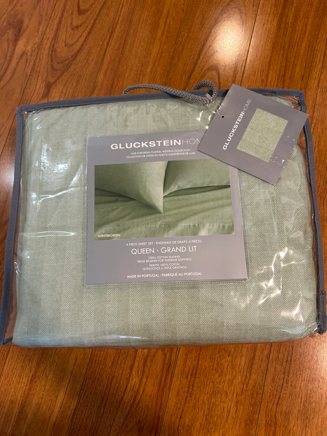 This is a brand new GlucksteinHome queen-size sheet set in the Wintergreen colour. It's a 4-piece set made from 100% cotton flannel for extra softness. The packaging says it features triple-brushed flannel. Originally bought for $300 plus tax