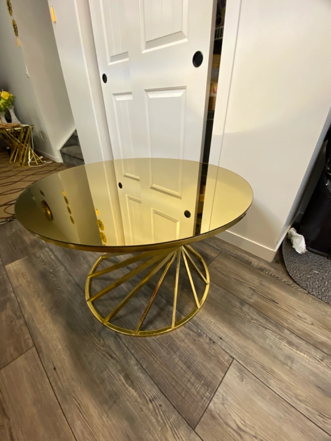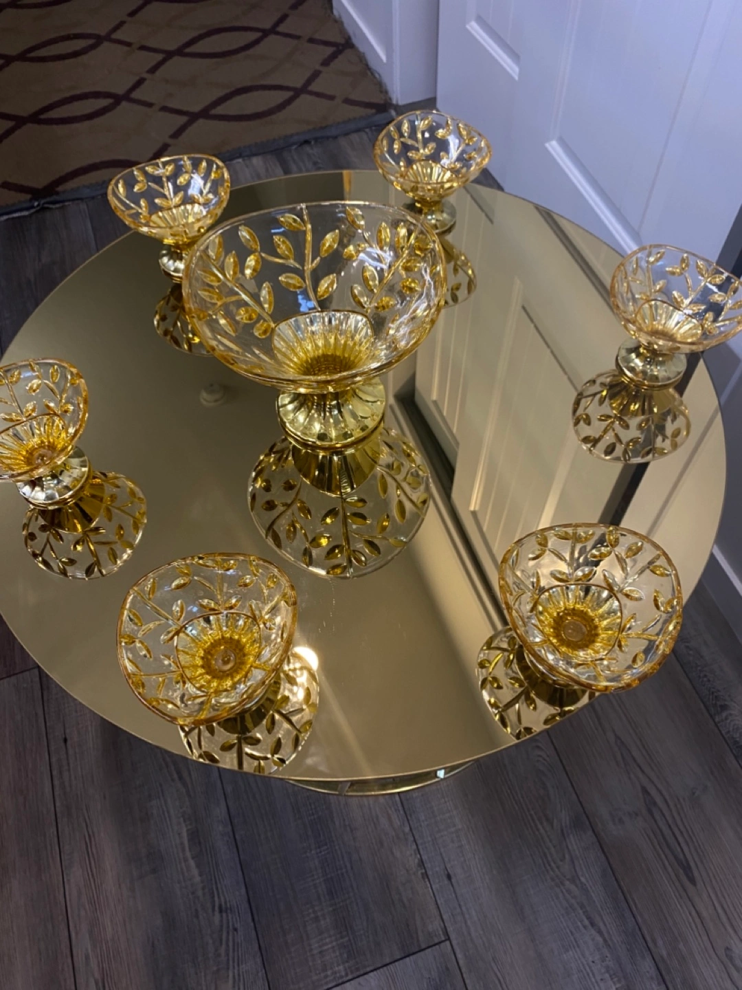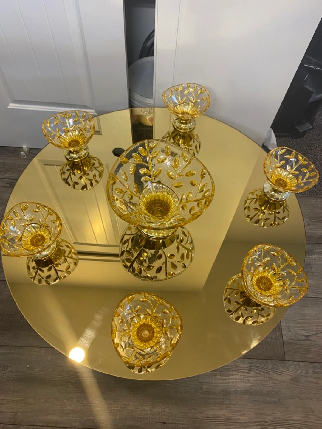 Selling a lovely gold coffee table that comes with a set of decorative bowls! It’s a beautiful piece that adds a touch of elegance to any living room. The bowls are perfect for displaying small items or just adding a decorative touch. It's in great condition and ready for a new home!