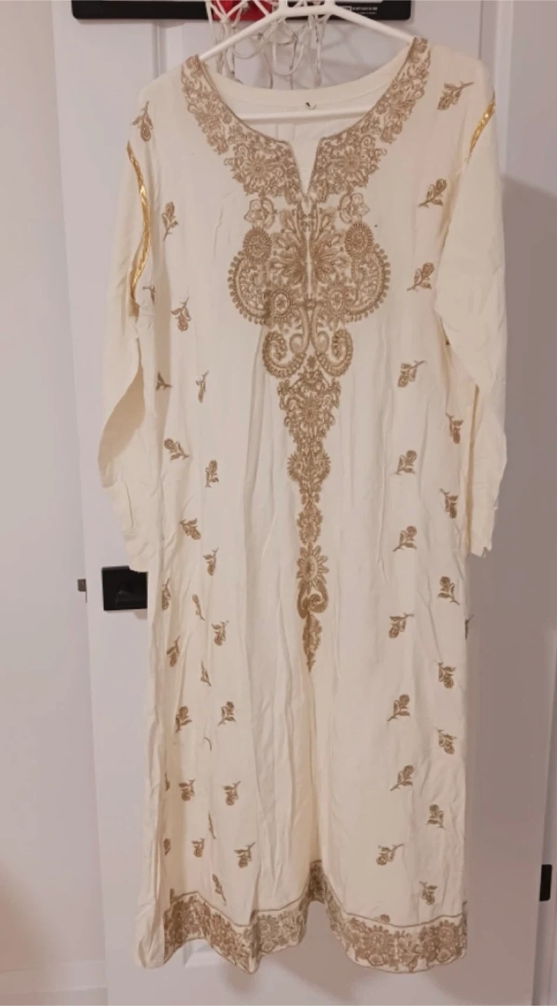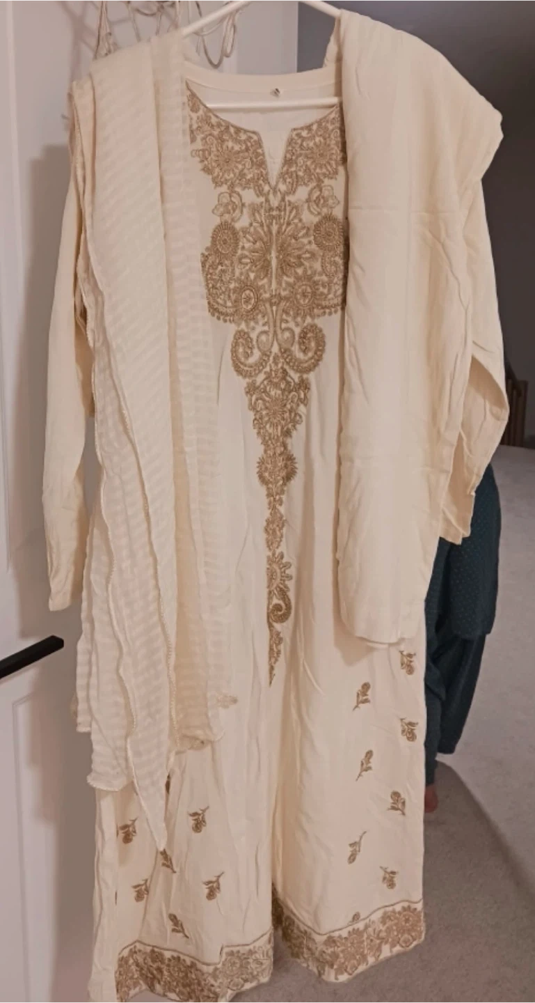 Selling a beautiful cream-coloured salwar kameez 3-piece suit with intricate gold embroidery. The fabric is lightweight and comfortable. Fully embroidered shirt.