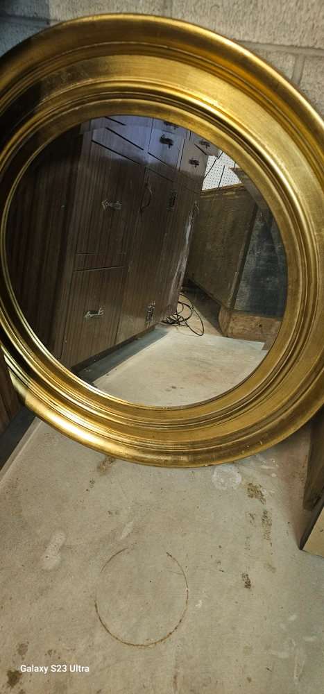 Selling a round mirror with a gold frame. It's in good condition and would look great in any room!
