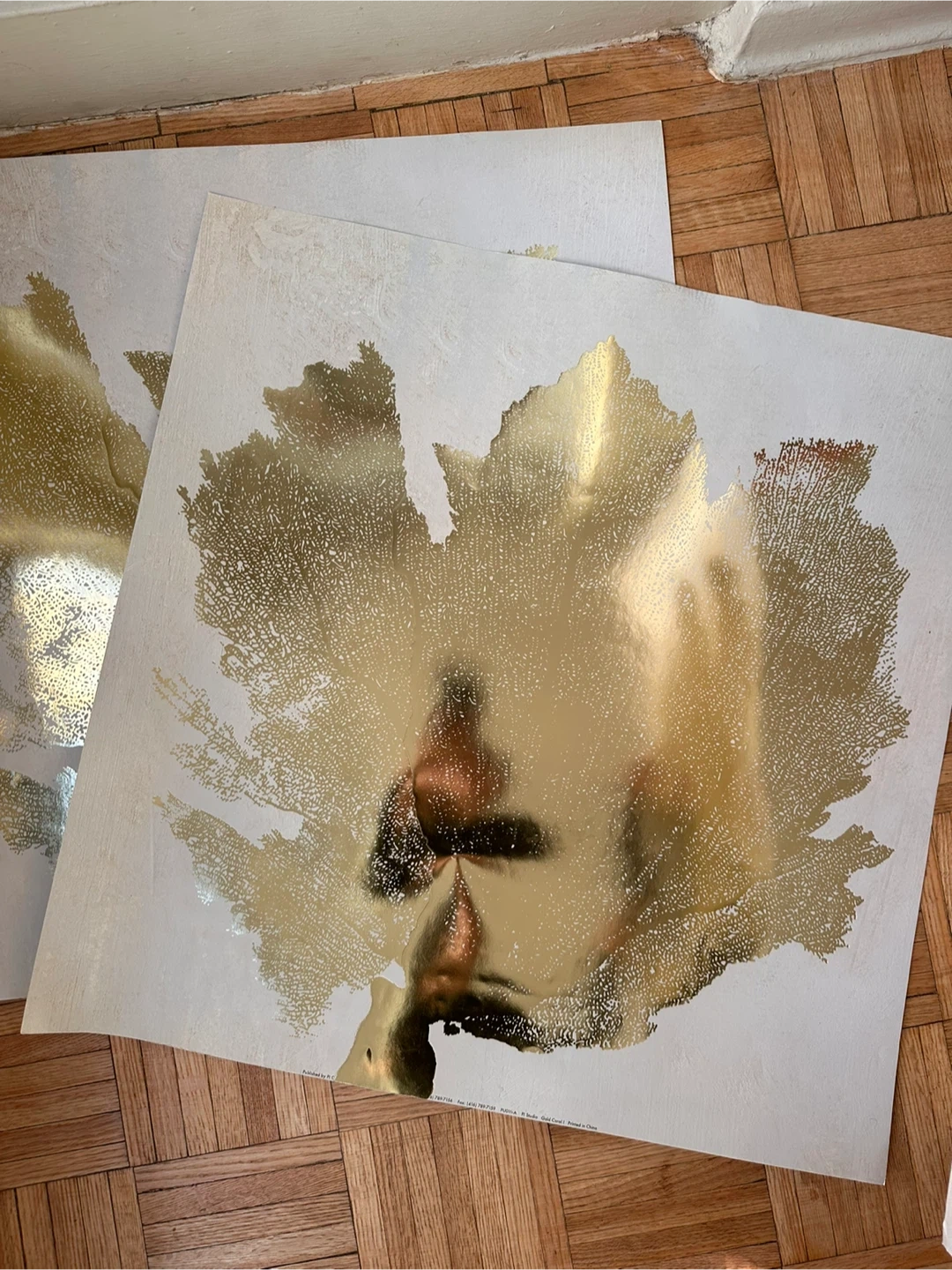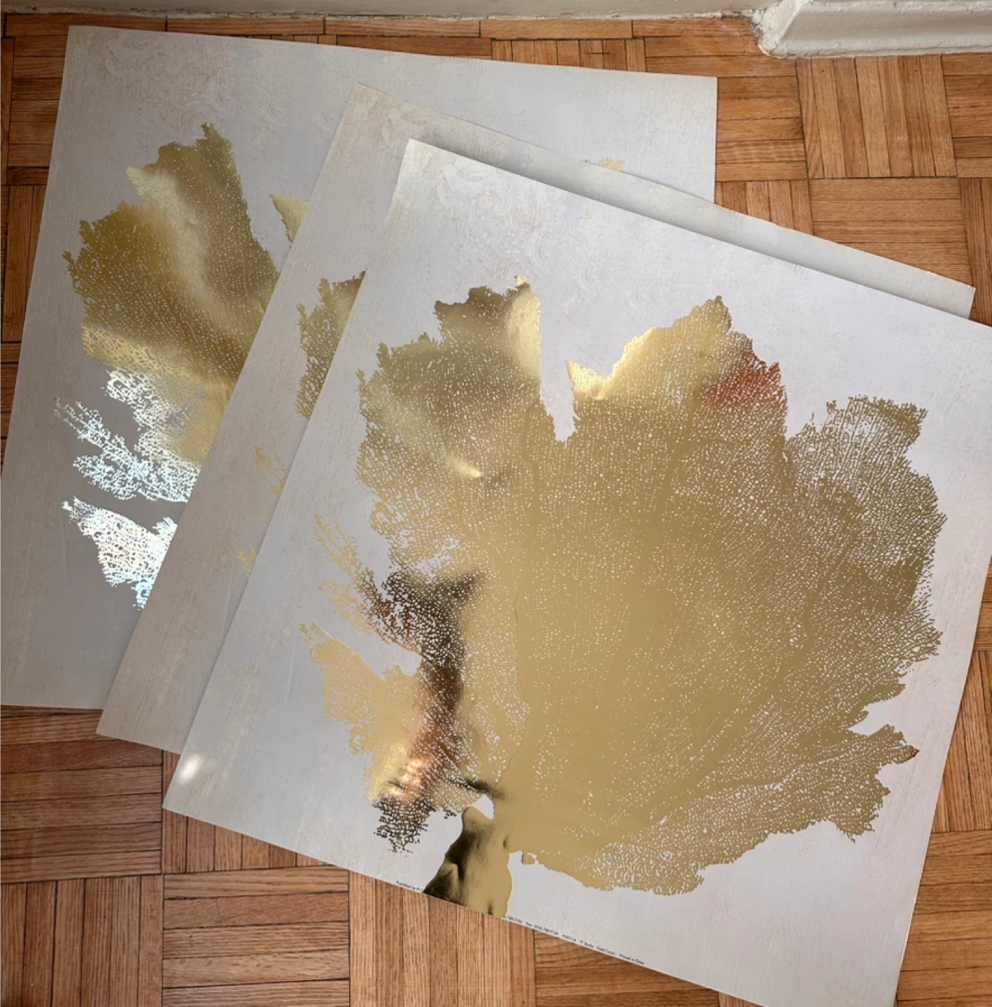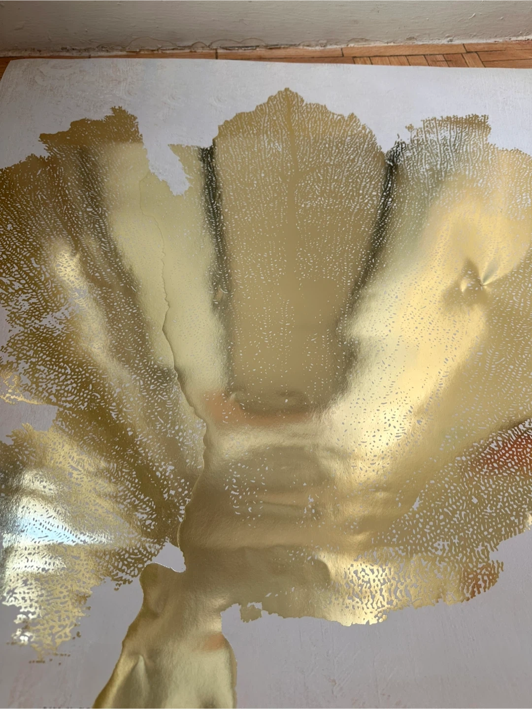 Selling a set of 3 gold leaf on paper wall art pieces. They have a beautiful, textured design that would add a touch of elegance to any room. Perfect for creating a statement wall or adding a subtle shimmer to your decor 27” x 27” Selling all together Pick up near Yonge and Bloor