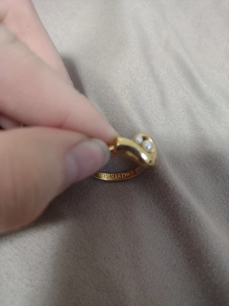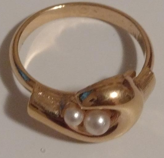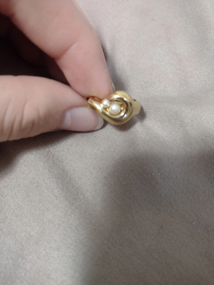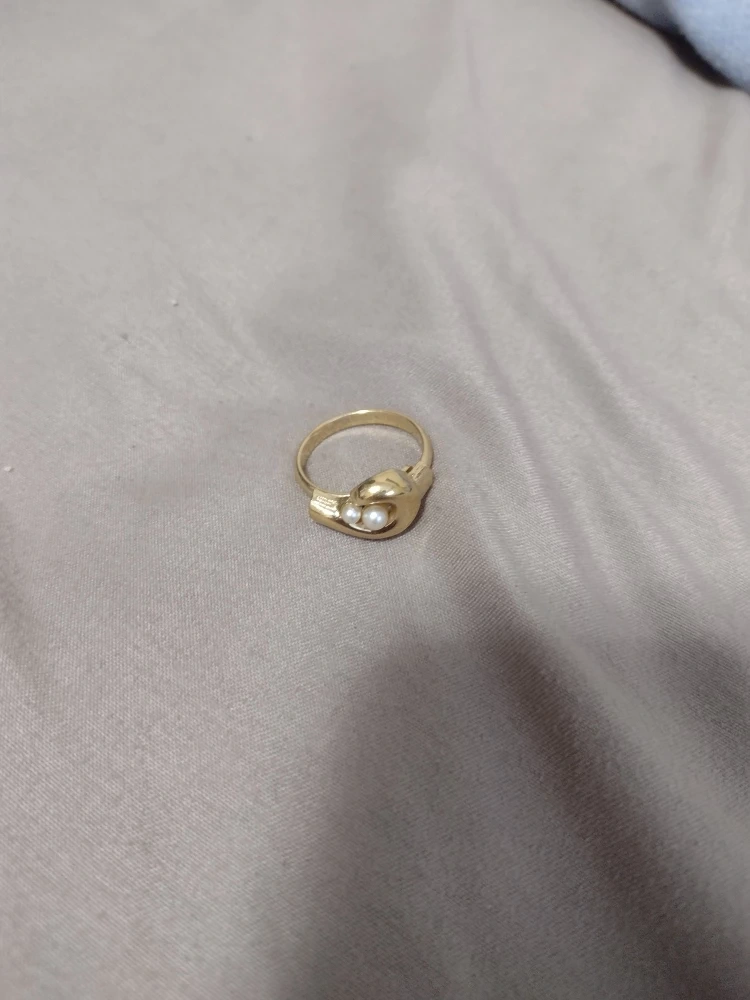 Selling a gold ring featuring two pearls. Ring is a size 4/5.