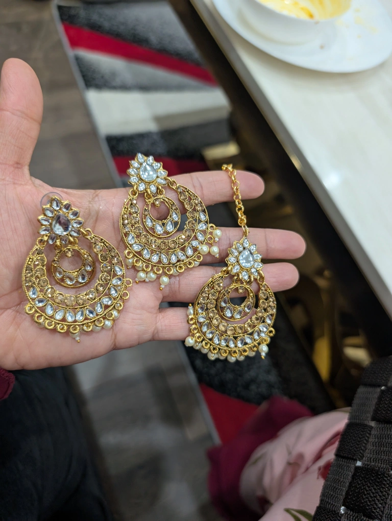 Beautiful gold-tone earrings and tikka set, perfect for special occasions or adding a touch of elegance to your everyday look. These are in great condition and ready to be loved by someone new!