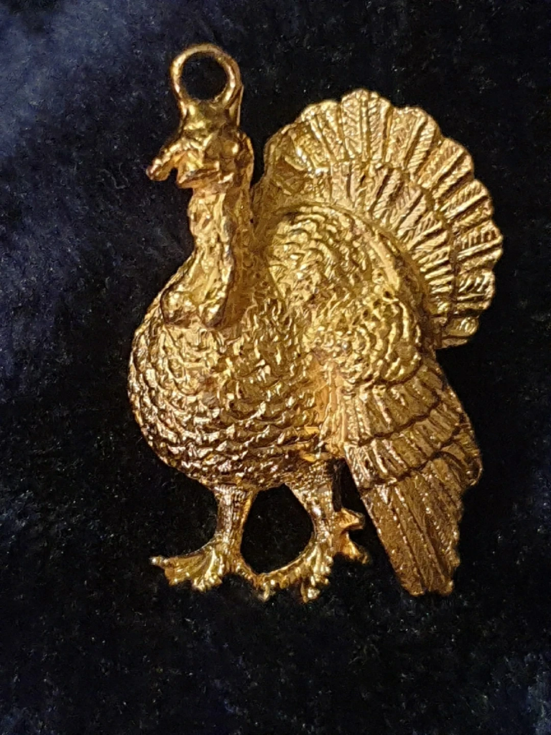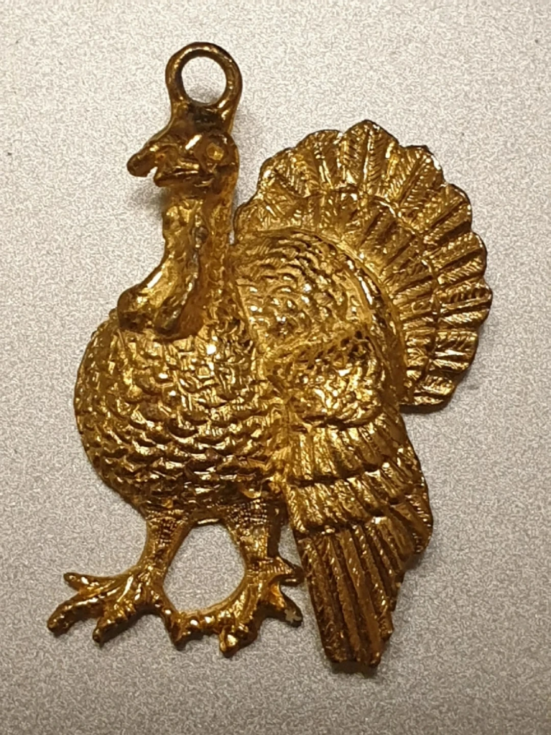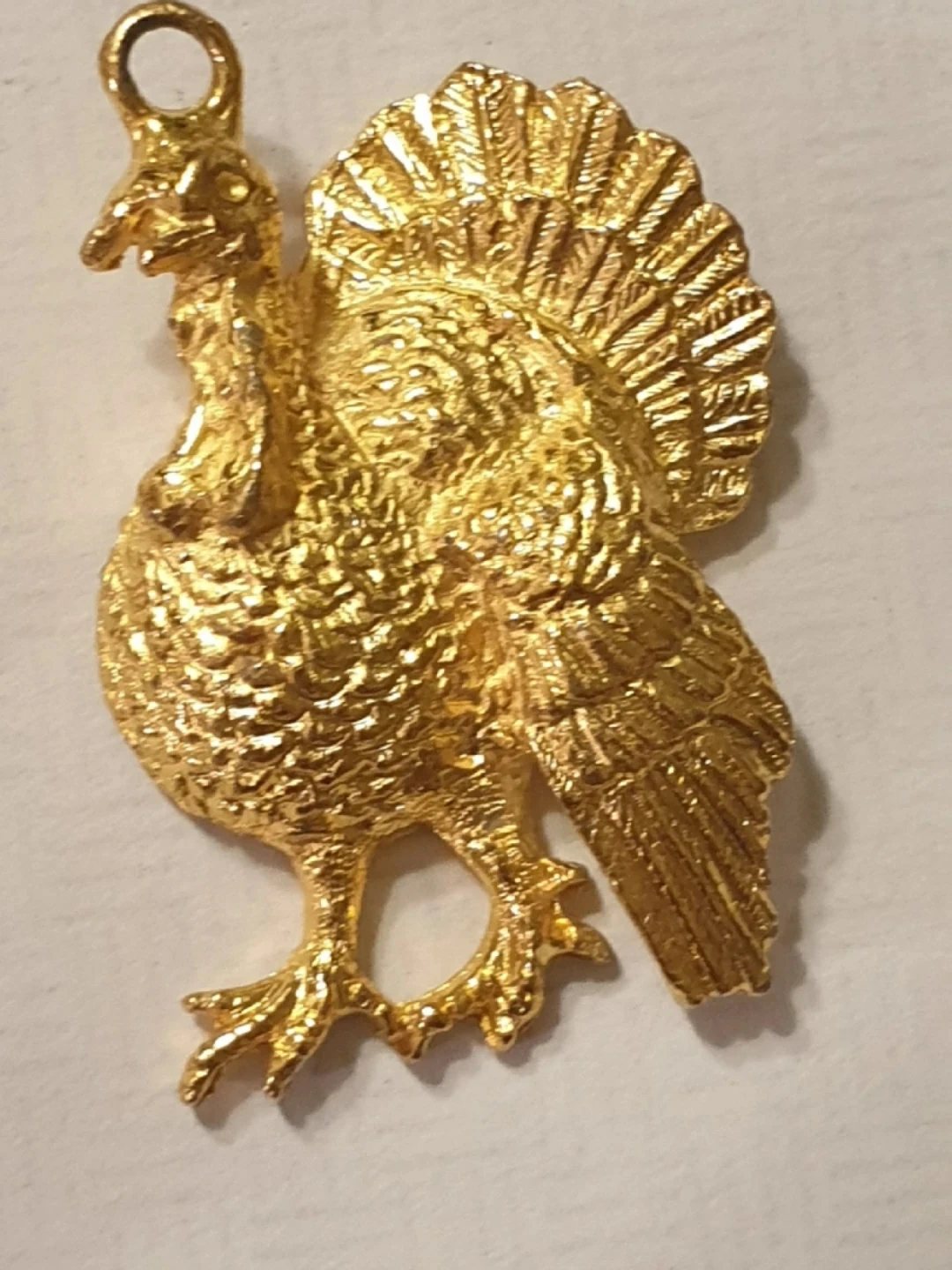 Selling a vintage yet in new condition gold-tone turkey pendant. It's a unique piece that would make a great addition to any collection or as a festive accessory To be picked up in Scarborough item #6479381940