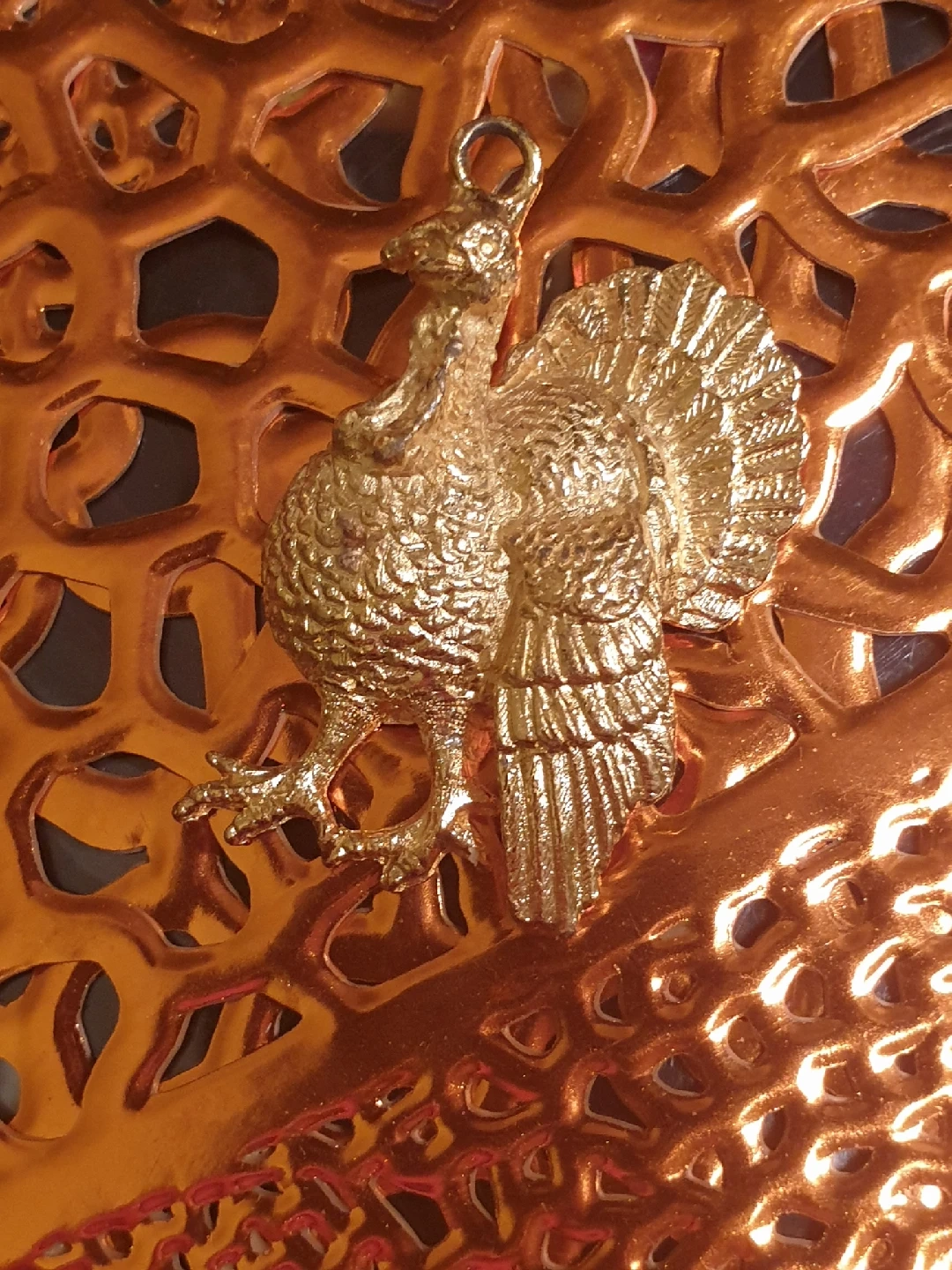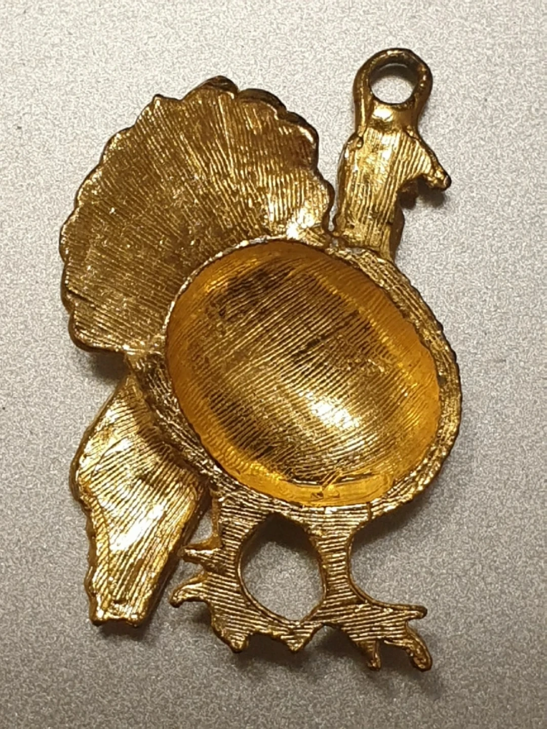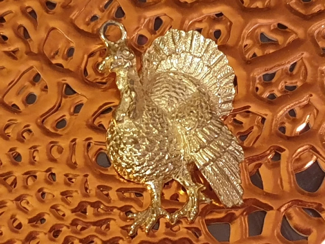 Selling a vintage yet in new condition gold-tone turkey pendant. It's a unique piece that would make a great addition to any collection or as a festive accessory To be picked up in Scarborough item #6479381940