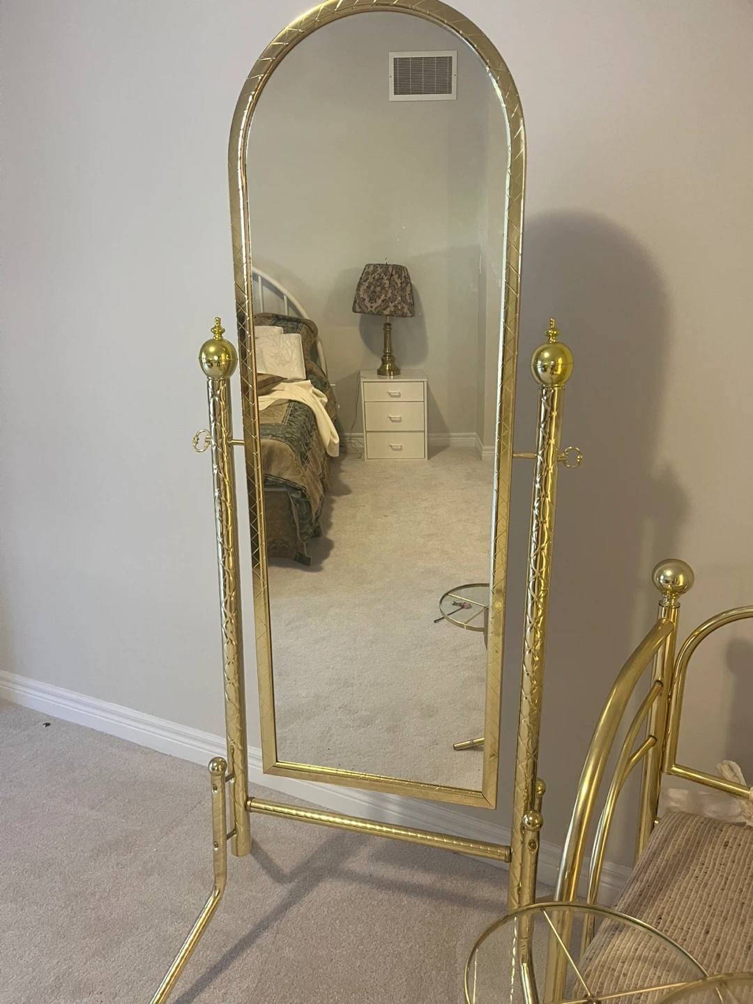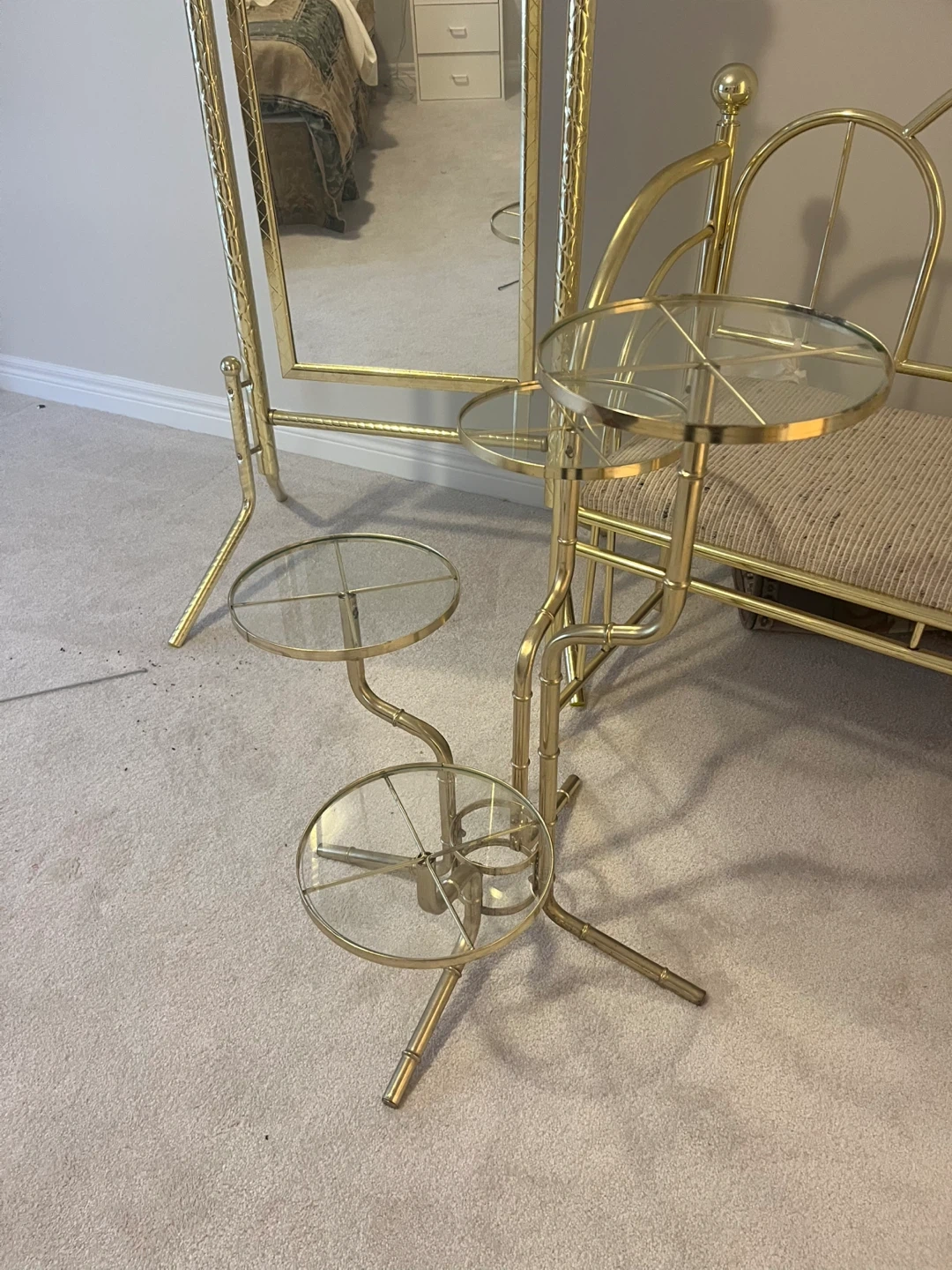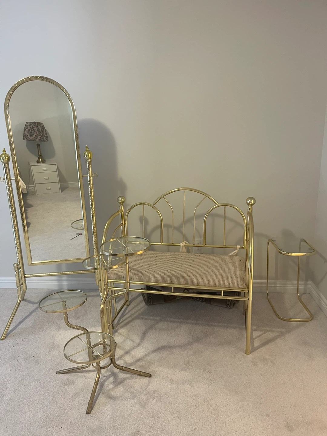 Selling a charming gold-toned vanity set! It includes a full-length mirror with a stand, a cozy bench with a patterned cushion, and a unique plant stand with glass shelves. Perfect for adding a touch of vintage elegance to any room