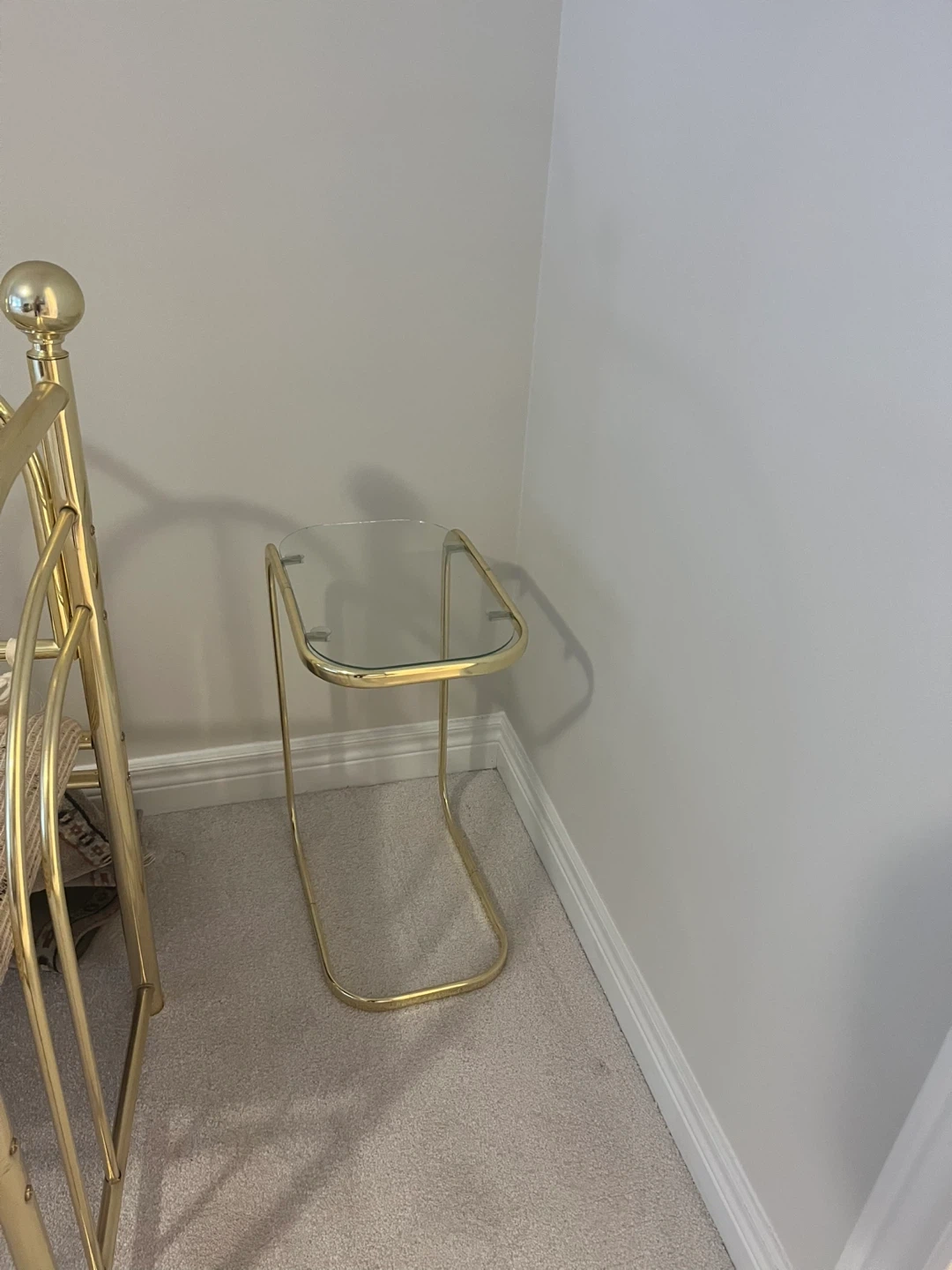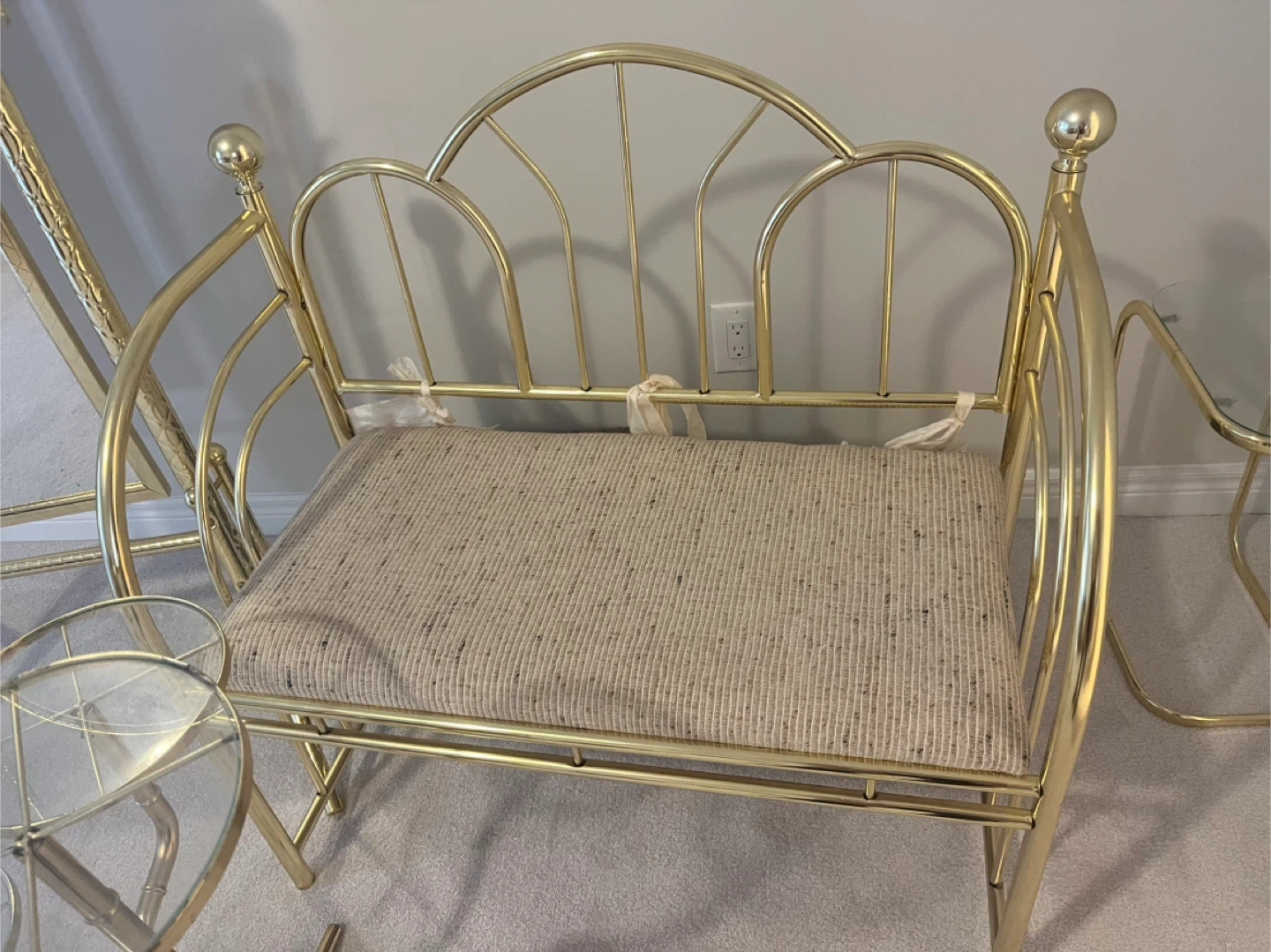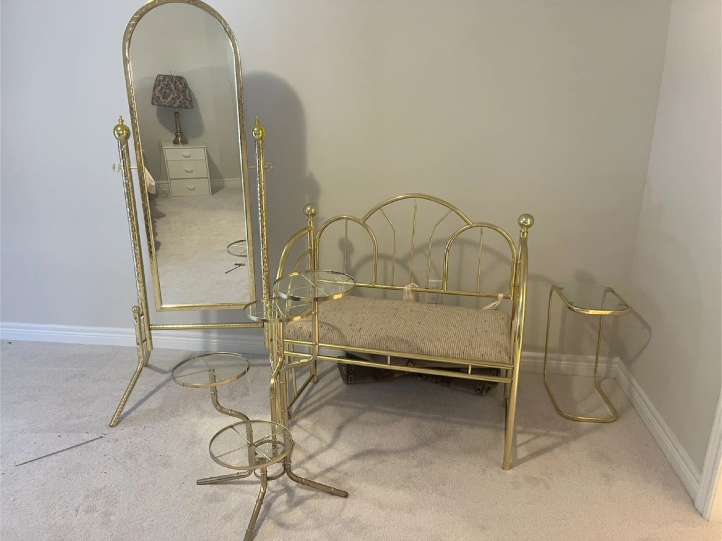 Selling a charming gold-toned vanity set! It includes a full-length mirror with a stand, a cozy bench with a patterned cushion, and a unique plant stand with glass shelves. Perfect for adding a touch of vintage elegance to any room