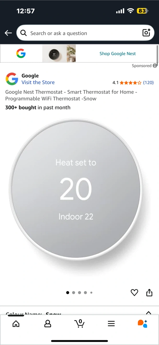 Smart and energy-efficient thermostat that lets you control the temperature of your home from anywhere using your phone. Sleek, modern design in Snow (white) color. Easy to install and use Compatible with most HVAC systems Control via the Google Home app or voice assistants (Google Assistant, Alexa) Helps save energy with automatic adjustments and eco mode Programmable scheduling and remote access Great for smart home setups