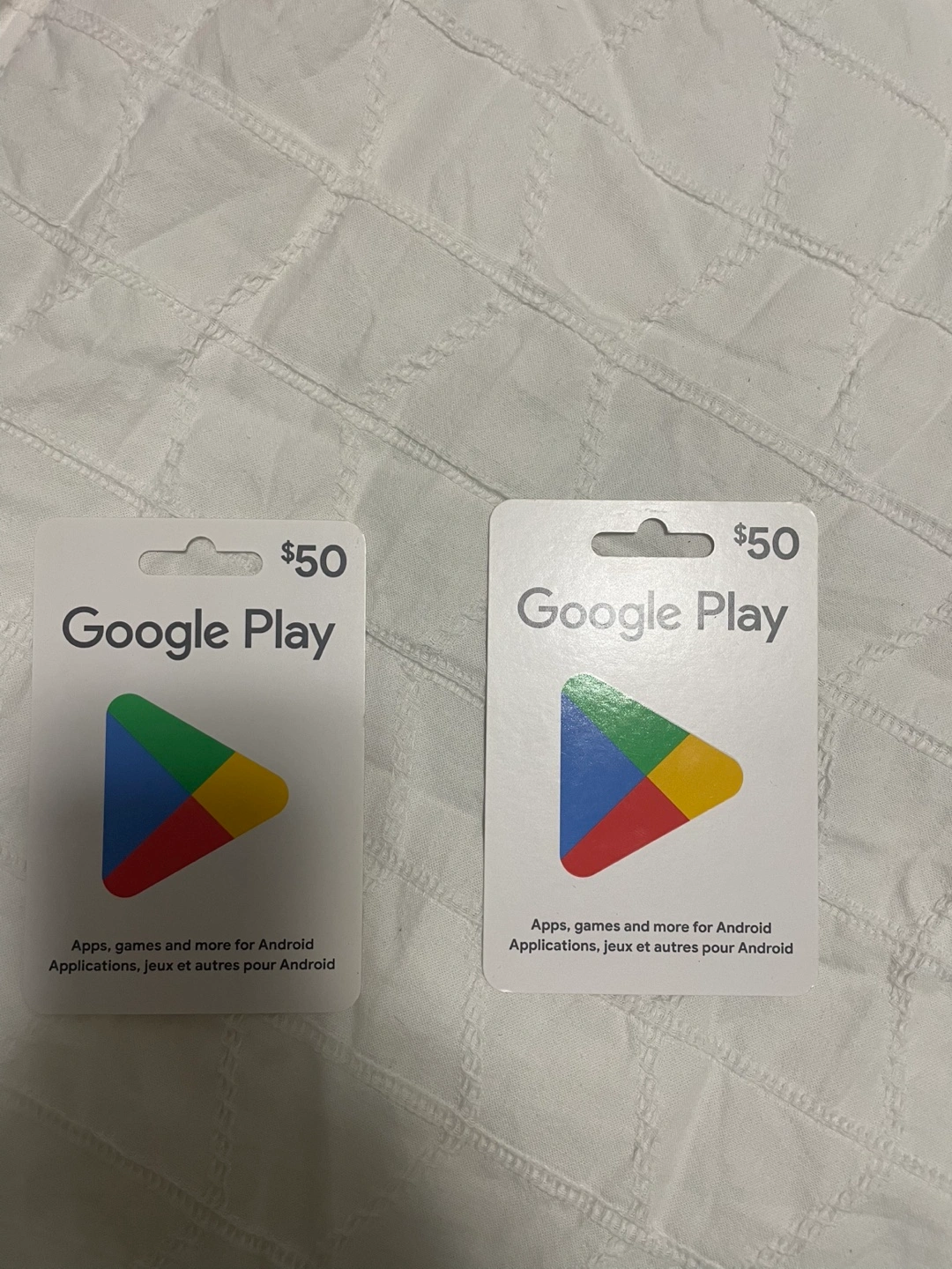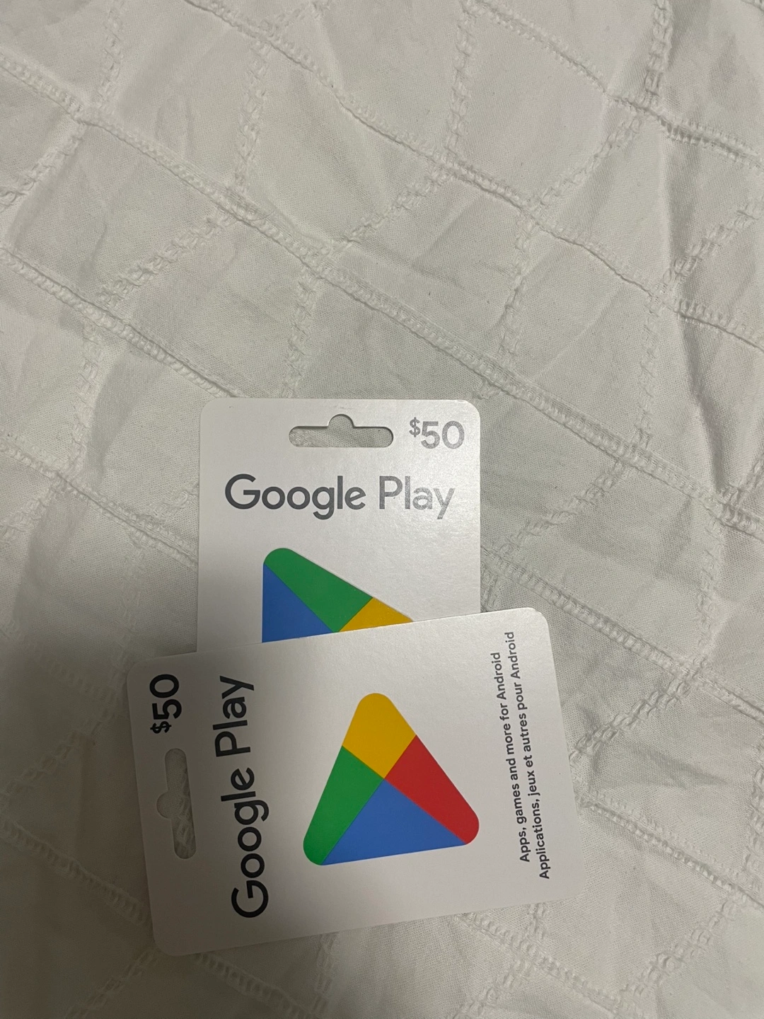 I have two Google Play giftcards, each with a value of $50. Perfect for apps, games, and more for Android