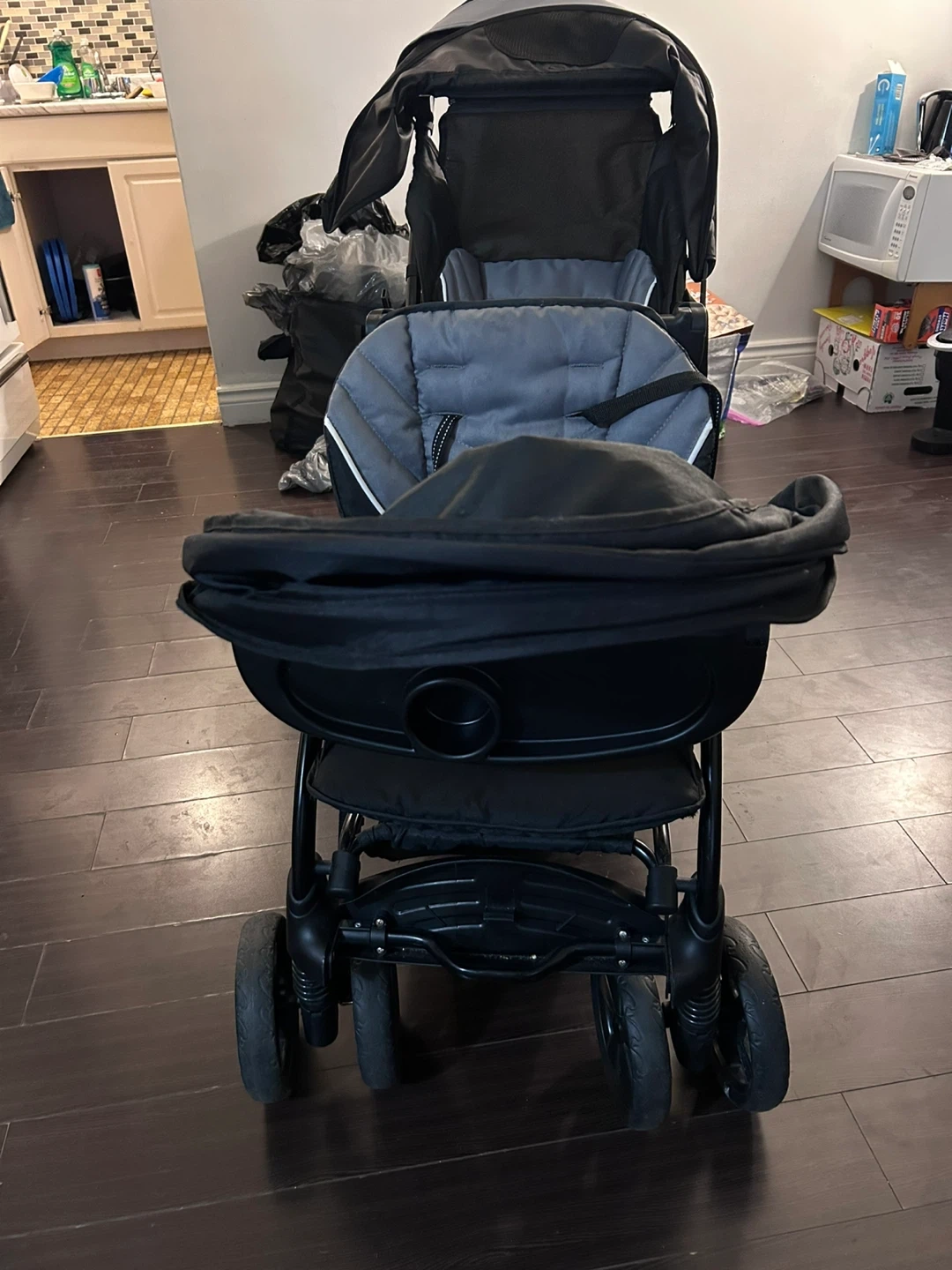 Selling a Graco car seat and stroller bundle! Includes a Graco car seat, a black stroller with a grey interior, and a smaller stroller with a fun flamingo and cactus pattern. All items are in good condition and ready for a new home!