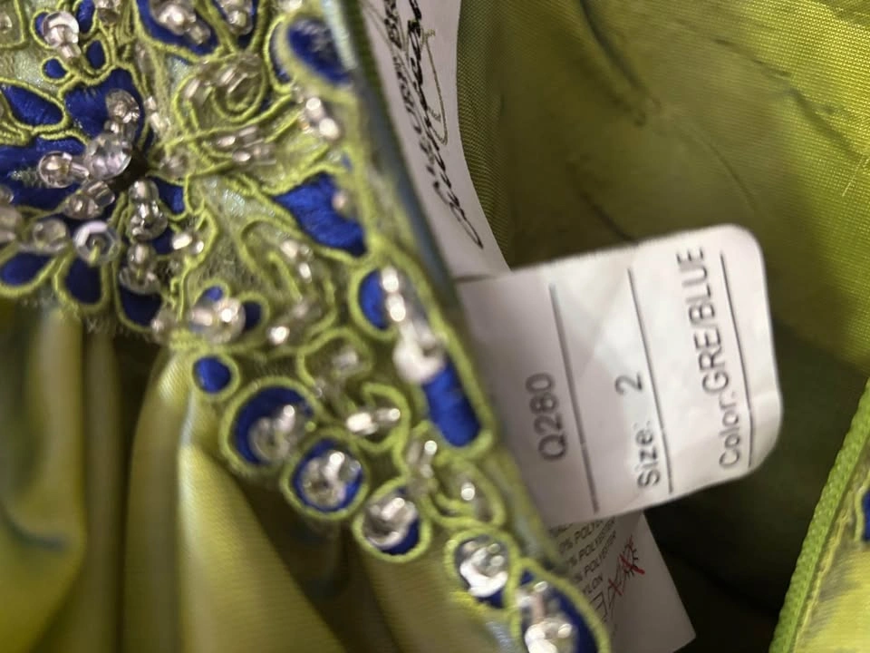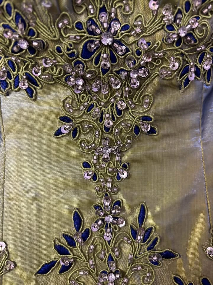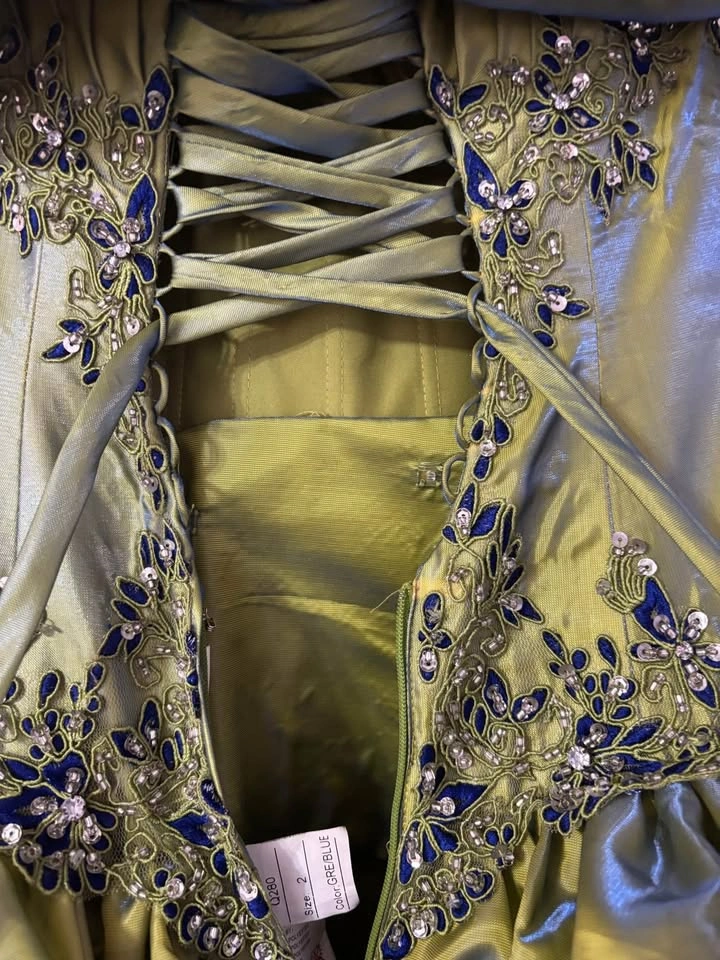 Beautiful blue/green shimmering dress. Corset back. Hand sewn bead. Size 2.