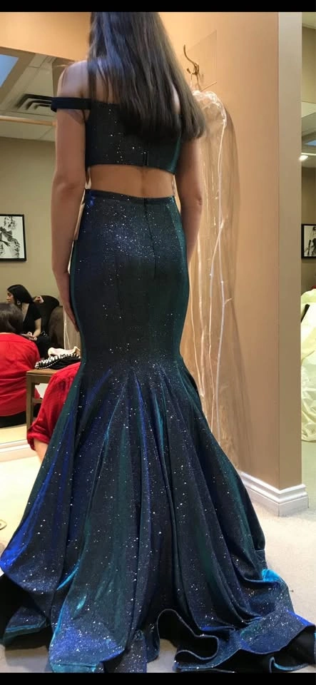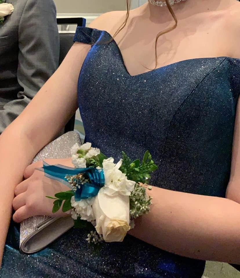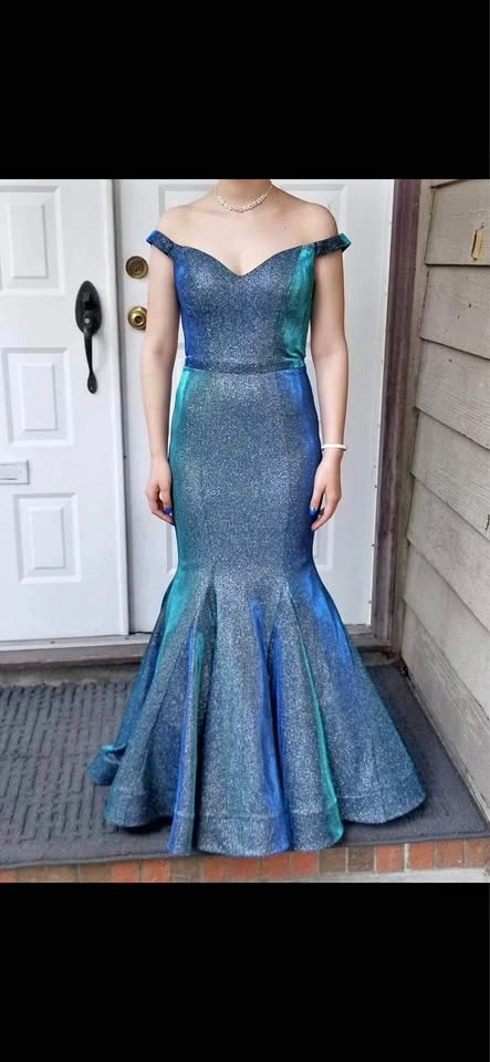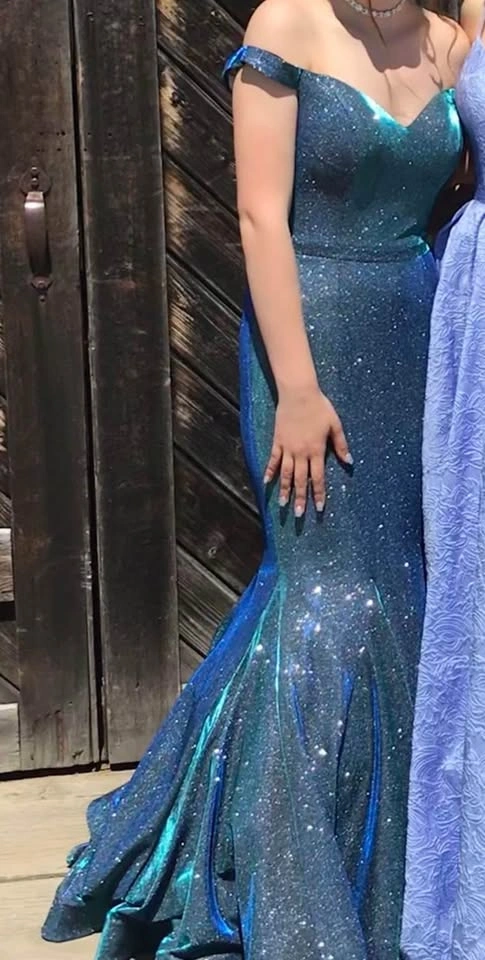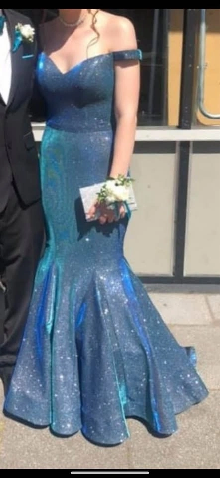 Beautiful sparkly blue grad dress for sale. Size 6, altered length for 5’9” height. Only worn for a few hours. In perfect condition.