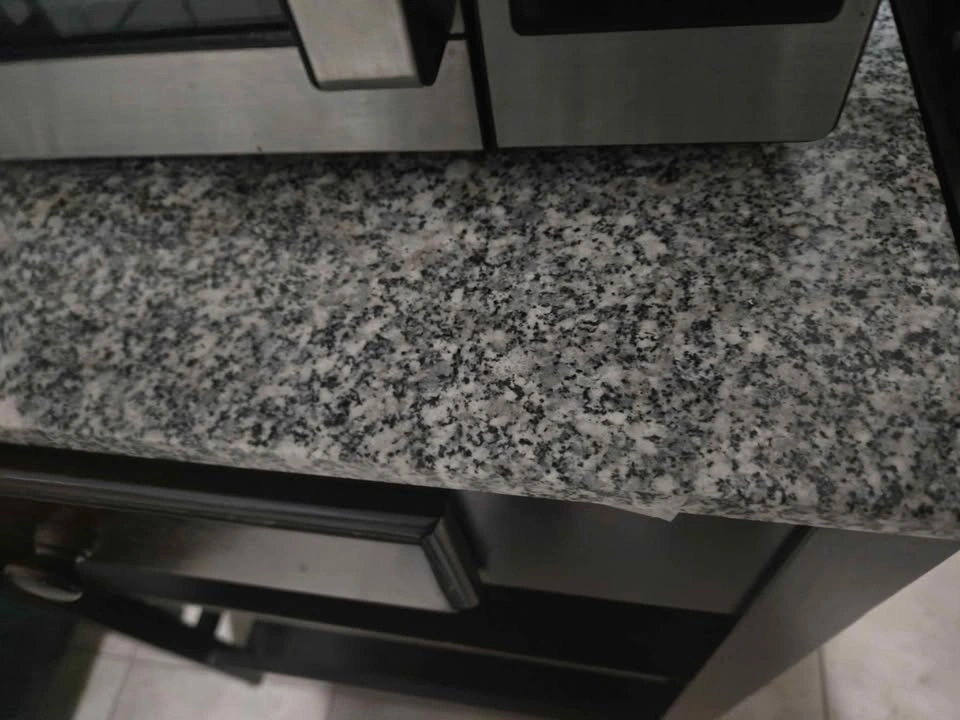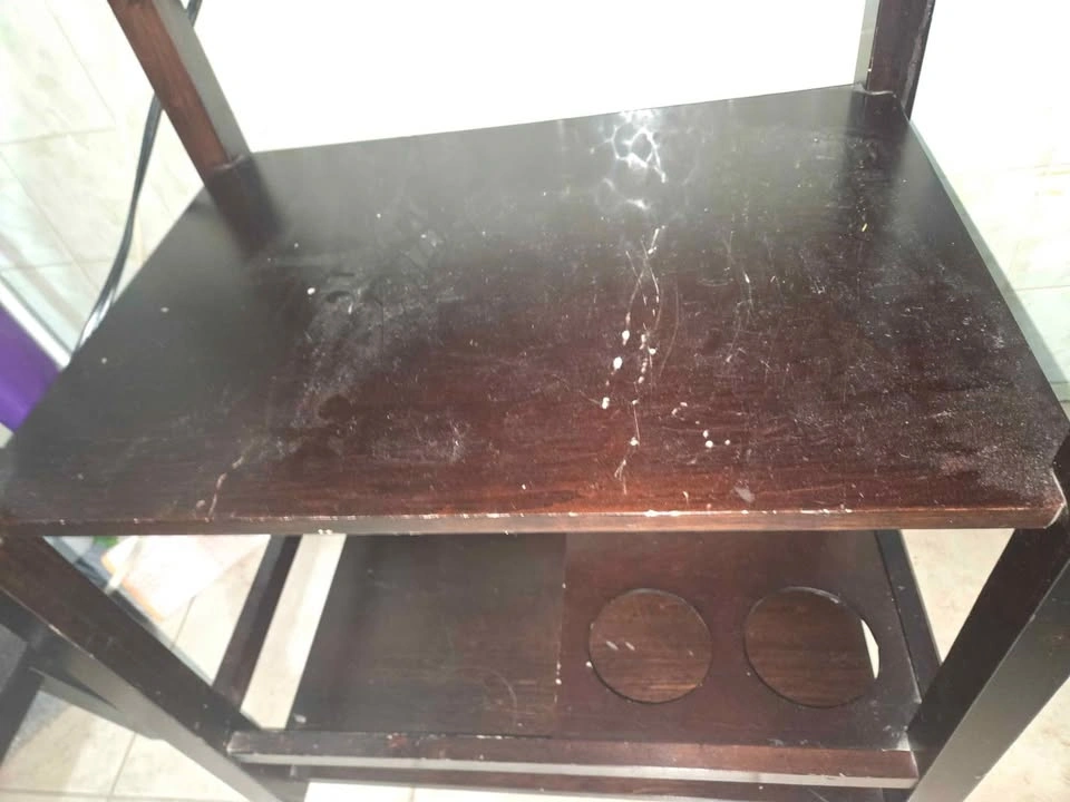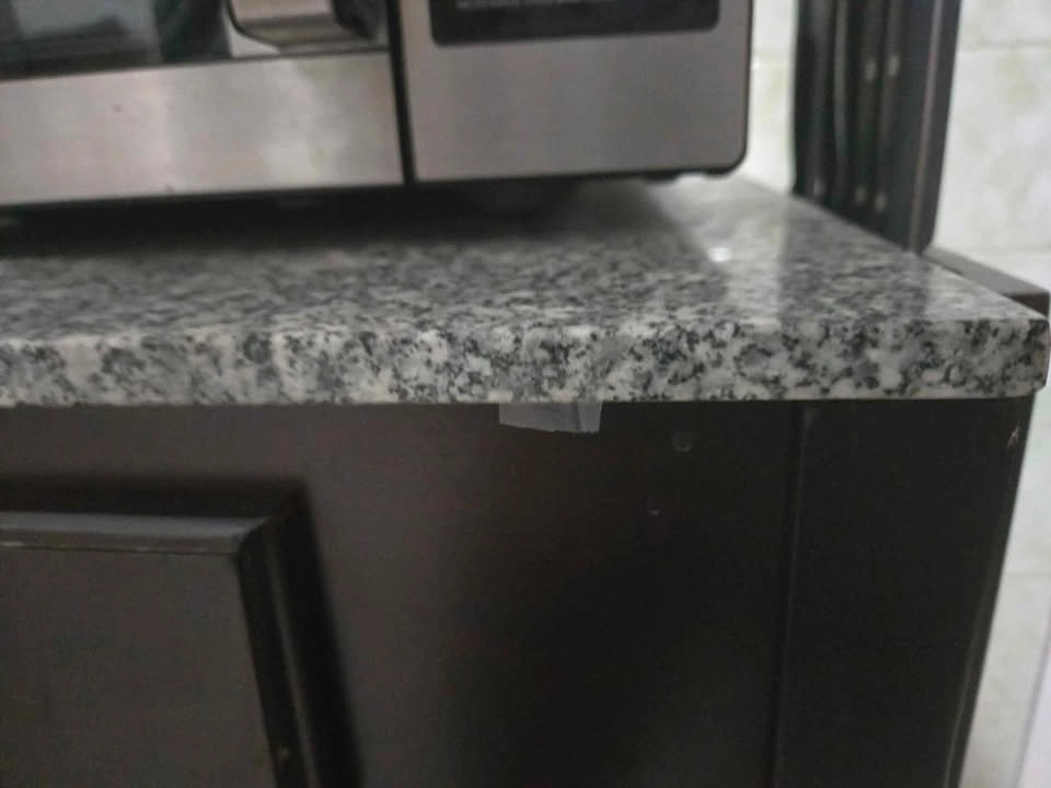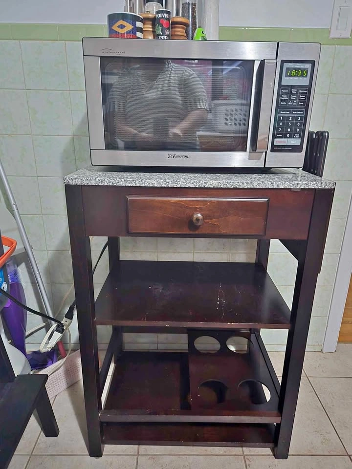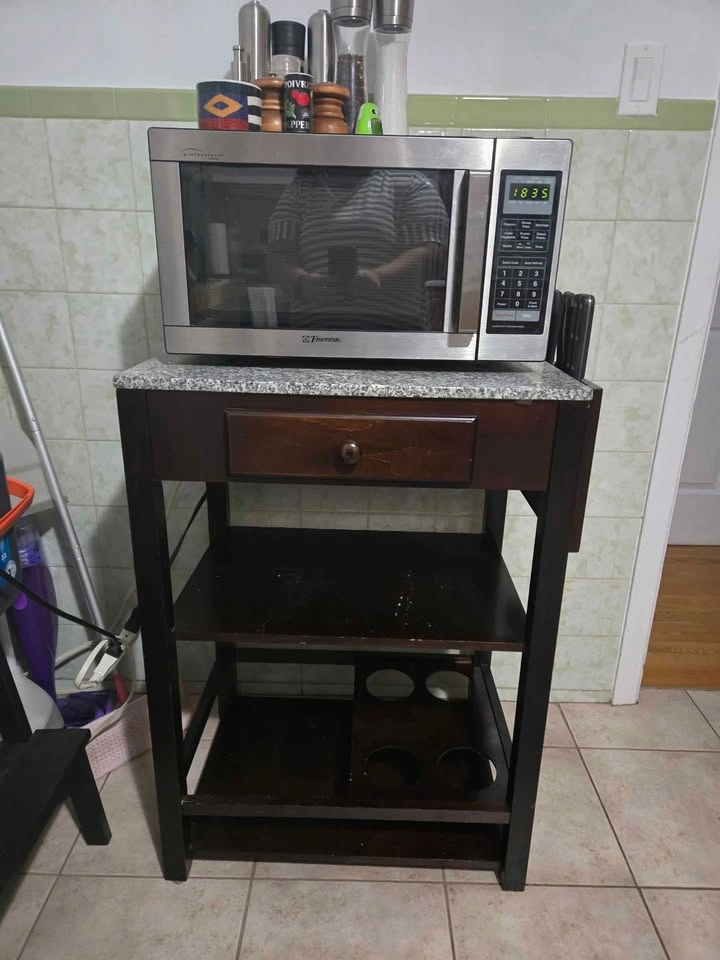 Small kitchen island. Dark brown wood, granite top. No wheels. 26 long x 18 deep x 34 tall Small scratches on the shelf underneath. Has 4 wine bottle holders on lower shelf. Very sturdy. Pick up only. Carlingwood area.