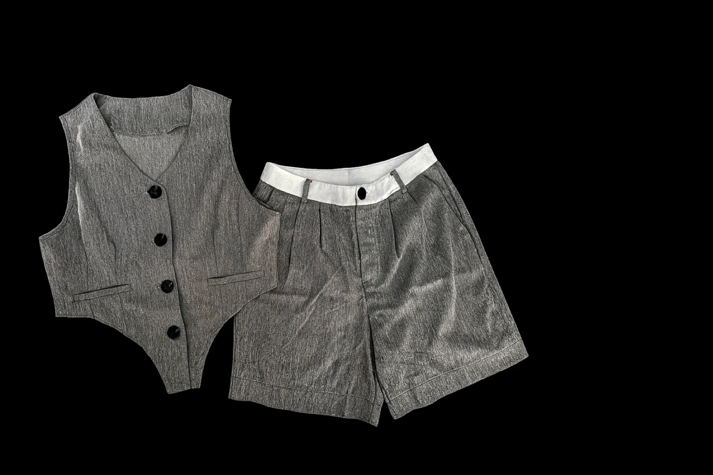 A cute gray vest and shorts set! The vest has button closures and small pockets, while the shorts feature a white waistband and a single button closure. Perfect for a stylish and coordinated look