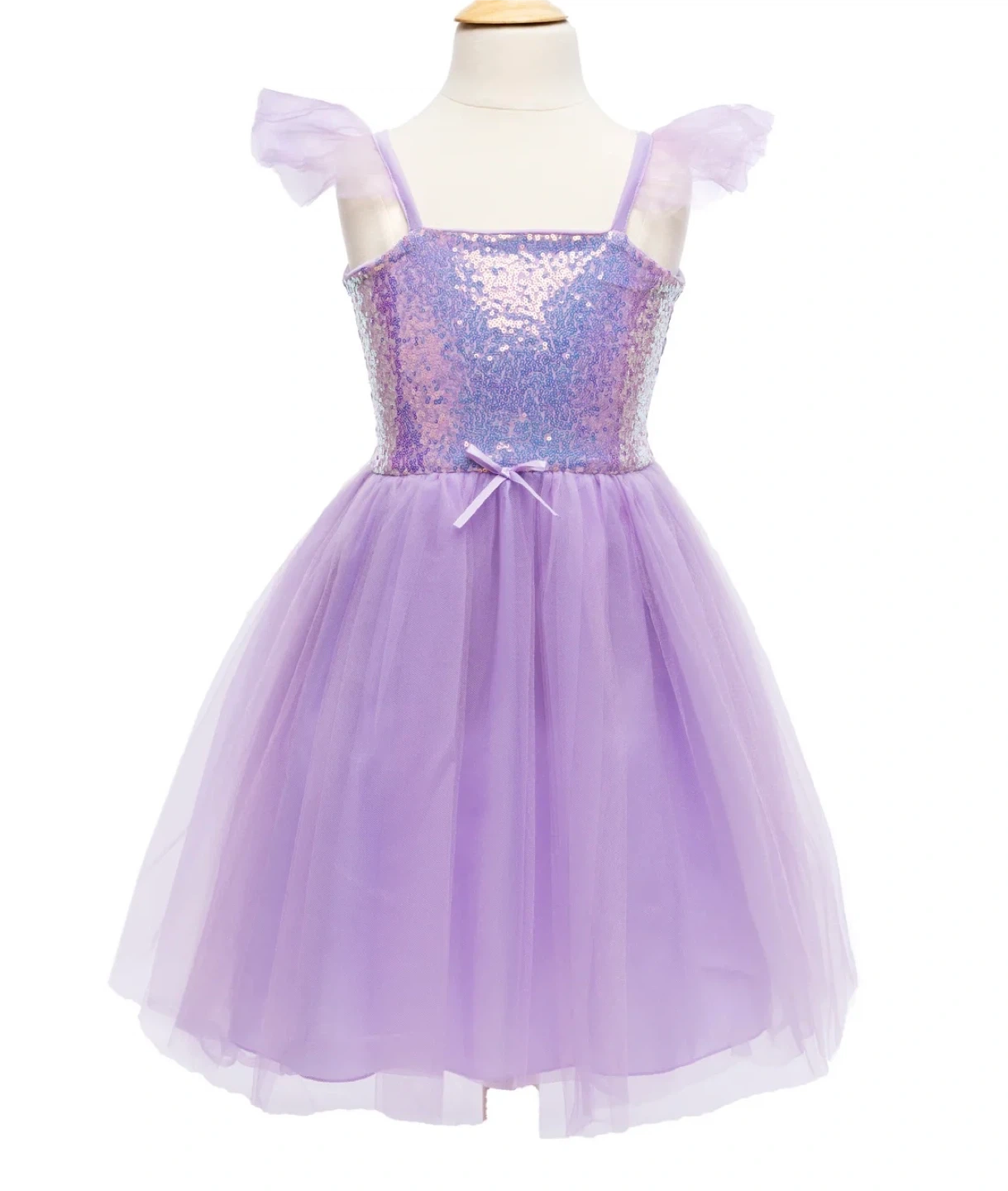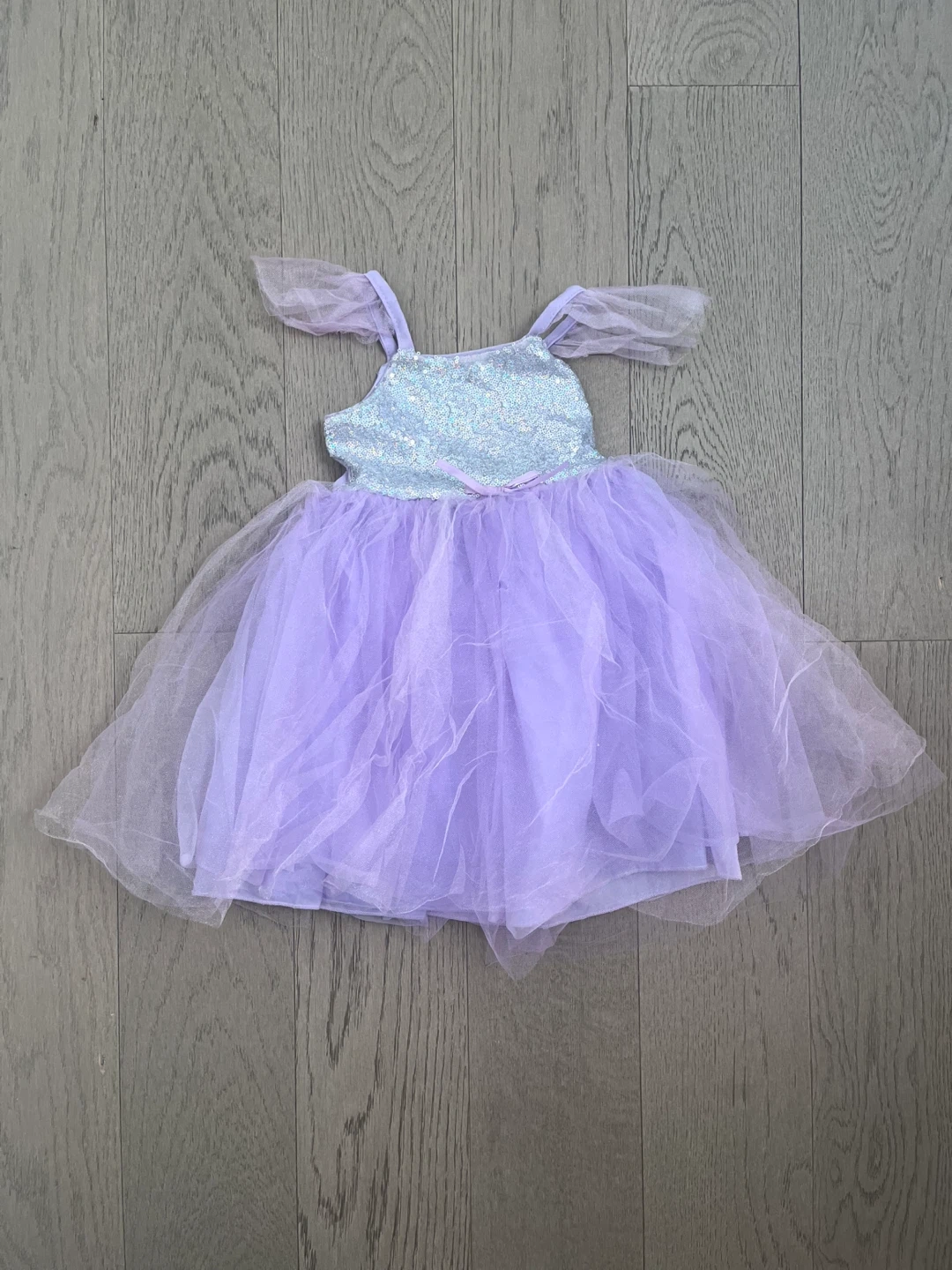 A cute purple dress from Great Pretenders! Made in Canada! Some sequins are missing and the tulle is slightly damaged in the front but still great for playing dress-up.