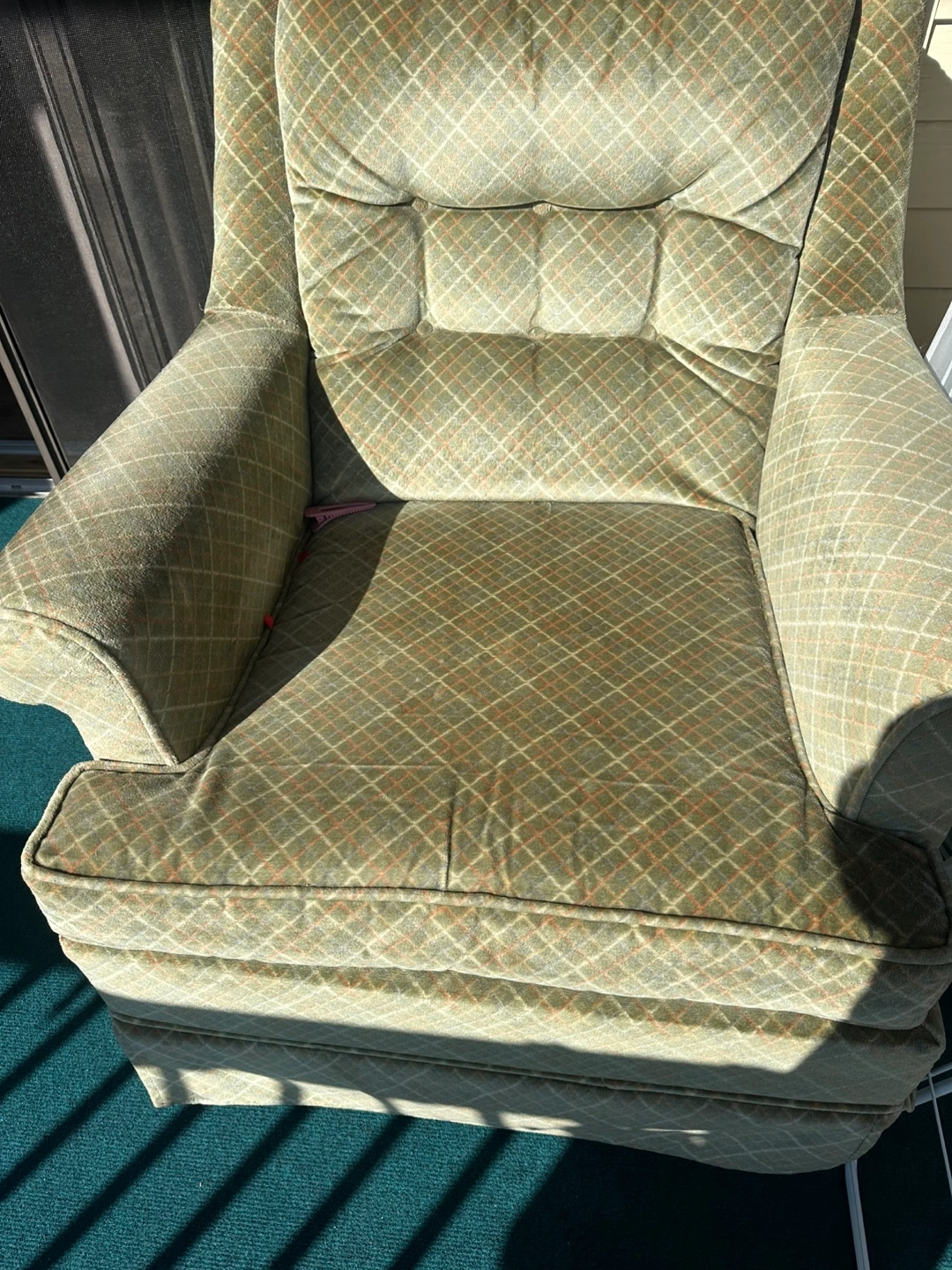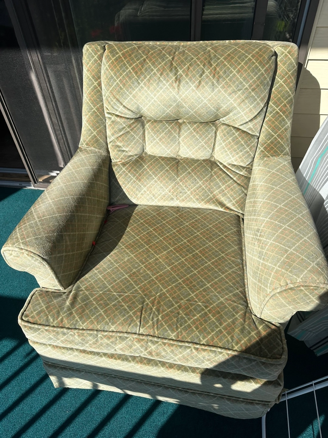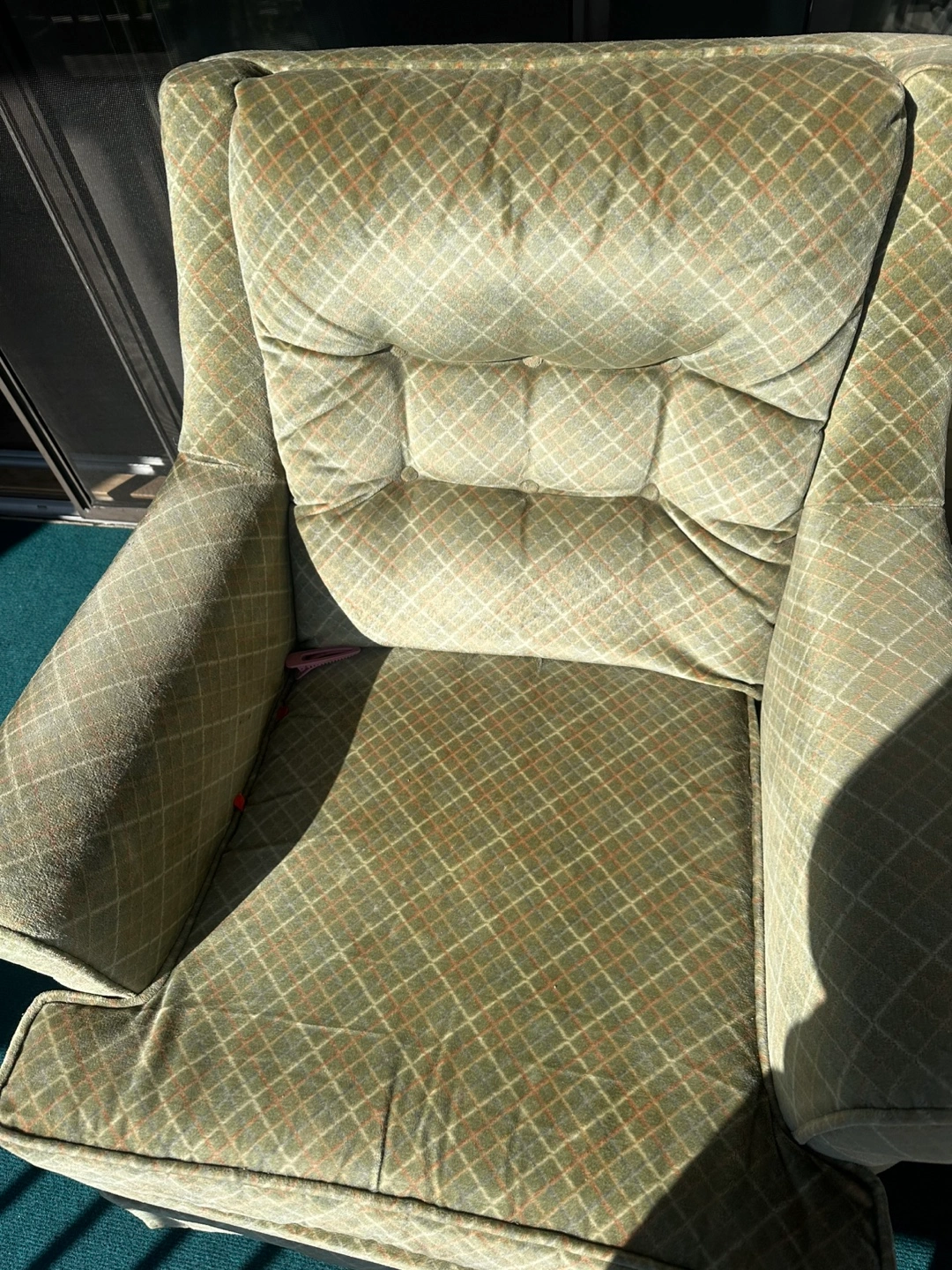 Selling a comfy green armchair! It's in good condition and perfect for a cozy reading nook or living room. The fabric has a nice texture and the cushions are plush. It's ready for a new home!