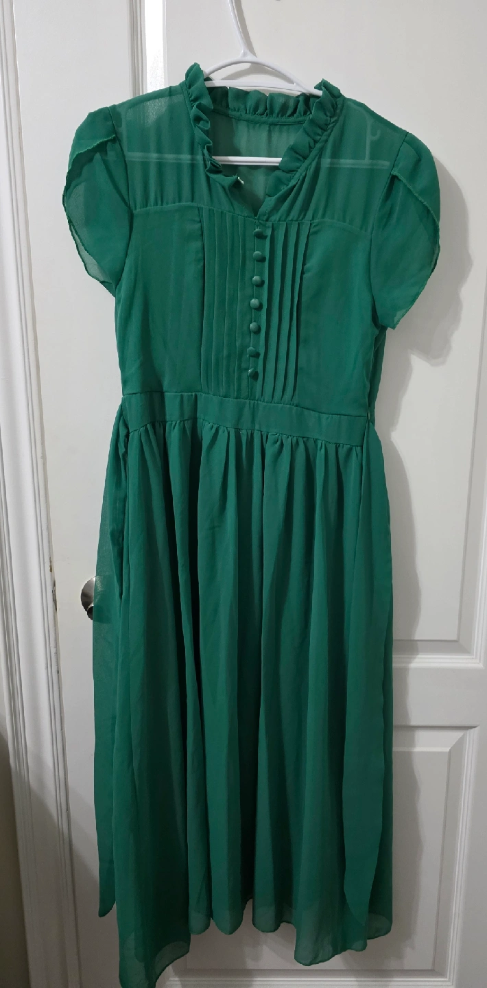 A lovely green chiffon dress! It features a ruffled collar and button-down detailing. Perfect for a special occasion or a stylish everyday look.