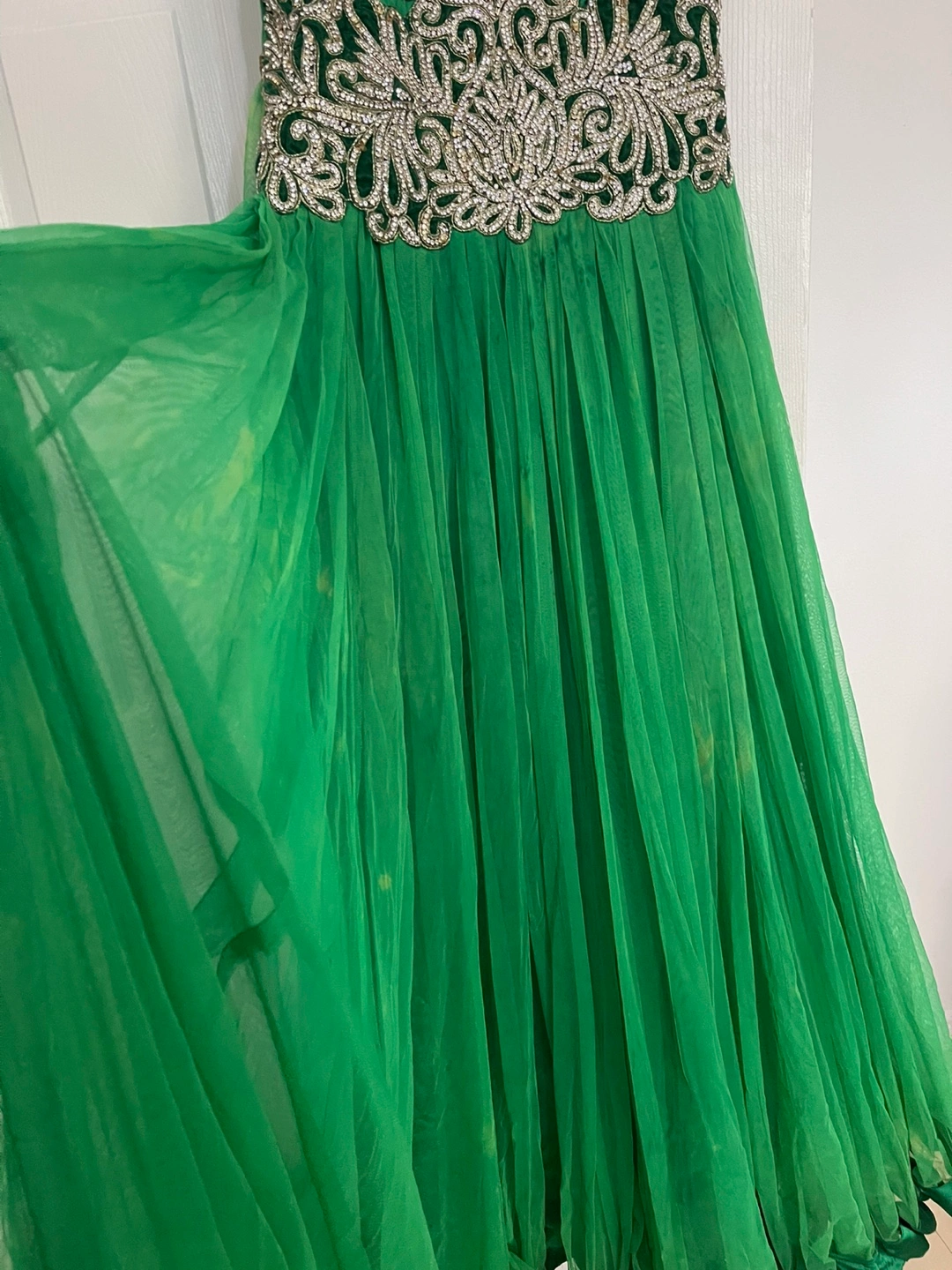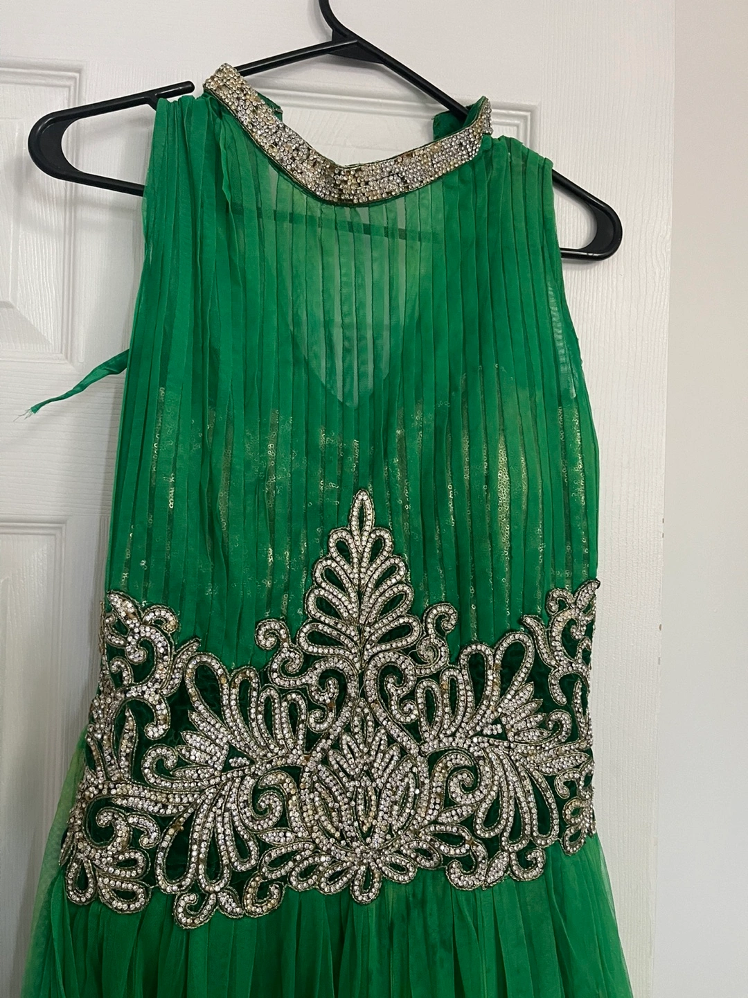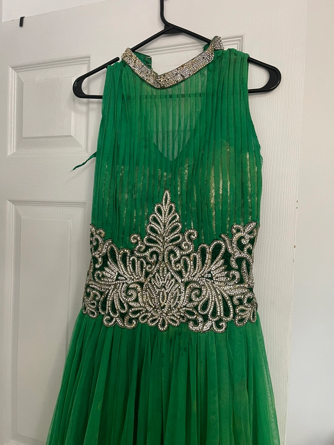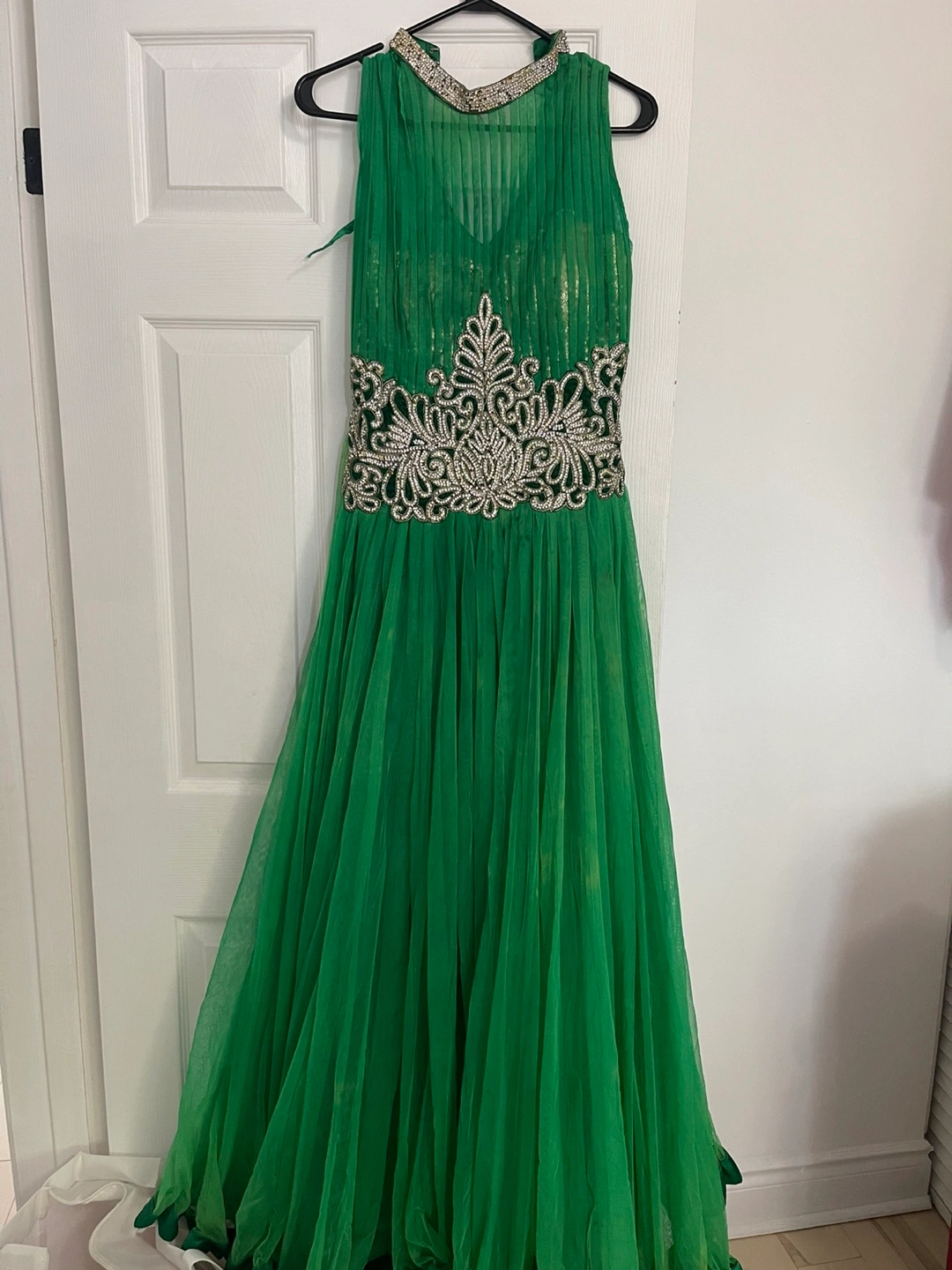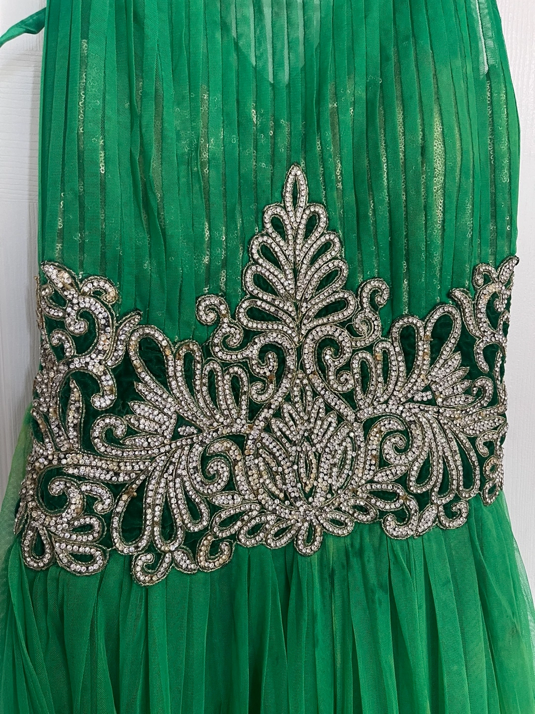 Selling a beautiful green dress with intricate embellishments. It features a pleated bodice and a flowing skirt. Perfect for a special occasion!