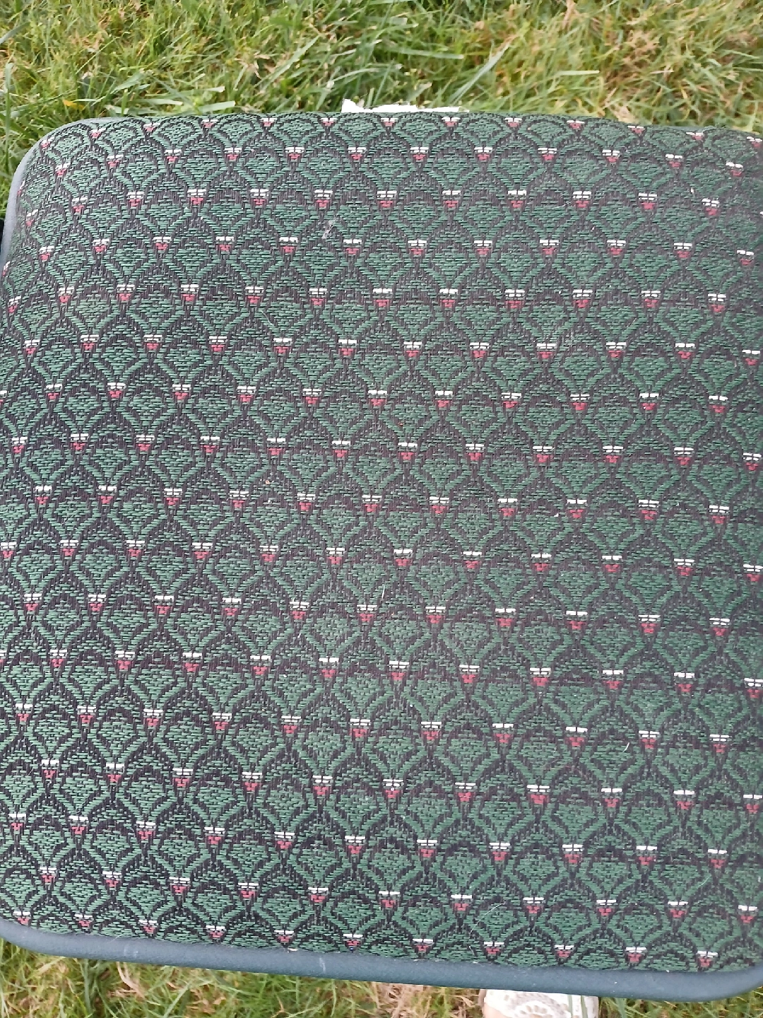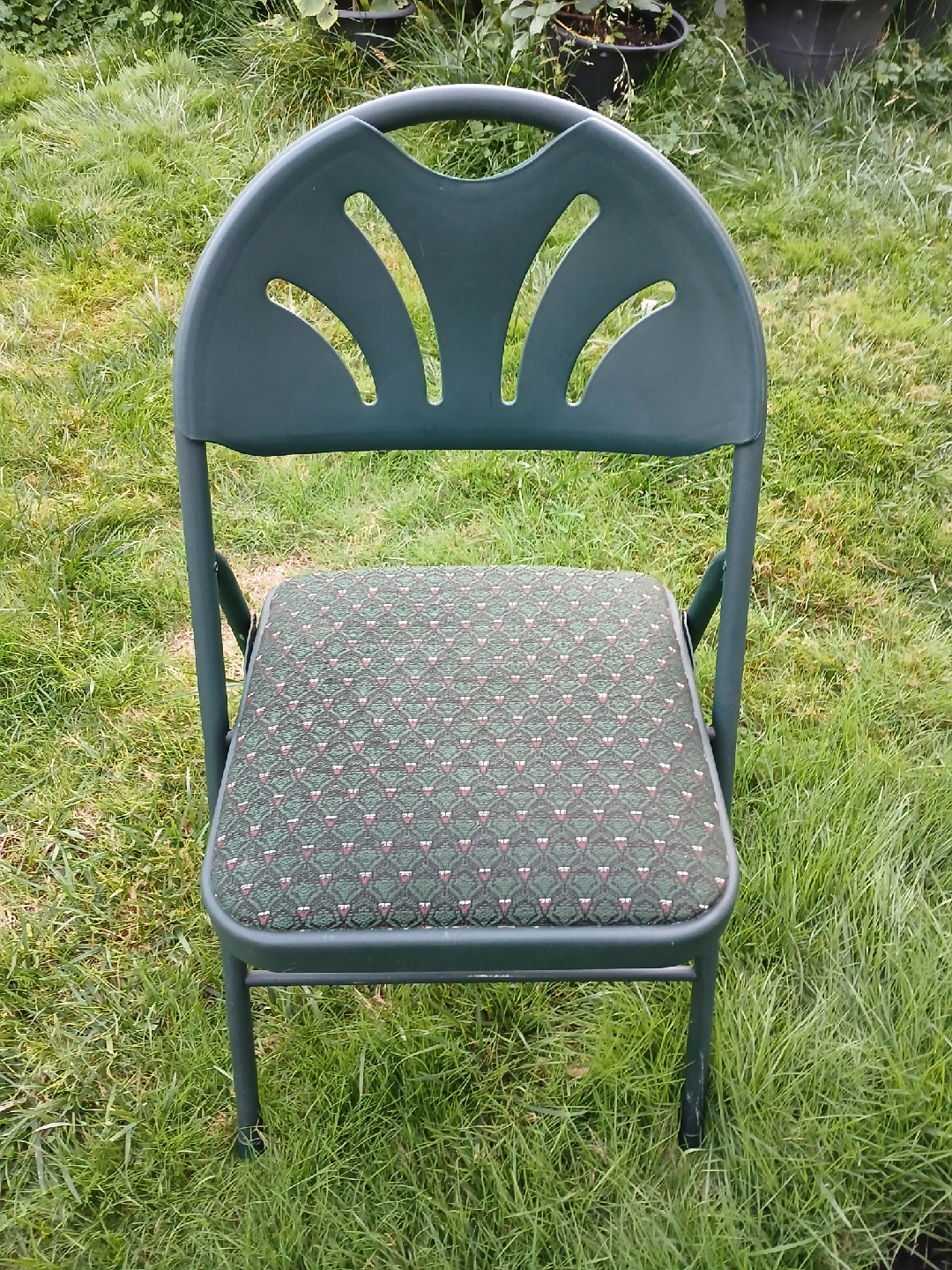 Selling a green folding chair! It's in good condition and has a patterned seat. very sturdy. Folds up easily for convenient storage